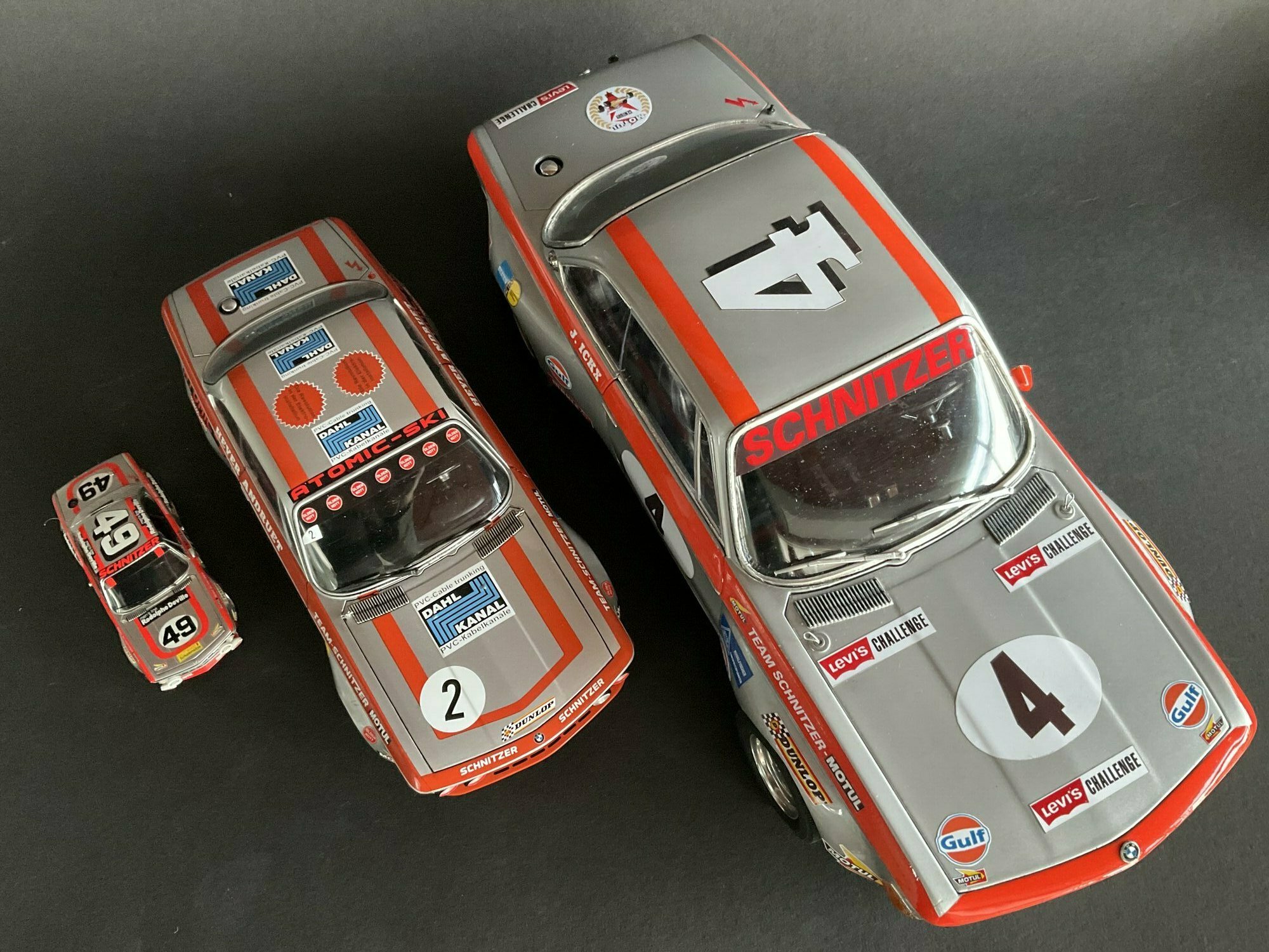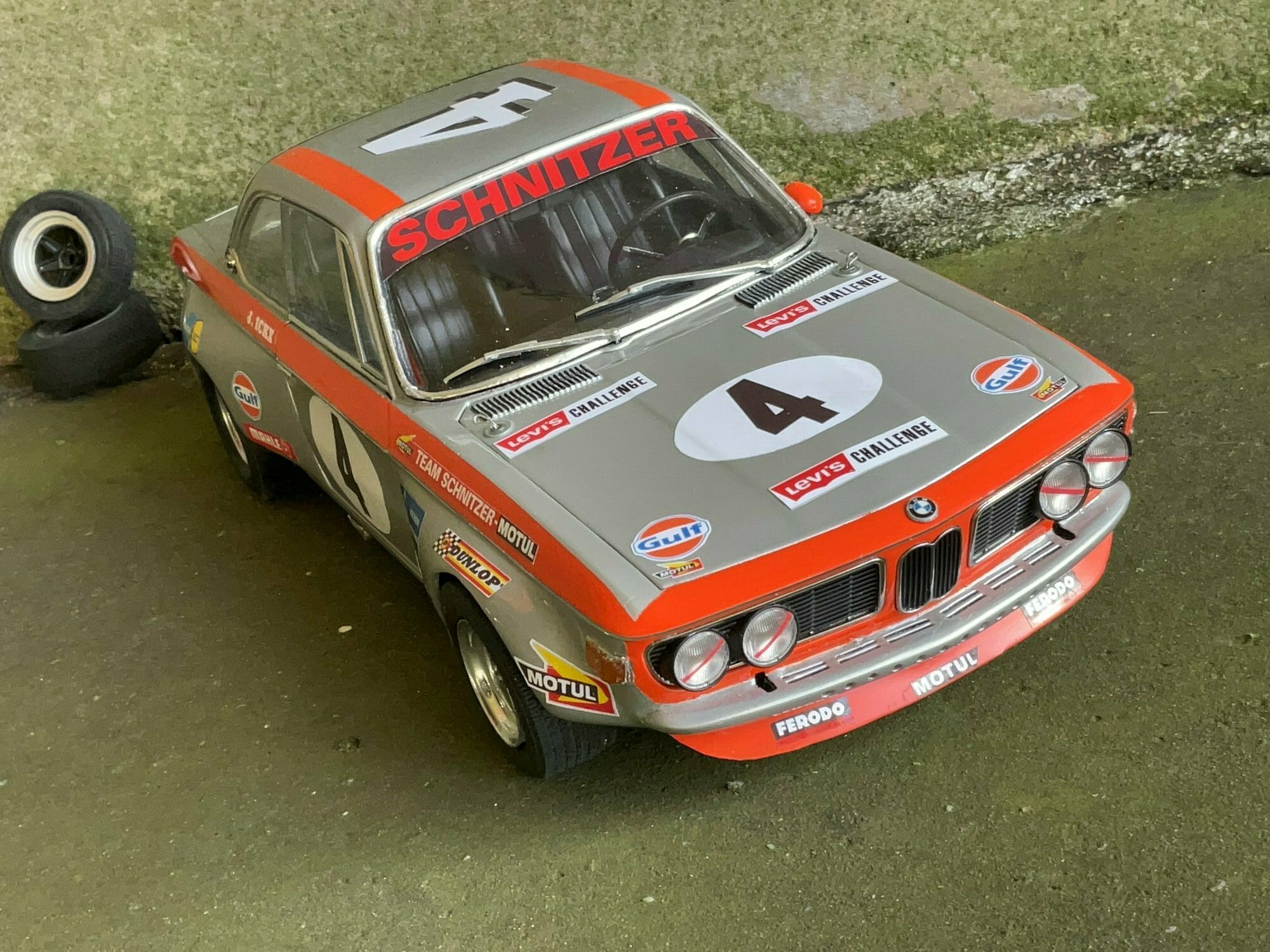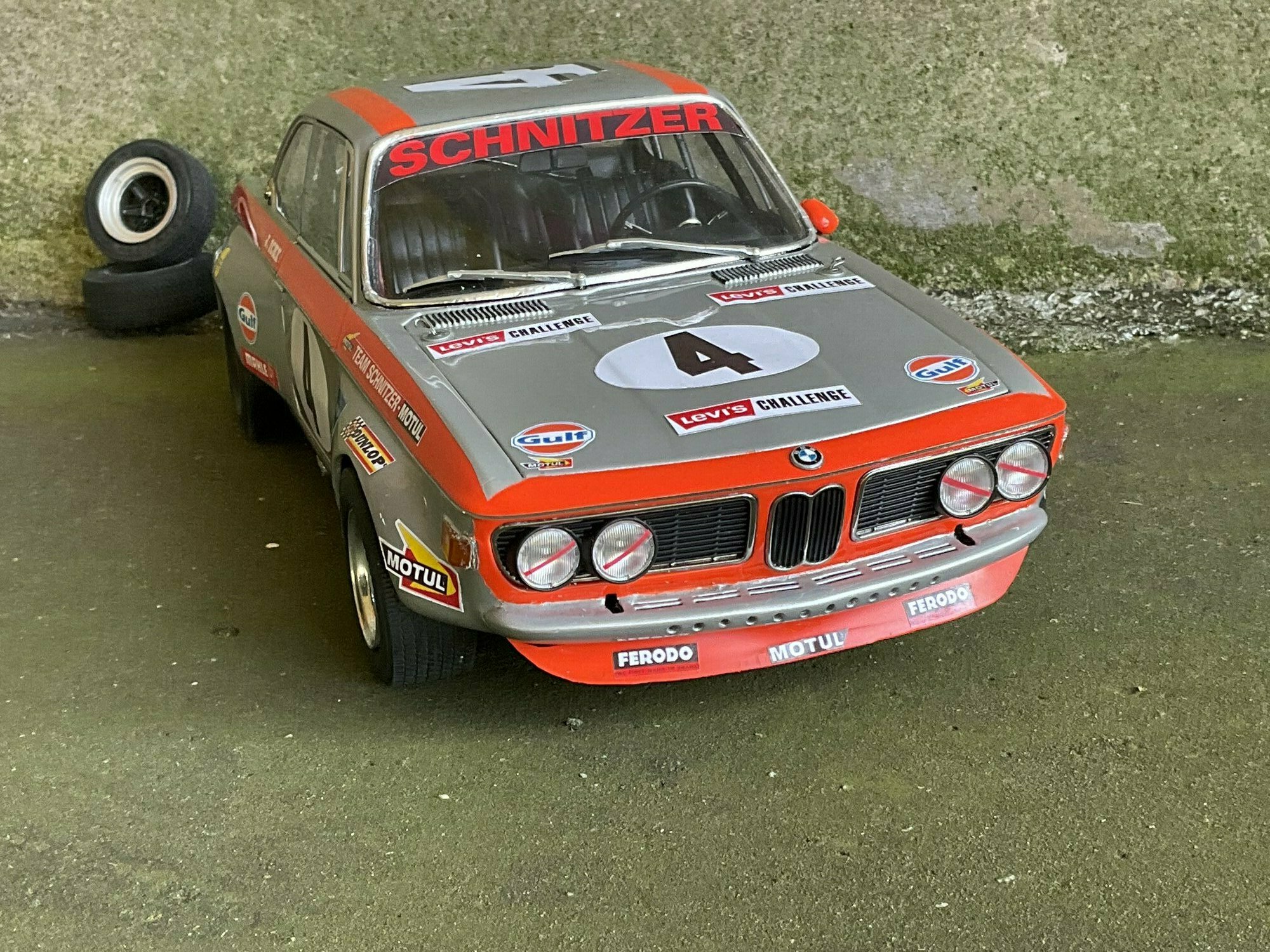 Das hier gezeigte Modellauto im Maßstab 1:12 stammt ursprünglich von KK Scale und besteht aus Druckguss (diecast). Wichtig: Dieses Exemplar ist nachträglich modifiziert und stellt nicht das serienmäßige Produkt von KK Scale dar. Zu erkennen sind Veränderungen an Dekoration und Detaillierung: Die seitlichen Startnummernkreise mit der „4“, die Sonnenblende mit „Schnitzer“-Schriftzug sowie zusätzliche Sponsorenaufkleber entsprechen einer Rennkonfiguration des BMW 2800 CS nach Vorbild von Team Schnitzer. Sichtbar sind Minilite‑ähnliche Felgen, ein tiefer gesetztes Fahrwerk und ein roter Frontspoiler; die fehlenden Stoßstangen unterstreichen die Gruppe‑2-Optik. Die Karosserie ist silbern lackiert, darüber zieht sich eine orangefarbene Zierlinie entlang Front, Seiten und Heck. Auf den Fotos wirkt eine dezente Patinierung mit Staubspuren, was die Rennatmosphäre unterstreicht. Die verglaste Kabine offenbart einen spartanischen Innenraum mit angedeutetem Überrollschutz. Im Maßstab 1:12 (Länge des Vorbilds ca. 4,66 m) ergibt sich für das Modell eine Länge von knapp 39 cm, was die sichtbaren Proportionen des BMW 2800 CS gut nachvollziehbar macht. Dieses Modellauto von KK Scale ist also die Basis; das gezeigte Exemplar aus der Sammlung des Modelly‑Mitglieds „TrolleyJack“ wurde jedoch individuell überarbeitet und entspricht nicht dem ab Werk angebotenen Zustand.