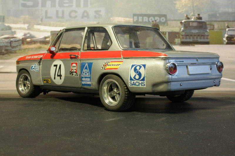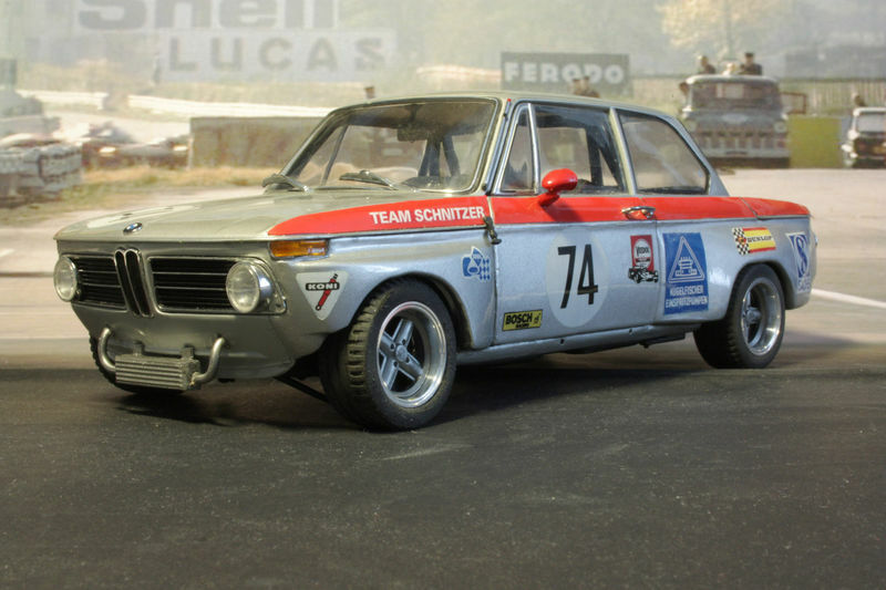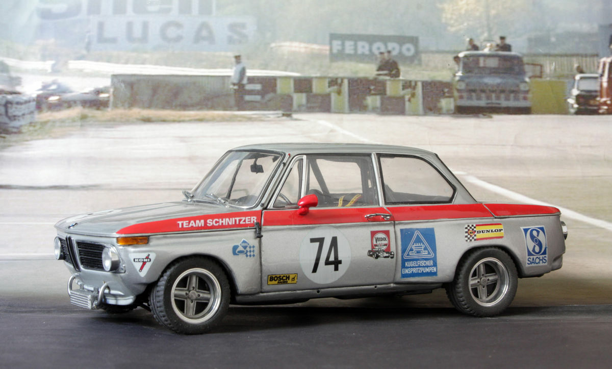 Die Lackierung des Modells ist eine präzise Nachbildung der originalen Rennfahrzeug-Lackierung. Die Kombination aus Silber und der roten Linie, die über die gesamte Länge des Fahrzeugs verläuft, ist charakteristisch für das Team Schnitzer. Auf den Seiten finden sich verschiedene Logos von Sponsoren wie Dunlop, Bosch und Kugelfischer, die das Erscheinungsbild des Modells authentisch und realistisch machen. Die Nummer 74, auf den Türen angebracht, rundet das Design ab und verweist auf die Renngeschichte des Fahrzeugs.