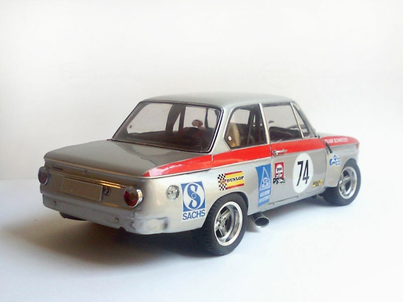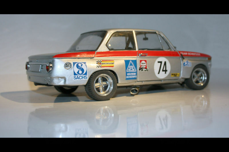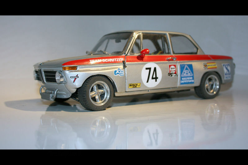 Das hier gezeigte Modellauto von Kyosho ist im Maßstab 1:18 gefertigt und stellt eine modifizierte Version des BMW 2002 Schnitzer dar. Wichtig ist zu betonen, dass dies ein individuell angepasstes Modell ist, das nicht das ursprünglich von Kyosho produzierte Produkt darstellt. Das Modell, das im Besitz des Modelly-Mitglieds "TrolleyJack" ist, zeigt eine große Detailliertheit und verschiedene individuelle Anpassungen, die es von handelsüblichen Modellen abheben. Auf den Bildern sind neben der typischen Schnitzer-Lackierung auch verschiedene Sponsorenaufkleber wie Veedol und Sachs zu erkennen, die das Modell weiter aufwerten.