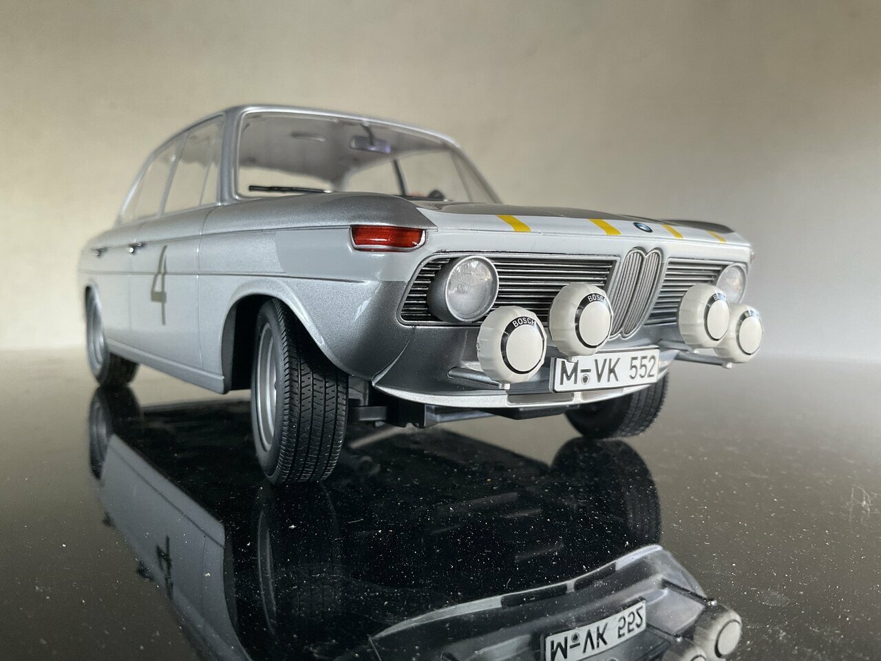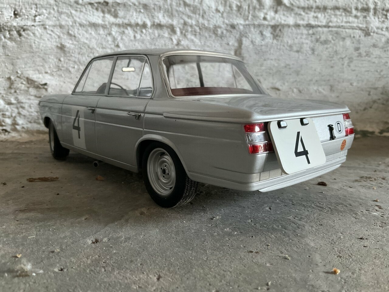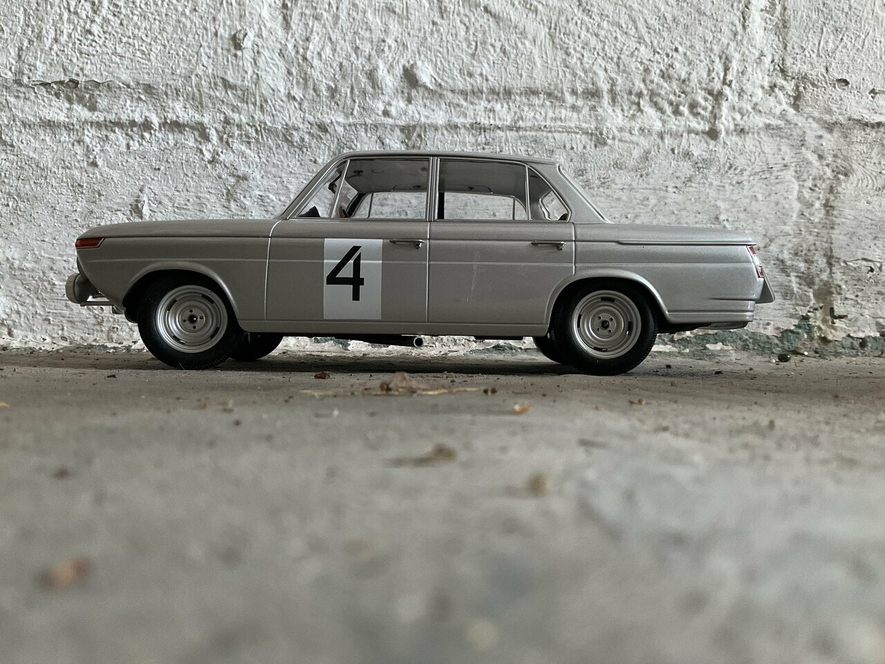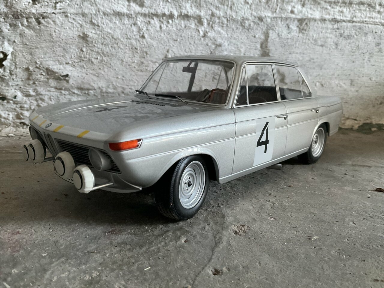 Das Modellauto des BMW 1800 TI besticht durch seine silberne Lackierung und die detailreiche Darstellung der Fahrzeugnummer 4 auf den Türen. An der Front befinden sich auffällige Scheinwerfer, die dem Modell einen sportlichen Look verleihen. Der Kühlergrill und die zusätzlichen Rallye-Scheinwerfer sind präzise nachgebildet. Auf der Motorhaube sind einige Sponsorenaufkleber zu erkennen, darunter Shell und Castrol. Dies verleiht dem Modell eine zusätzliche Authentizität. Ebenfalls bemerkenswert ist die korrekte Wiedergabe der Radnaben und Reifen, die das Gesamtbild des Fahrzeugs abrunden. Als Teil der Sammlung von Modelly-Mitglied "TrolleyJack" ist dieses Modell ein echtes Highlight für Sammler und Liebhaber klassischer Rennwagen.
