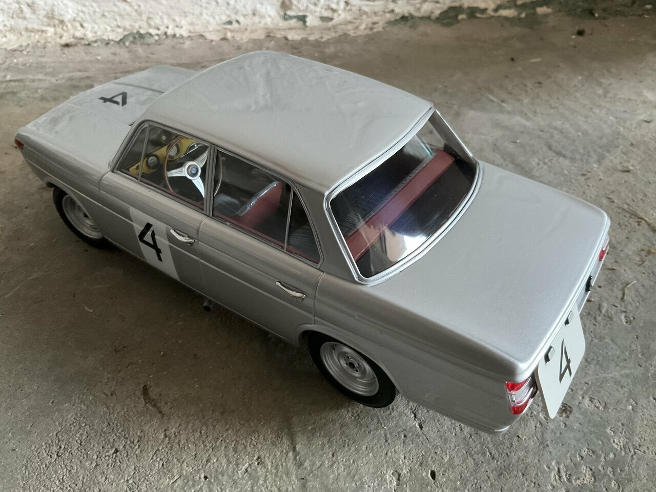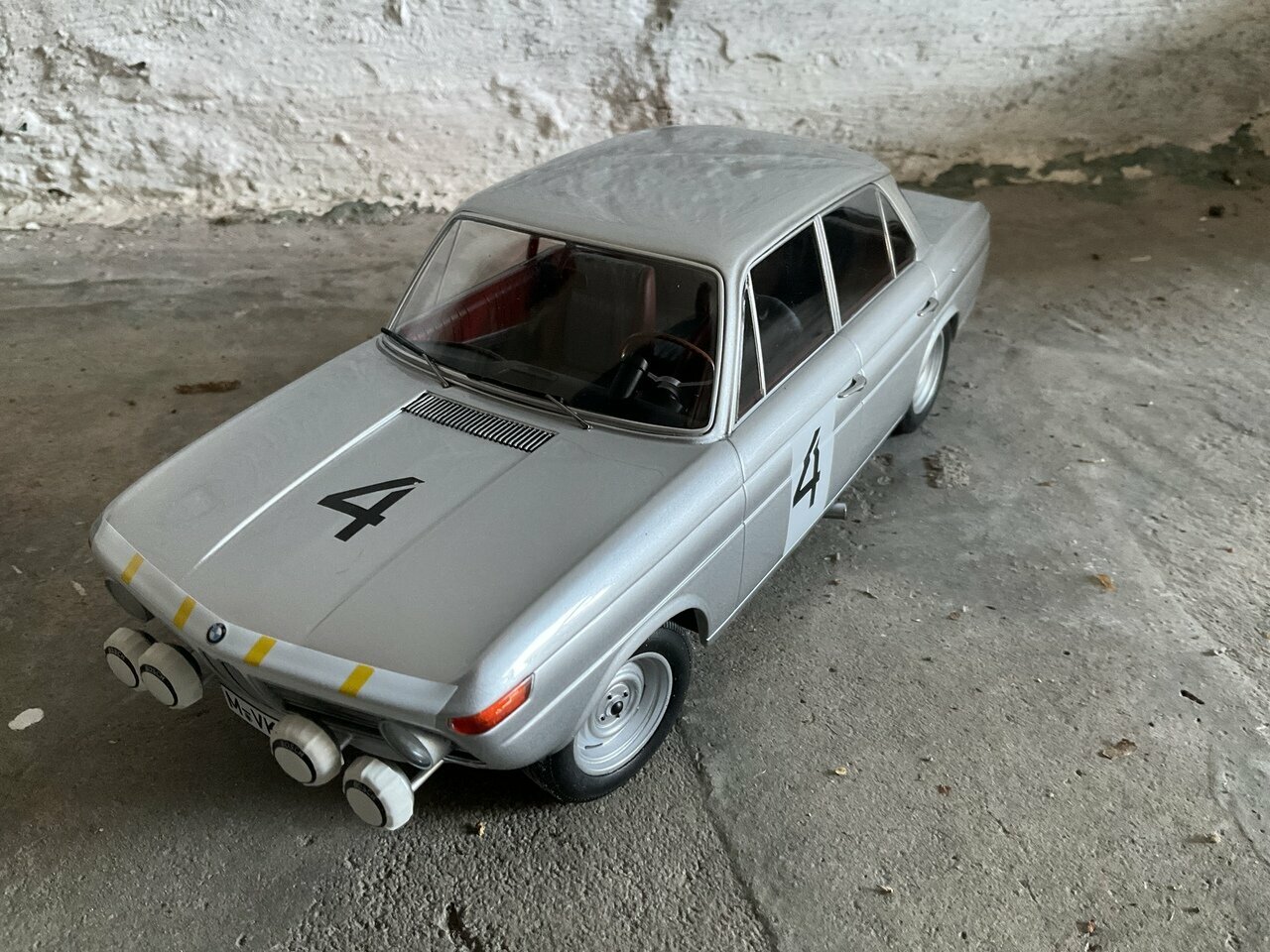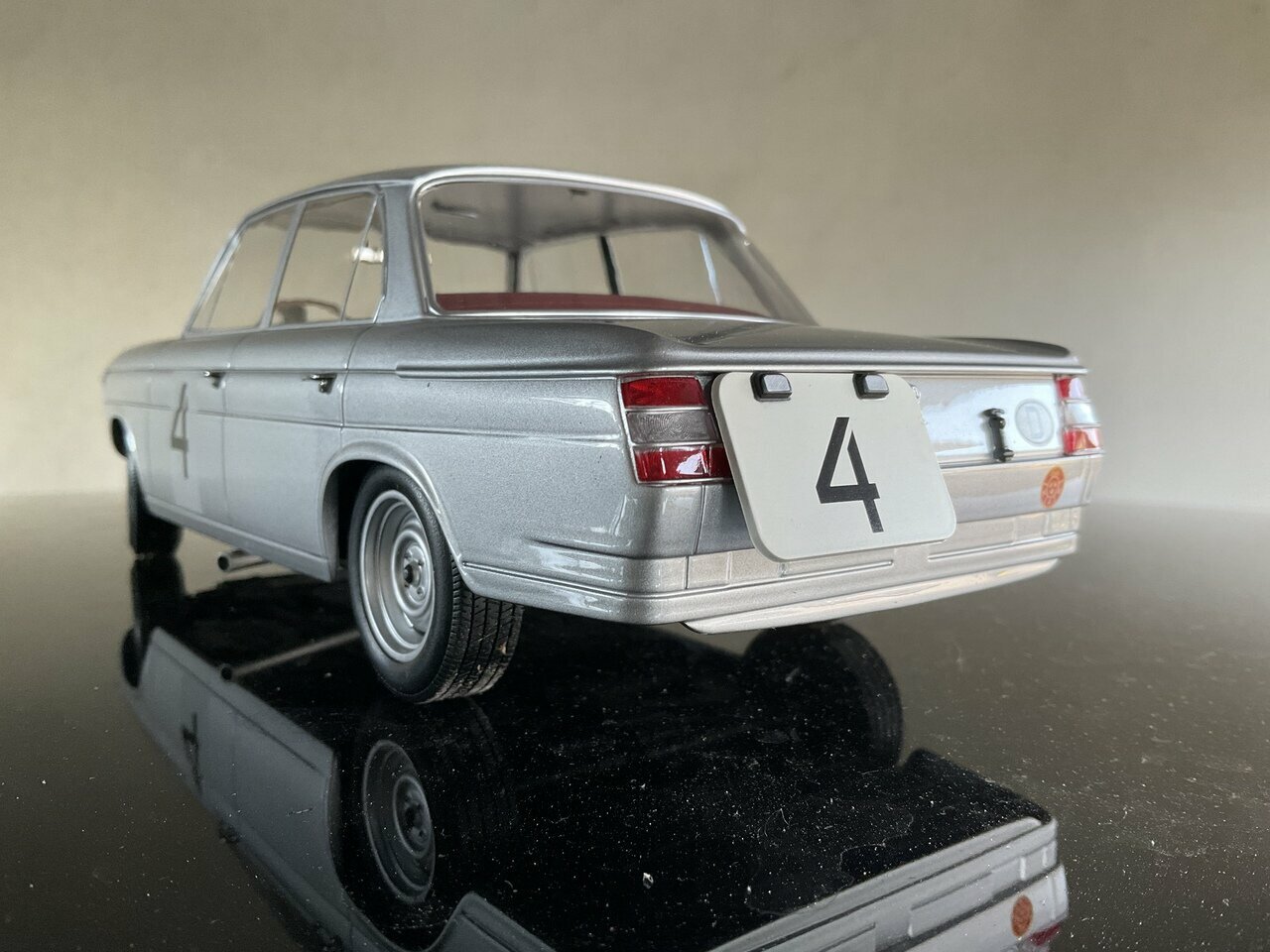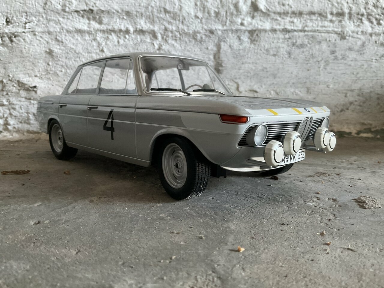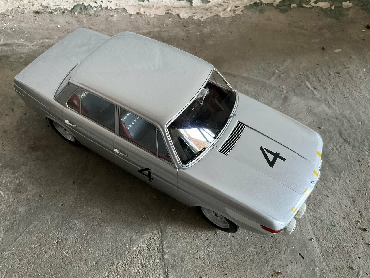 Das Modellauto des BMW 1800 TI besticht durch seine silberne Lackierung und die detailreiche Darstellung der Fahrzeugnummer 4 auf den Türen. An der Front befinden sich auffällige Scheinwerfer, die dem Modell einen sportlichen Look verleihen. Der Kühlergrill und die zusätzlichen Rallye-Scheinwerfer sind präzise nachgebildet. Auf der Motorhaube sind einige Sponsorenaufkleber zu erkennen, darunter Shell und Castrol. Dies verleiht dem Modell eine zusätzliche Authentizität. Ebenfalls bemerkenswert ist die korrekte Wiedergabe der Radnaben und Reifen, die das Gesamtbild des Fahrzeugs abrunden. Als Teil der Sammlung von Modelly-Mitglied "TrolleyJack" ist dieses Modell ein echtes Highlight für Sammler und Liebhaber klassischer Rennwagen.