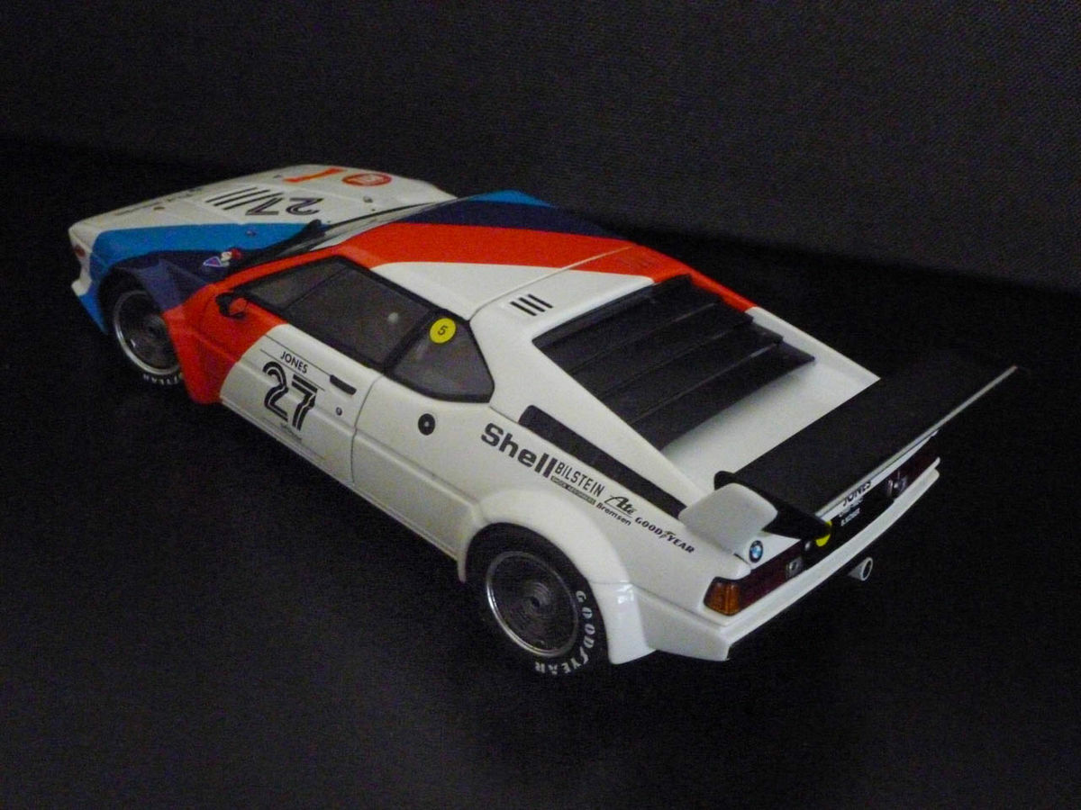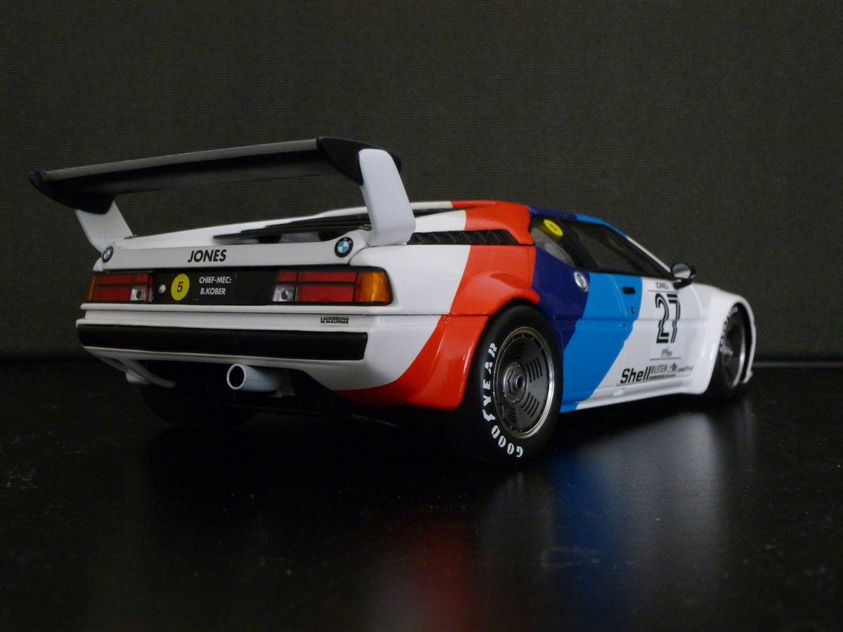 Das Modell im Maßstab 1:18, hergestellt von Minichamps, wurde basierend auf dem Material Diecast konstruiert und detailgetreu nachgebildet. Es stellt das berühmte Fahrzeug mit der Nummer 27 dar, das einst von Alan Jones gefahren wurde. Auffällig sind die Farbakzente des Modells in Weiß, Blau und Rot, die das charakteristische BMW M Motorsport-Design widerspiegeln. Das Modell überzeugt durch exakte Nachbildung der Sponsorenaufkleber wie Shell, Bilstein, und Goodyear, die die Karosserie zieren und dem Modell einen authentischen Touch verleihen.