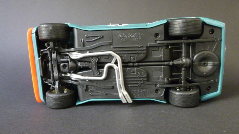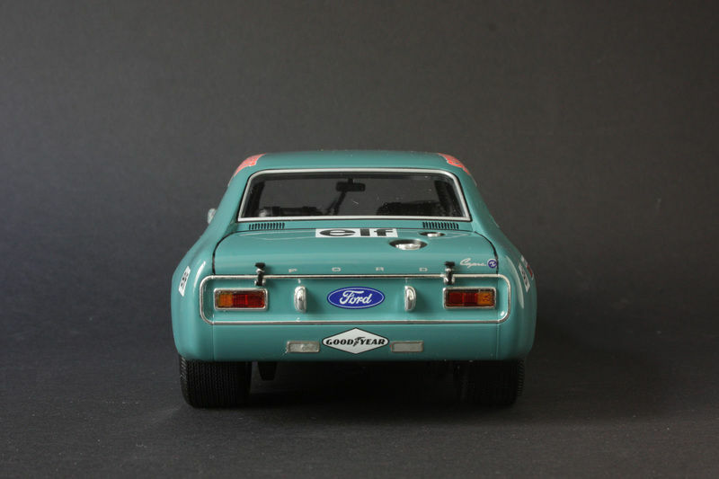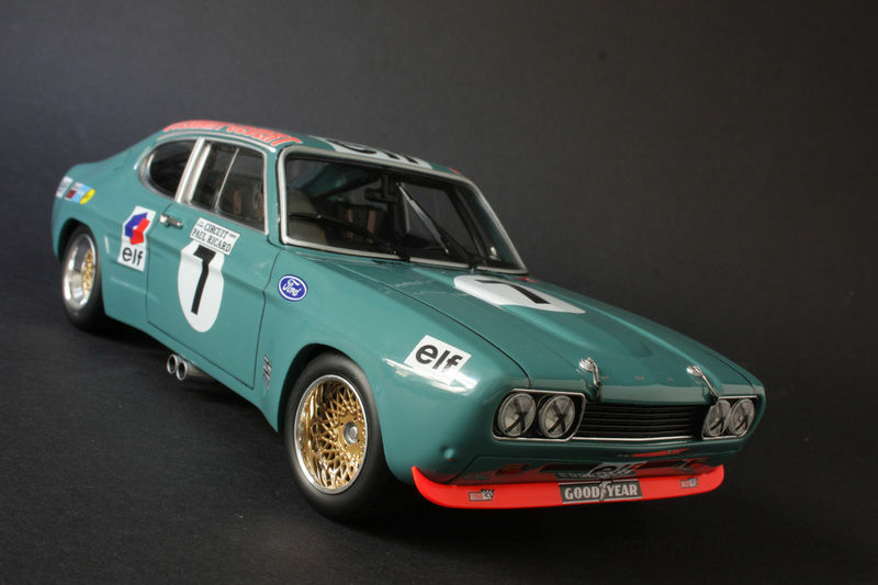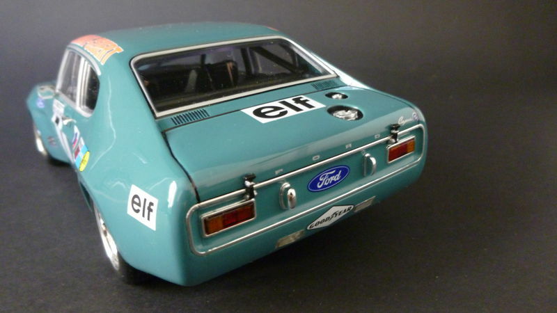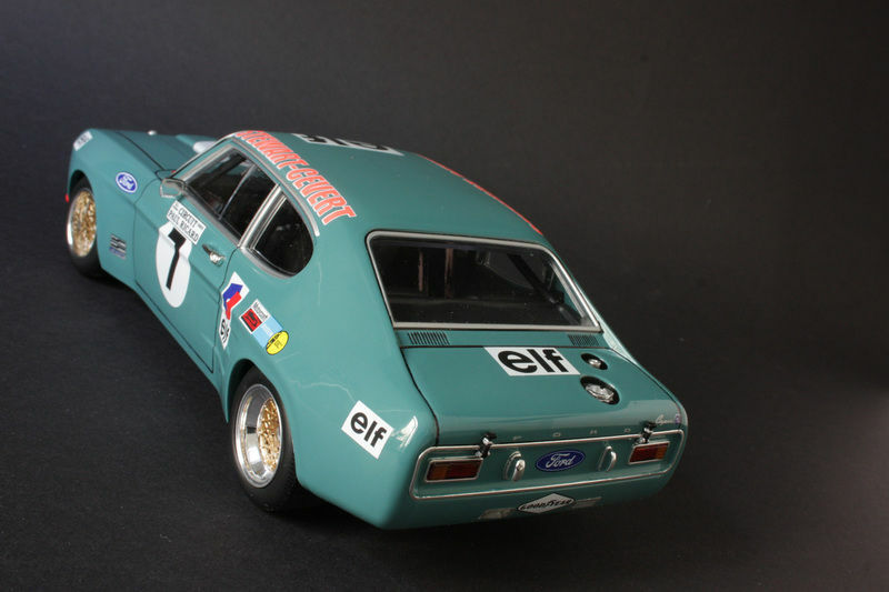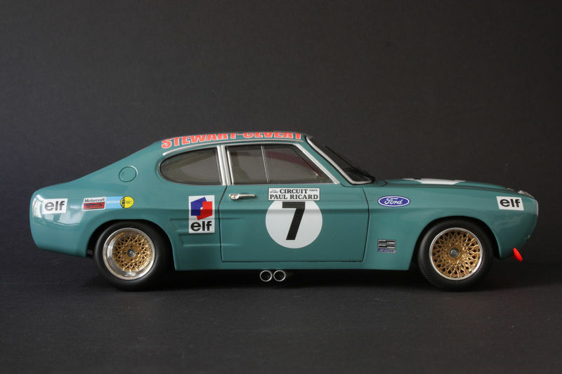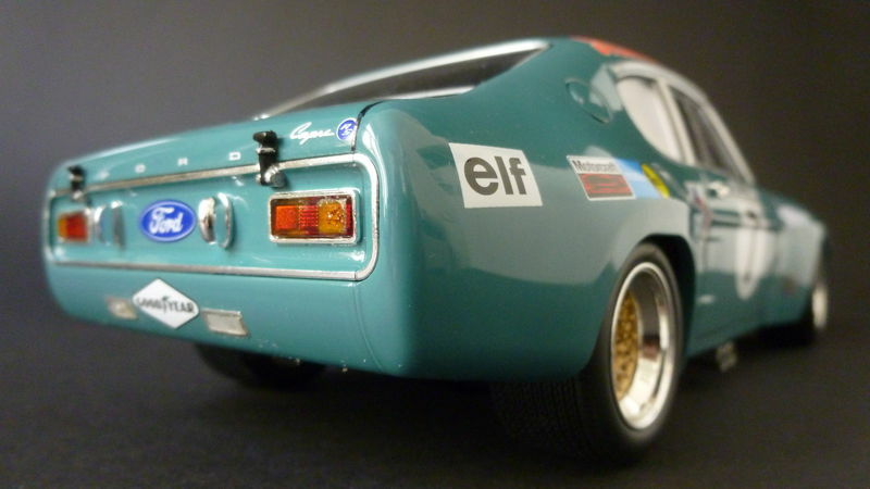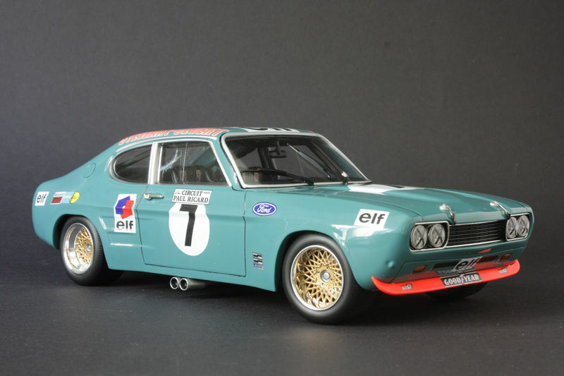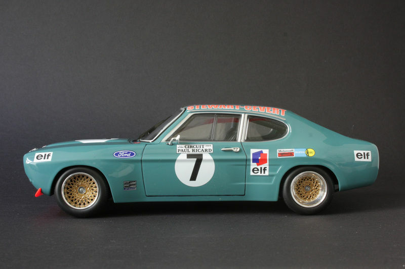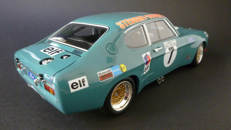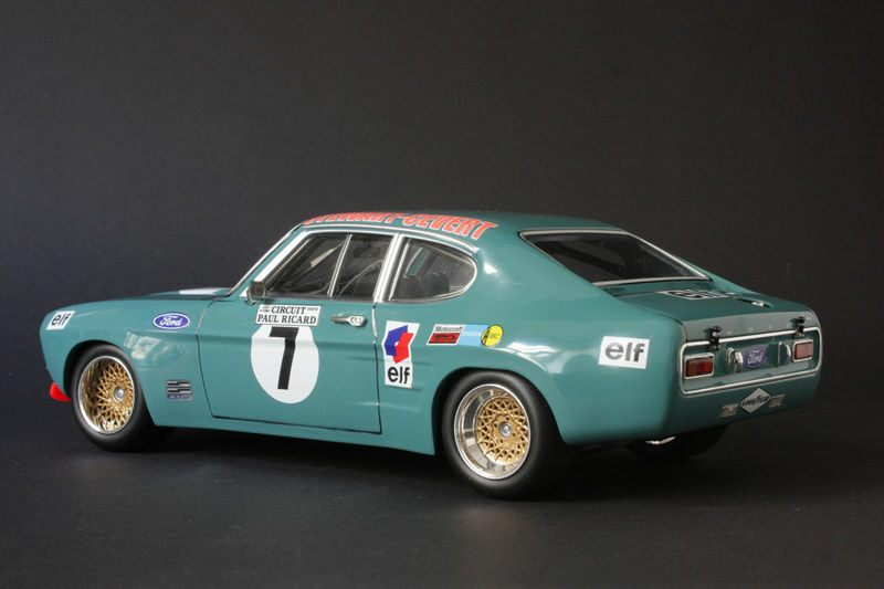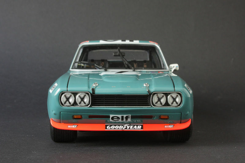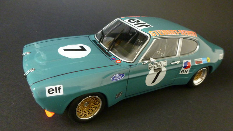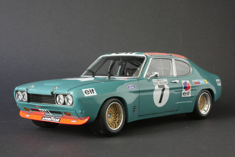 Der Ford Capri RS 2600 Gr.2 war nicht nur technisch beeindruckend, sondern sah auch großartig aus. Die spezielle Rennlackierung, wie sie auf dem Modell zu sehen ist, beinhaltet das markante "elf" Logo und verschiedene Sponsorenaufkleber wie Goodyear und Motorsport. Die Farbgebung in Türkis mit weißen Akzenten betonte die sportliche Erscheinung des Wagens. Auch das Nummernschild „Circuit Paul Ricard“ und andere Details trugen zur Originalität und Authentizität bei. Im Cockpit sorgten Rennsitze, Gurte und ein Überrollkäfig für die nötige Sicherheit und betonten den Wettbewerbscharakter des Fahrzeugs.