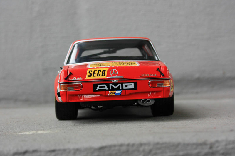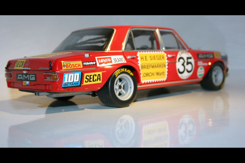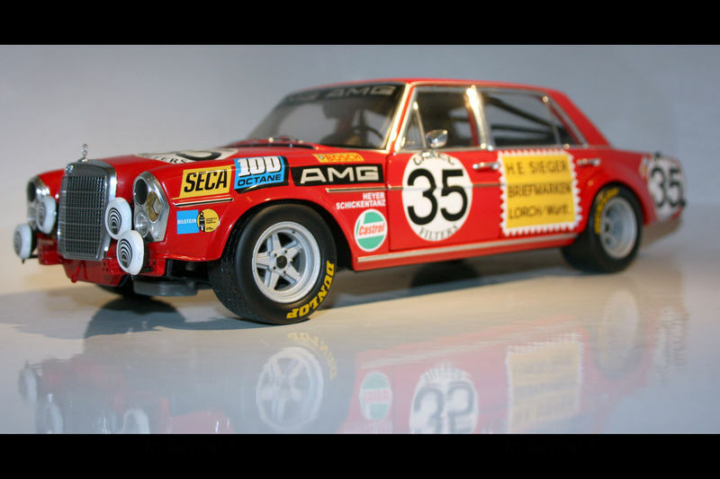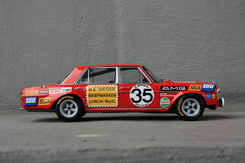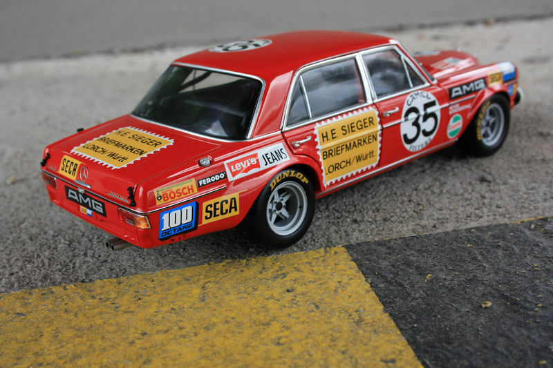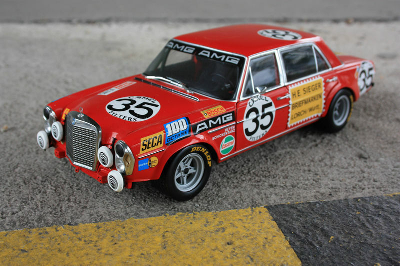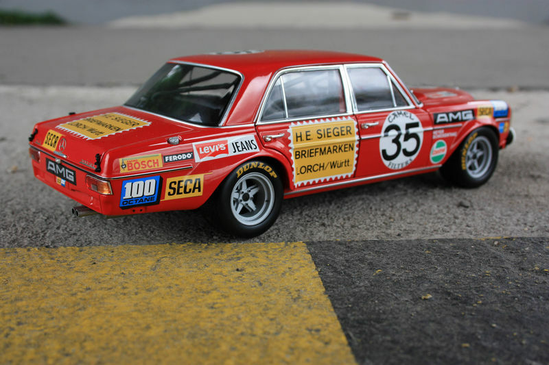 Die rote Lackierung des Modellautos ist ein Unikat und sticht sofort ins Auge. Das Fahrzeug ist mit diversen Abzeichen und Aufklebern versehen, die akribisch im Detail gestaltet und positionsgetreu angebracht sind. Der riesige AMG-Schriftzug über der Windschutzscheibe symbolisiert den Tuning-Bereich des Wagens, während die Nummer 35 prominent an den Fahrzeugtüren hervorsticht. Jeder Aspekt des Modellautos zeigt die Leidenschaft und das Fachwissen von Minichamps. Unterschiedliche Farbakzente wie die chromfarbenen Auspuffrohre und die silbernen Felgen runden das Gesamtbild des Modells ab. Modelly-Mitglied "TrolleyJack" kann sich damit über ein wirklich außergewöhnliches Sammlerstück freuen, das sowohl historischen Wert als auch perfekte Detailtreue besitzt.