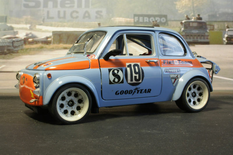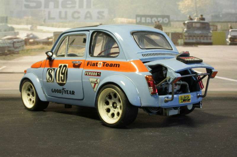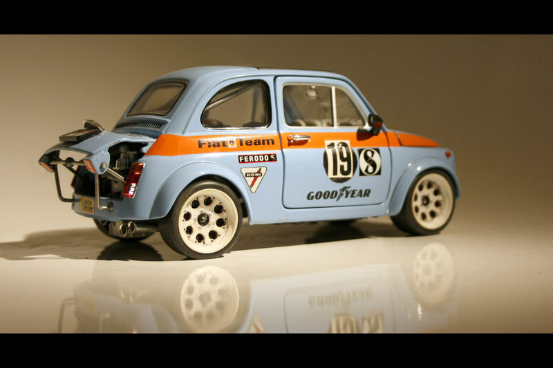 Das Miniaturmodell aus der Sammlung des Modelly-Mitglieds "TrolleyJack" besitzt eine auffällige Lackierung in Hellblau mit orangenen Streifen. An den Seiten prangen Sponsorenaufkleber von Goodyear, Ferodo und Fiat Team. Dies verleiht dem Fahrzeug ein authentisches Rennwagen-Aussehen. Besonders auffallend sind die breiten Radkästen und die detaillierten Felgen, die das Modell sehr realistisch wirken lassen. Auch der geöffnete Motorraum und die fein ausgearbeiteten Lüftungsschlitze am Heck sind wahre Hingucker.