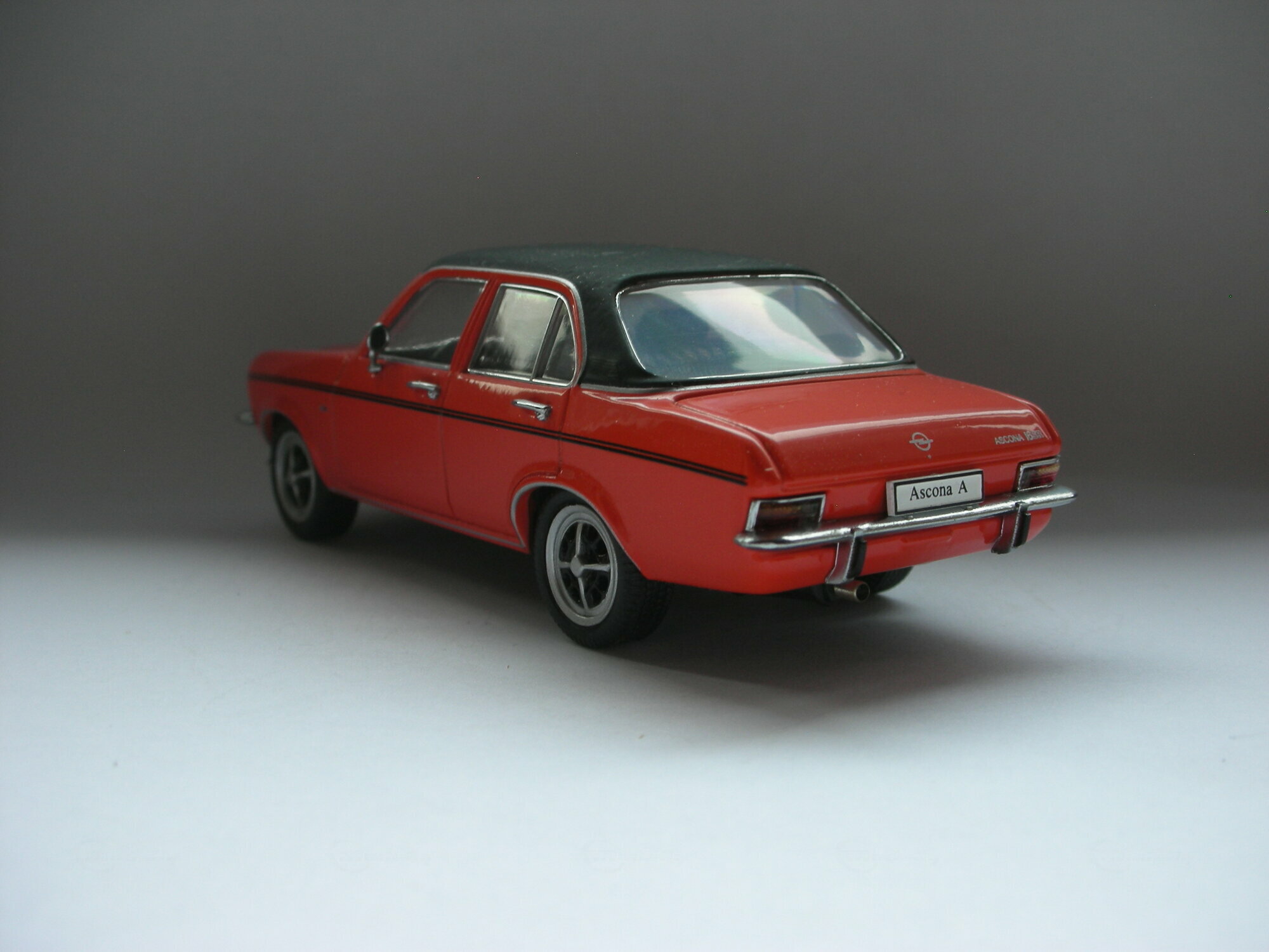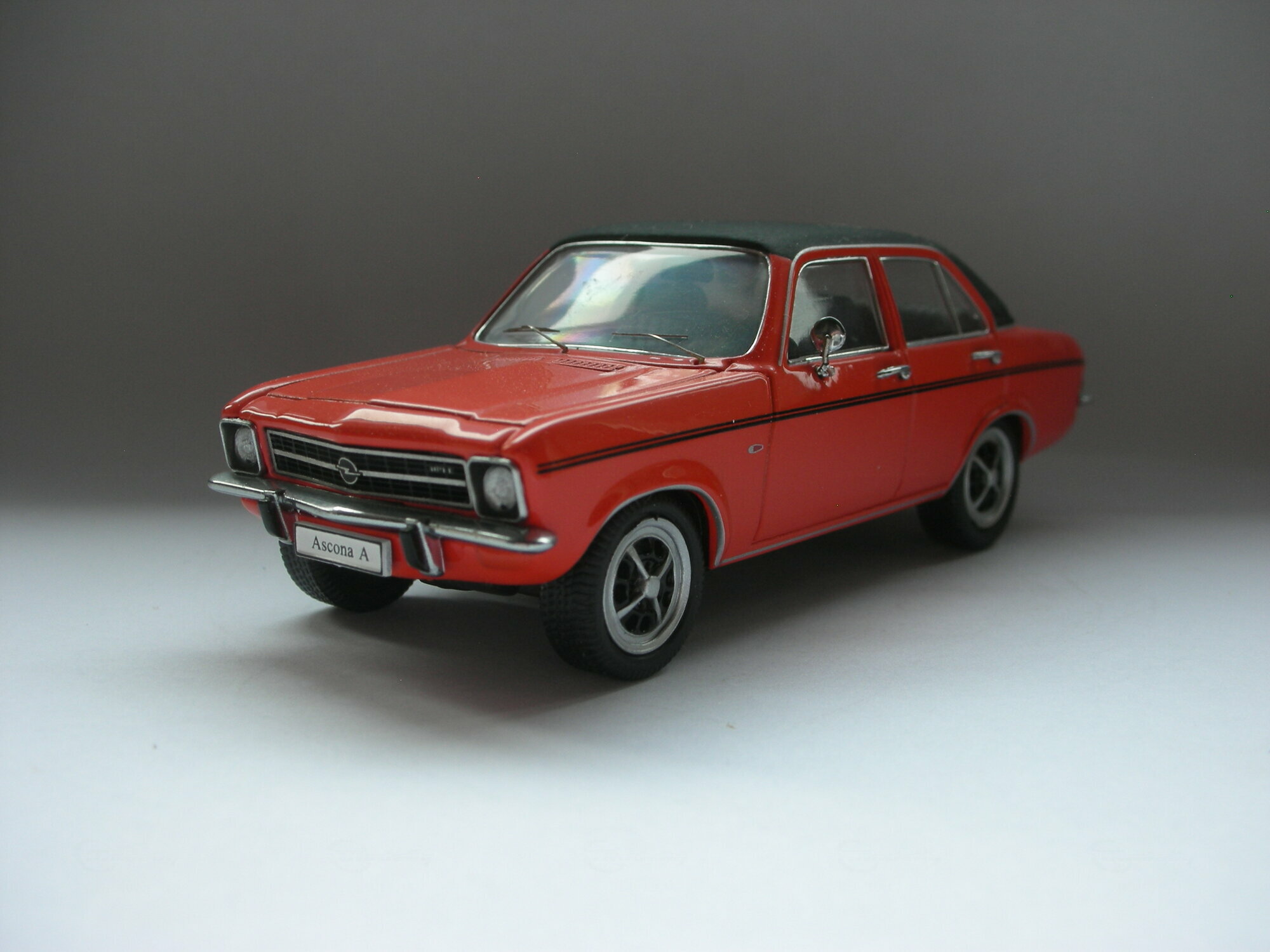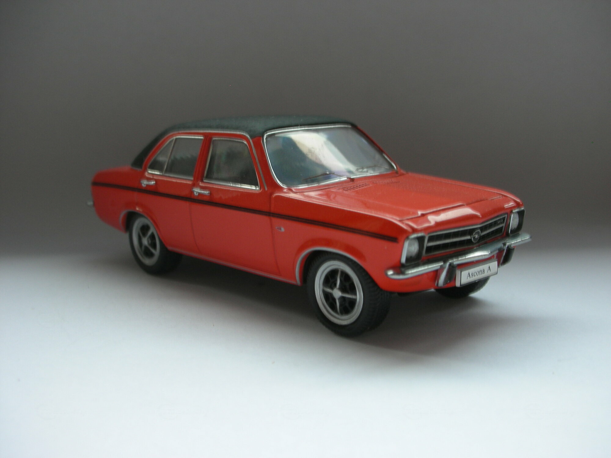 Das gezeigte Modellauto im 1:43 Maßstab wurde von Schuco hergestellt und gehört zur Sammlung des Modelly-Mitglieds „TrolleyJack“. Es handelt sich um eine hochwertige Nachbildung des Opel Ascona A, die aus Diecast-Material gefertigt wurde. Das Modell ist besonders detailliert und zeichnet sich durch seine originalgetreue Lackierung und Beschriftung aus. Zu den sichtbaren Merkmalen auf den Fotos zählen die roten Karosseriefarben mit einem schwarzen Dach und schwarzen Zierstreifen entlang der Seiten. Die Räder des Modells sind ebenfalls detailliert nachgebildet, wobei das Design der Felgen präzise dem des Originals entspricht. Selbst kleine Details wie die spiegelnden Fensterscheiben und die verchromten Stoßfänger sind perfekt wiedergegeben.