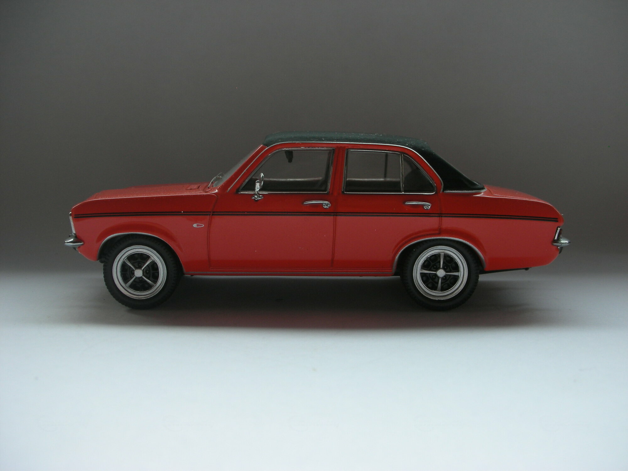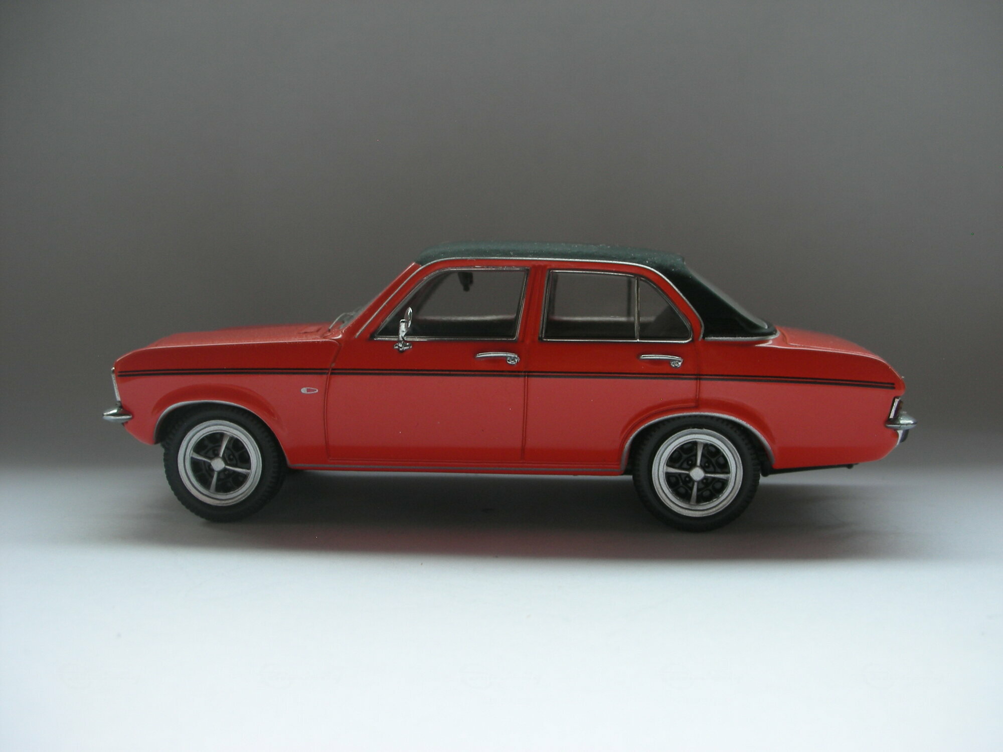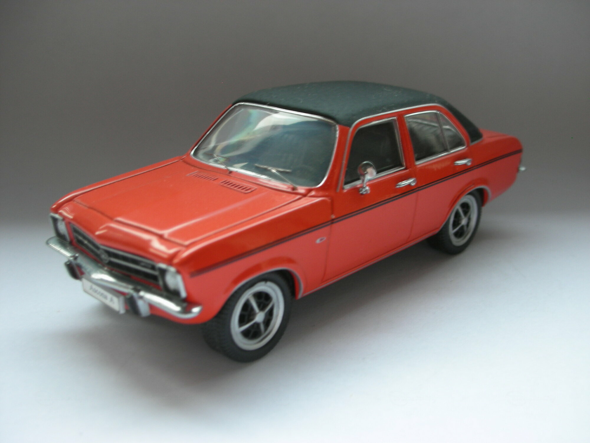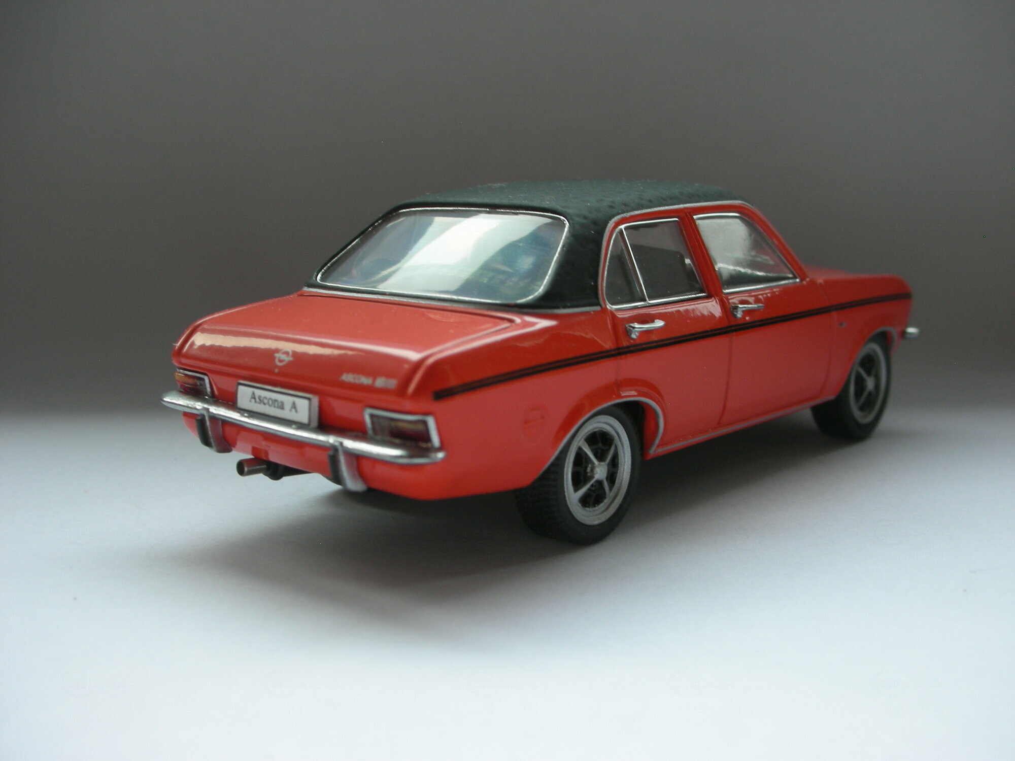 Das gezeigte Modellauto im 1:43 Maßstab wurde von Schuco hergestellt und gehört zur Sammlung des Modelly-Mitglieds „TrolleyJack“. Es handelt sich um eine hochwertige Nachbildung des Opel Ascona A, die aus Diecast-Material gefertigt wurde. Das Modell ist besonders detailliert und zeichnet sich durch seine originalgetreue Lackierung und Beschriftung aus. Zu den sichtbaren Merkmalen auf den Fotos zählen die roten Karosseriefarben mit einem schwarzen Dach und schwarzen Zierstreifen entlang der Seiten. Die Räder des Modells sind ebenfalls detailliert nachgebildet, wobei das Design der Felgen präzise dem des Originals entspricht. Selbst kleine Details wie die spiegelnden Fensterscheiben und die verchromten Stoßfänger sind perfekt wiedergegeben.