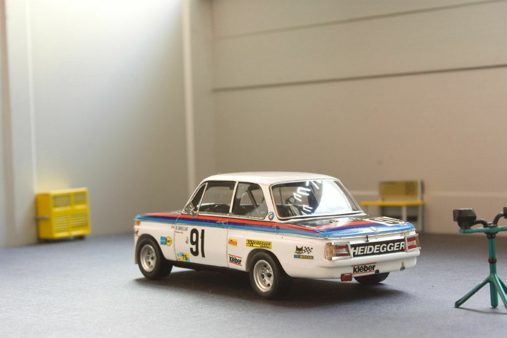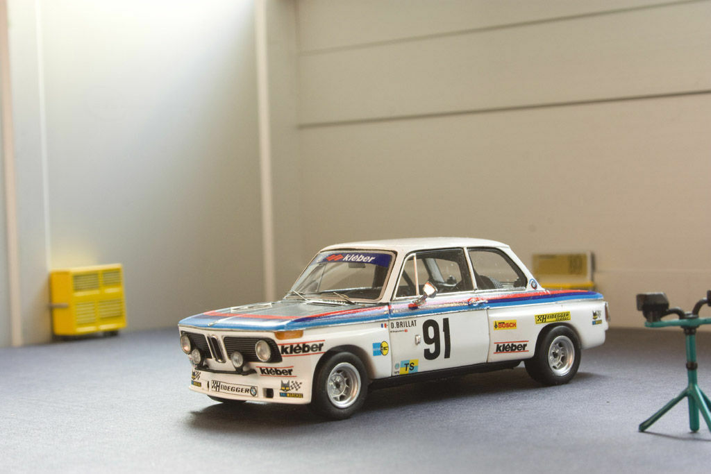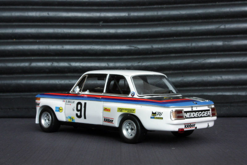Das Miniaturmodell von SPARK zeigt eine motorsportbezogene Lackierung, die aus weißem Grundton und den typischen BMW-Motorsport-Streifen besteht. Die Logos der Sponsoren, darunter Kleber, Bosch und Heidegger, sind deutlich sichtbar und wurden auf den Türen, der Motorhaube und dem Heck angebracht. Die Startnummer "91" sowie der Fahrername "D. Brillat" verweisen auf die Rennhistorie dieses Fahrzeugs. Das Modell hebt diese Details präzise hervor und bietet Sammlern eine realistische Darstellung des Originals.
