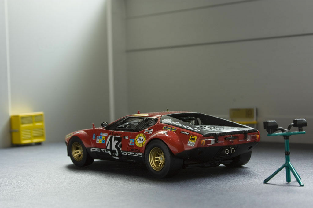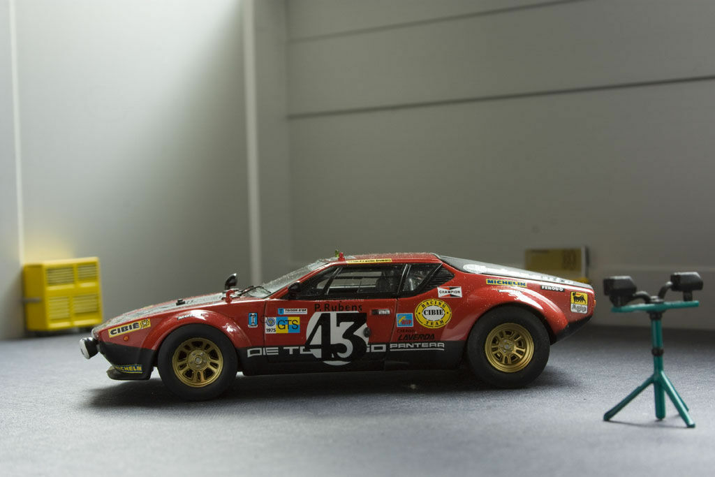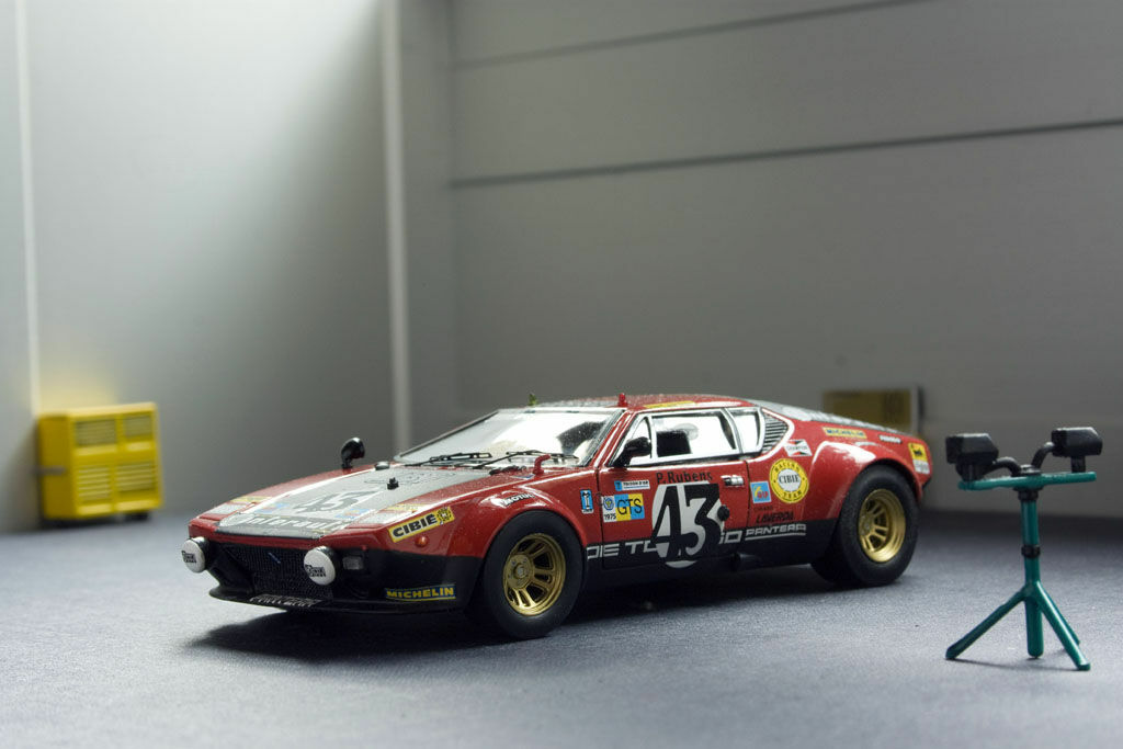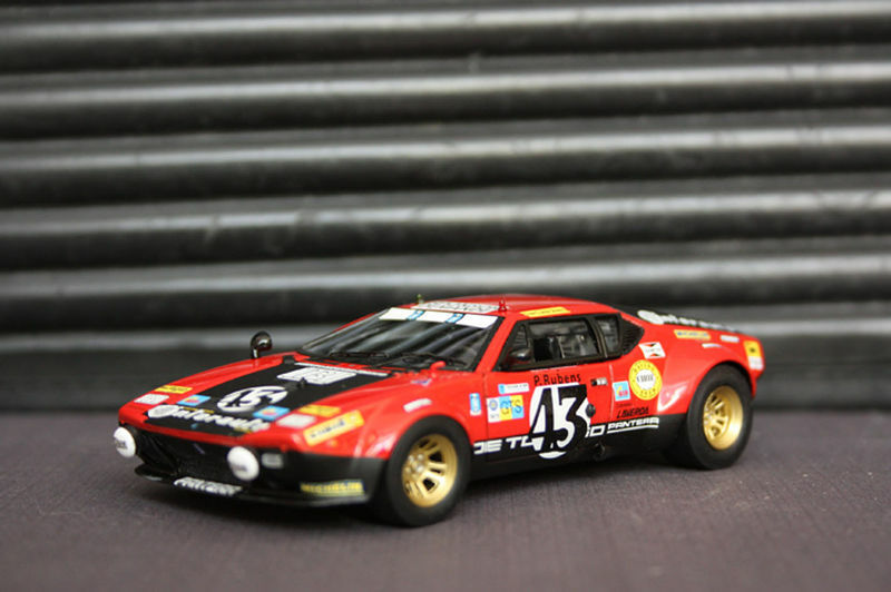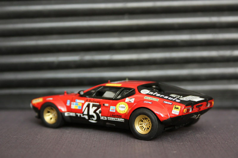 Das Modell-Dekor ist sehr auffällig und authentisch. Der DeTomaso Pantera im Maßstab 1:43 ist in einem kräftigen Rot lackiert, welches von der schwarzen Motorabdeckung und den goldenen Felgen kontrastiert wird. Jedes Detail des Originals wurde auf diesem Modell von SPARK akribisch nachgebildet: die Rennstreifen, die Sponsorenaufkleber und die Startnummer 43, die auf die Rennhistorie des Wagens hinweisen. Die aufgeklebten Zierleisten und Spiegel sind perfekt proportioniert, und die Scheinwerfer sind detailgetreu wiedergegeben, was das Modell zu einem authentischen Sammlerstück macht. Auch die Front- und Heckpartie wurden originalgetreu gestaltet und zeigen die typischen Merkmale des DeTomaso Pantera.