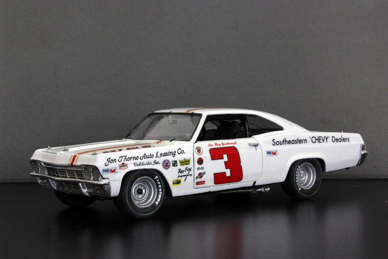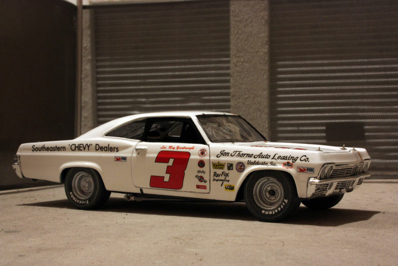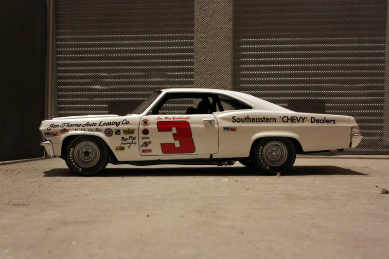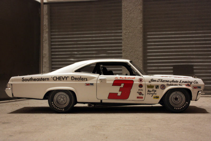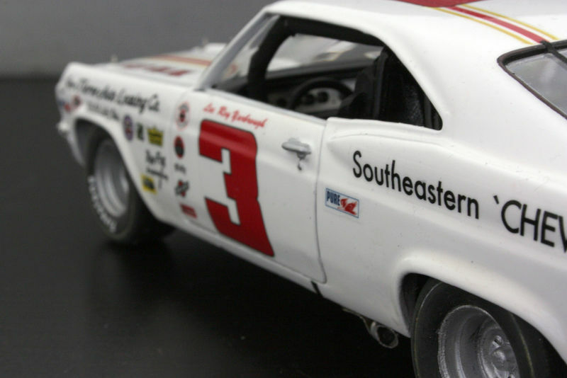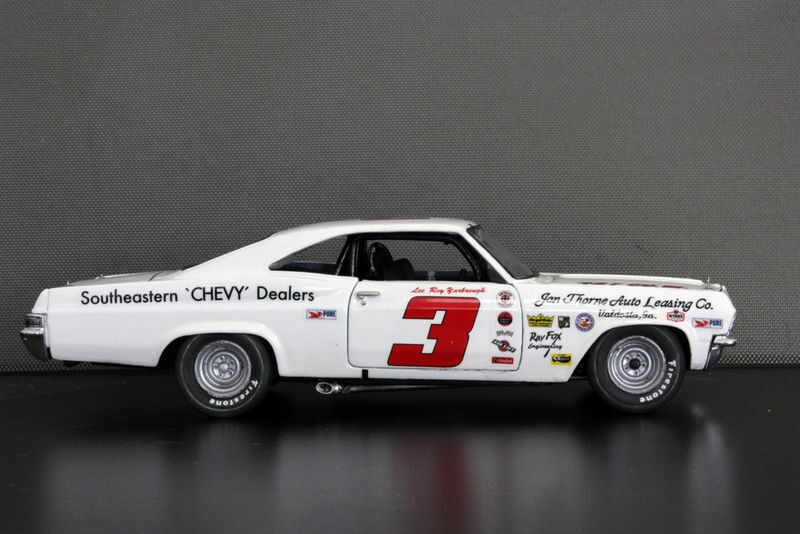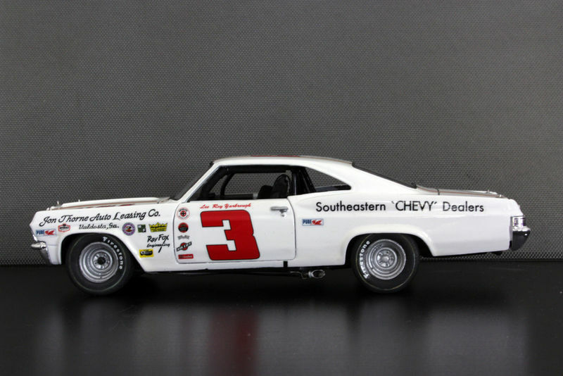 Dieses Modell im 1:24 Maßstab von Welly zeigt eine detaillierte Nachbildung mit akkuraten Sponsoren-Logos wie Jim Thorne Auto Leasing Co. und Southeastern "CHEVY" Dealers. Auch sind die Namen Roy Fox und PUROLATOR zu erkennen. Die Farbgebung ist überwiegend weiß mit einem großen roten Nummer 3 auf den Türen, was dem Auto eine authentische Nascar-Aussehen verleiht. Die Anpassungen an diesem Modell unterstreichen die Hingabe und das Detailbewusstsein, das in seine Erschaffung eingeflossen ist.