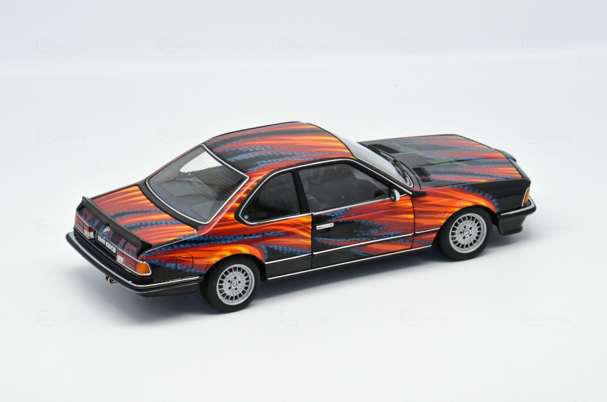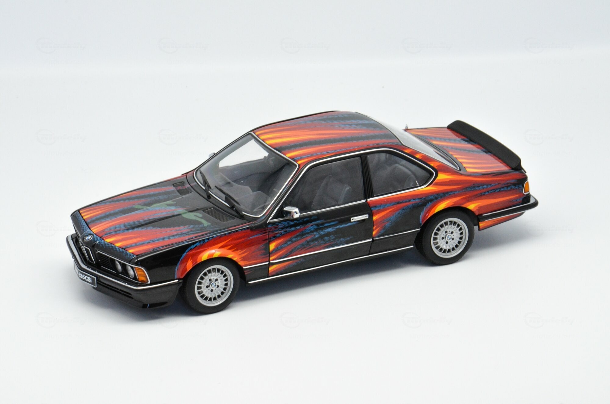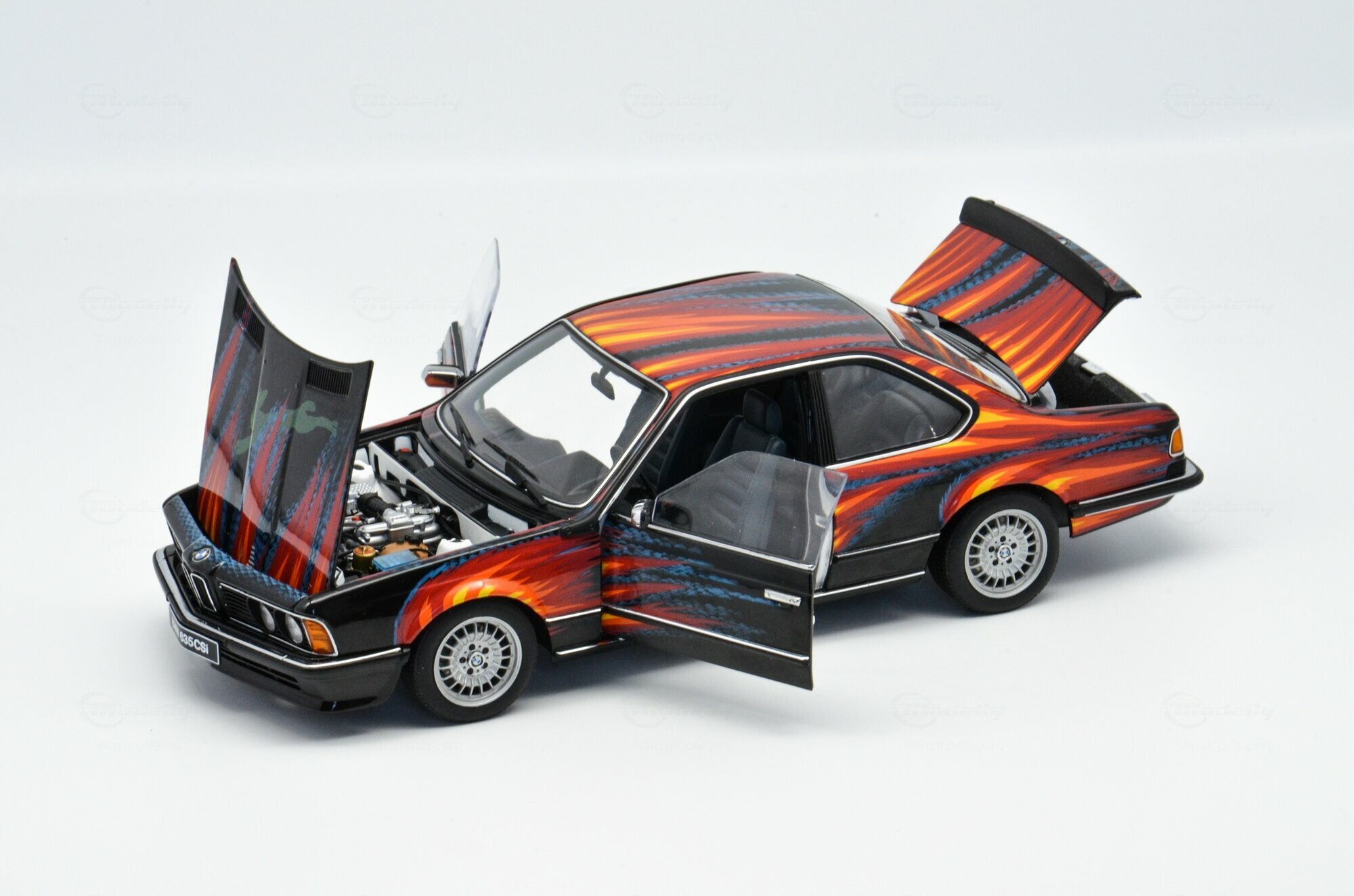 Das Modellauto im Maßstab 1:18 von AUTOart basiert auf dem Original BMW 635 CSi (E24) Art Car von Ernst Fuchs. Das Modell ist aus Diecast-Material gefertigt, was für Stabilität und Detailtreue sorgt. Die Vielzahl an Details, wie die originalgetreuen Felgen in unverwechselbarem Design und die sorgfältige Umsetzung der Lackierung, machen es zu einem begehrten Sammlerobjekt. Jedes Exemplar ist ein Teil einer Limited Edition, was dieses Modellauto besonders exklusiv macht. Auf den Fotos der Sammlung des Modelly-Mitglieds "Vinzmodelcars" ist die Präzision der Nachbildung klar erkennbar. Die Türen und Motorhaube sind funktional, und das Interieur des Modells zeigt die luxuriöse Innenausstattung des Originals.