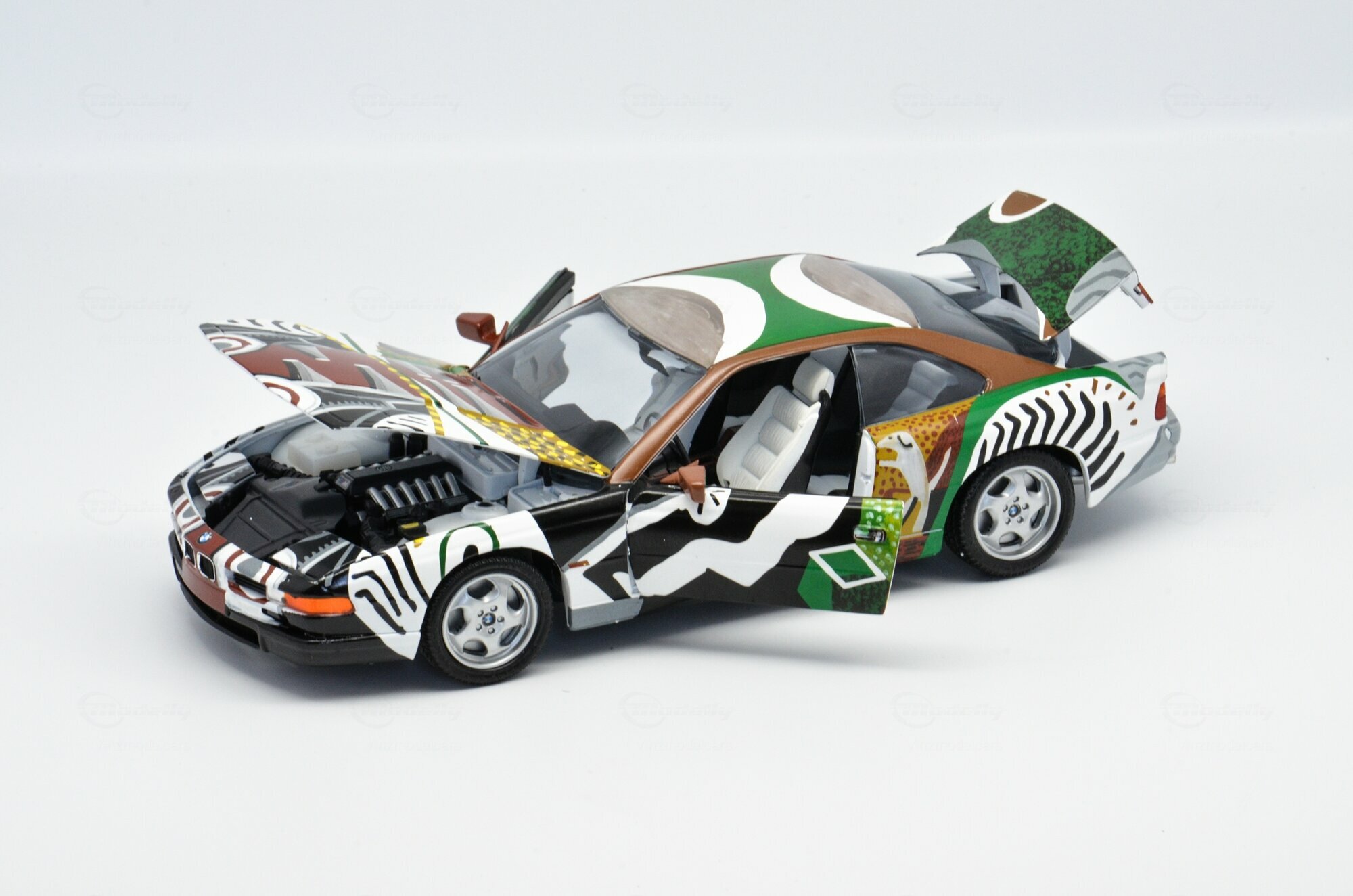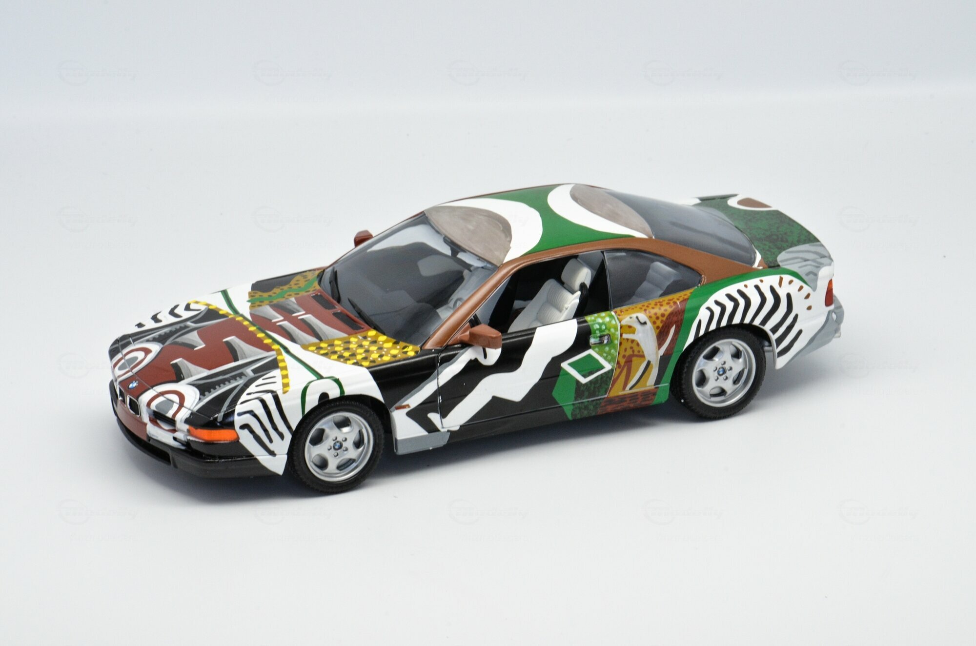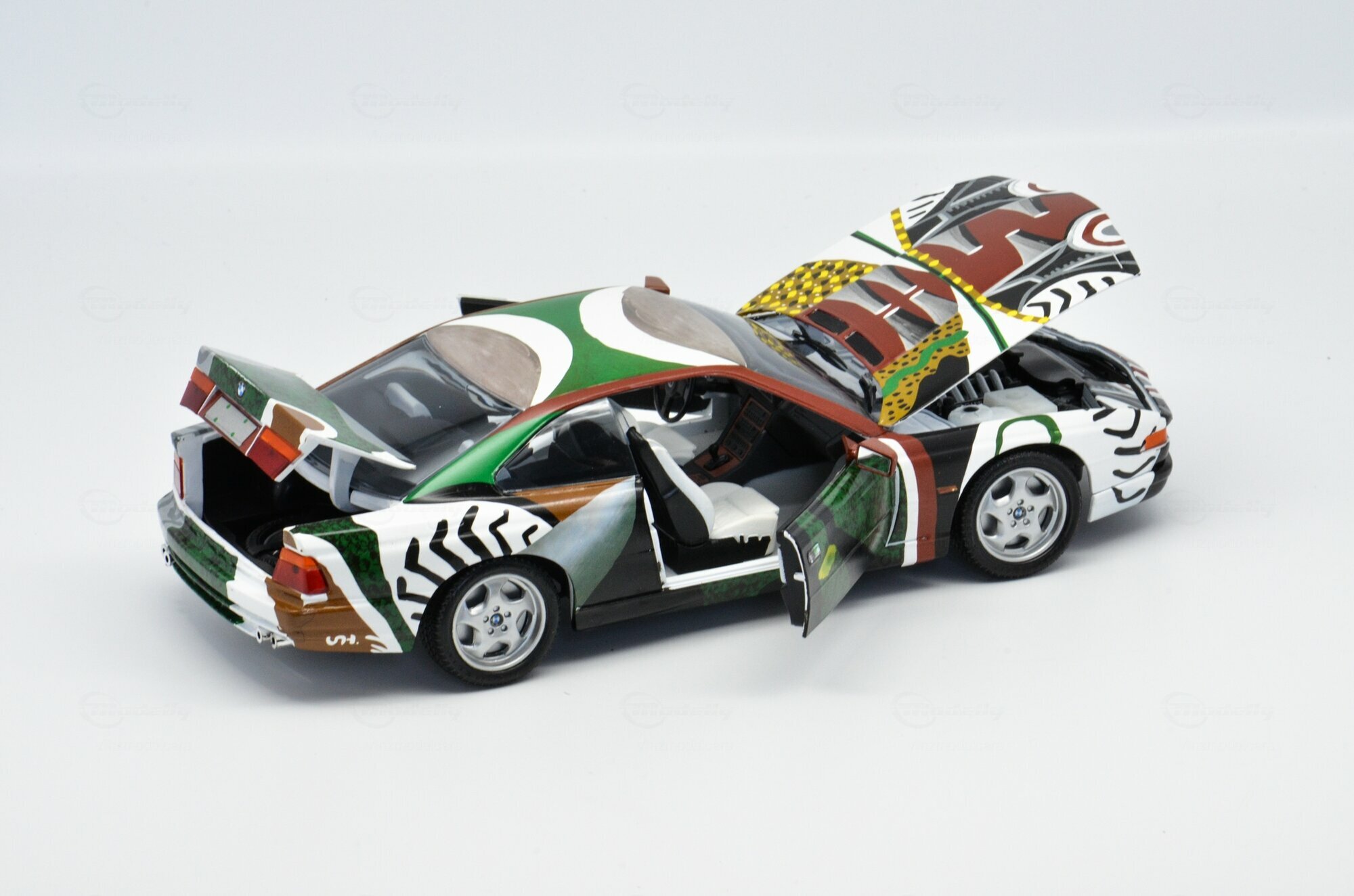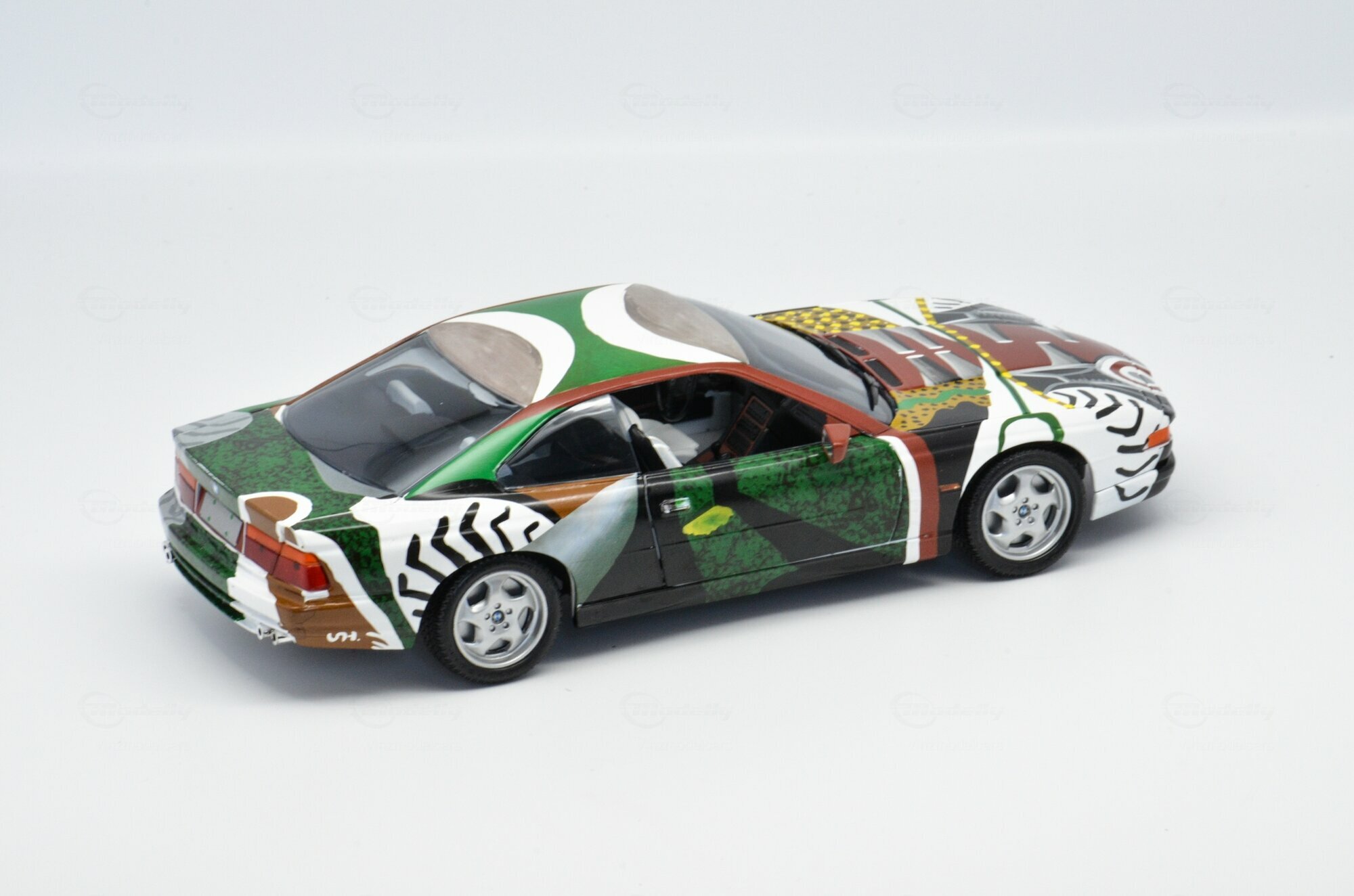 Das hier gezeigte Modellauto im 1:18 Maßstab, hergestellt von Revell, ist eine detaillierte Nachbildung des ikonischen BMW 850 CSi (E31) Art Car, gestaltet von David Hockney. Dieses Sammlermodell ist aus diecast Material gefertigt und beeindruckt durch seine präzise Umsetzung der Originaldetails. Die Lackierung dieses Modells, das Teil der Sammlung von "Vinzmodelcars" auf Modelly ist, ist ein wahres Kunstwerk. Die farbenfrohe und dynamische Bemalung zieht jeden Betrachter in ihren Bann und ist eine Hommage an die künstlerische Gestaltung von Hockney.