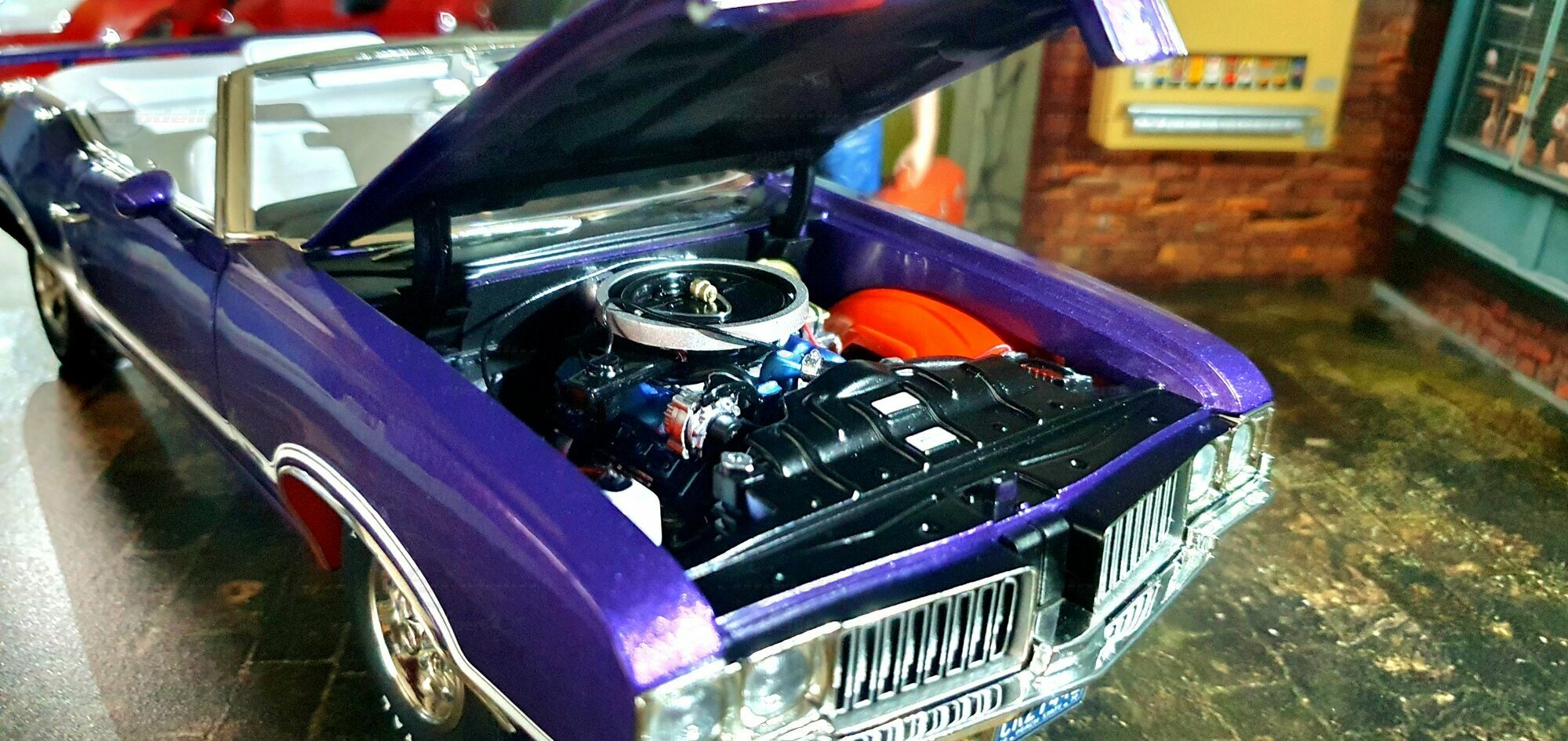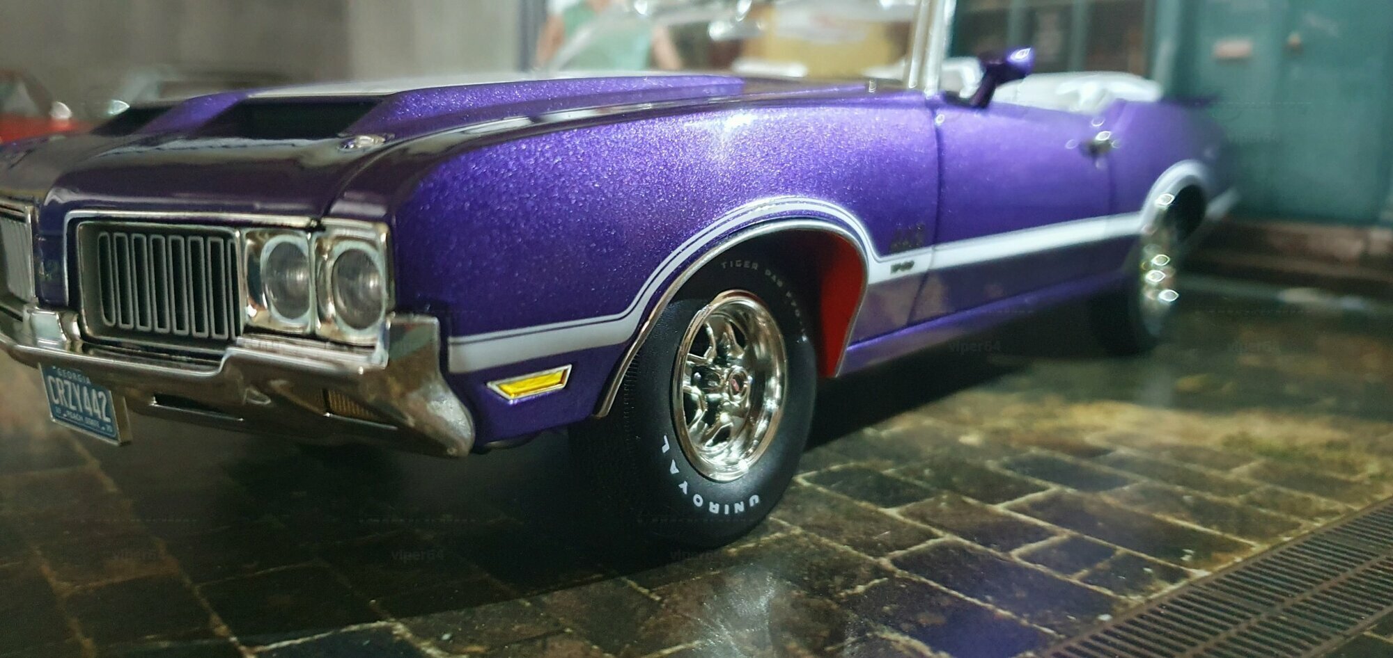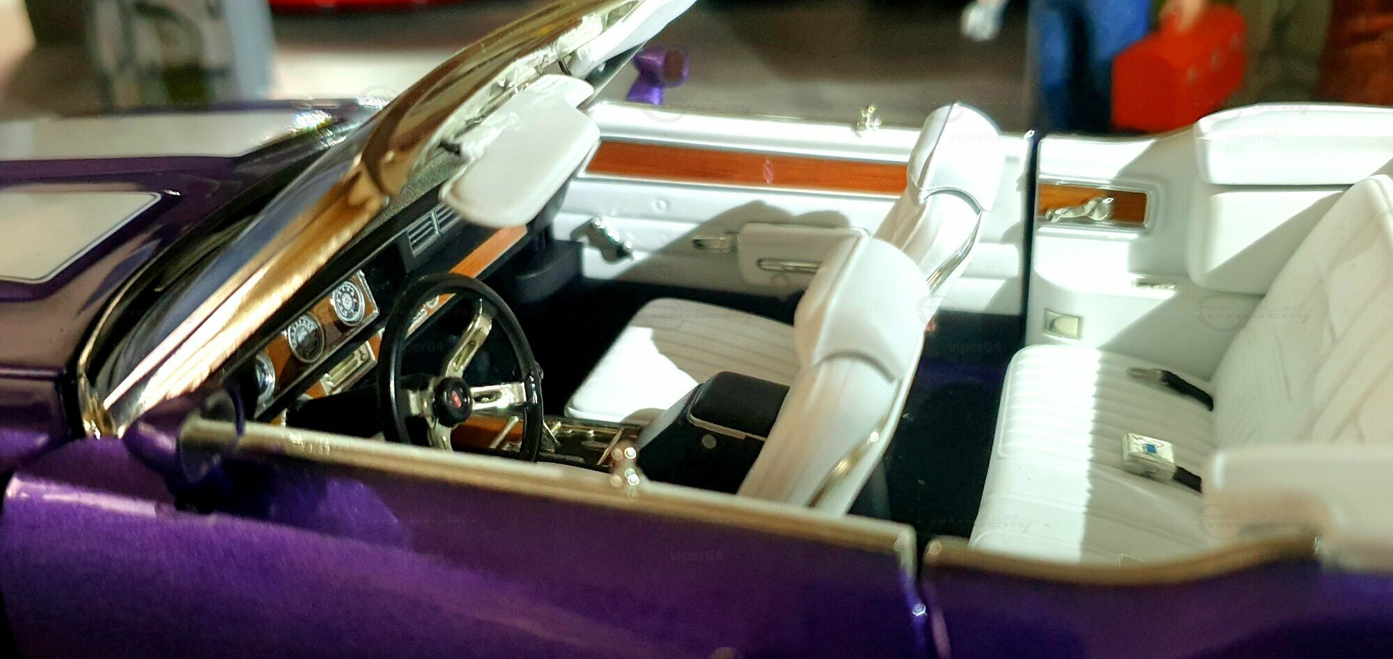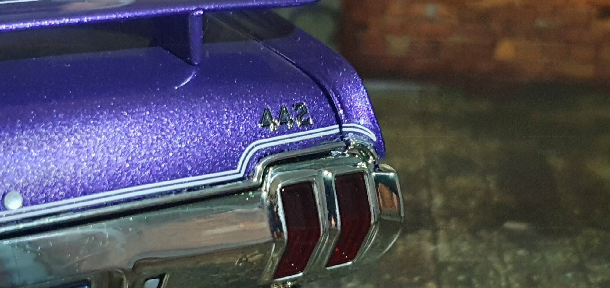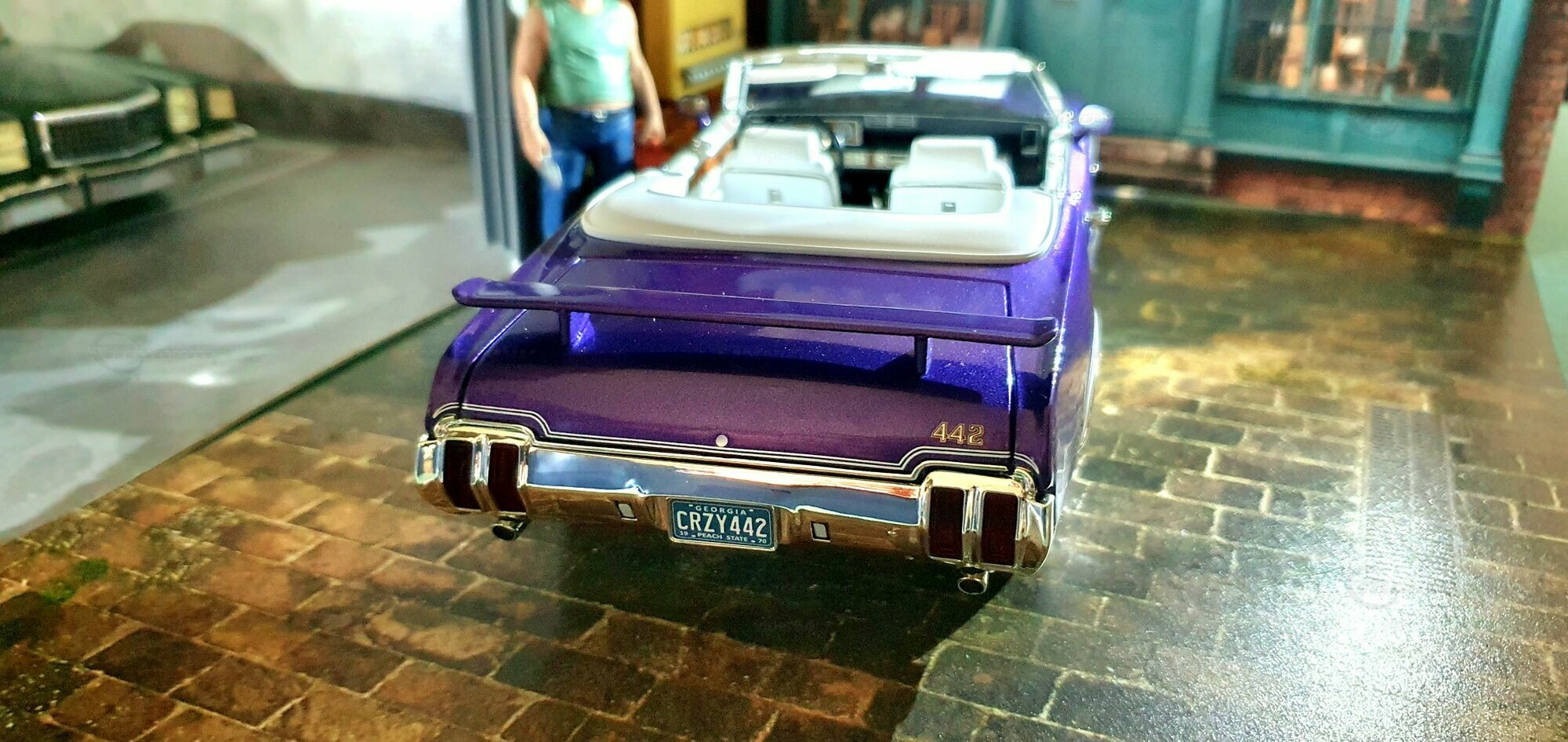 Das Vorbild, der Oldsmobile 442 W-30 Convertible, war formal ein zweitüriges Cabriolet mit klarer A‑Body-Silhouette und markanten Stoßfängern. Auf den hier gezeigten Bildern der Miniatur lässt sich eine violett‑metallic Lackierung mit kontrastierenden weißen Haubenstreifen erkennen. Die beiden Streifen sind in rechteckigen Feldern ausgeführt, wie es bei vielen W‑30‑Hauben mit Luftzufuhr üblich war. Seitlich läuft eine weiße Zierlinie über die Flanken; vorn am Kotflügel sitzt ein 442‑Emblem, darunter ein kleiner W‑30‑Schriftzug. Auffällig ist außerdem der Heckspoiler, der in dieser Zeit bei den leistungsstarken Oldsmobile‑Varianten häufig ab Werk oder als Zubehör montiert wurde. Die Felgen erscheinen als mehrteilige Chromräder in klassischer 5‑Speichen‑Anmutung, die Reifen tragen gut lesbar die Beschriftung „UNIROYAL Tiger Paw“. In der Frontansicht fällt der typische, vertikal gerippte Kühlergrill mit eingelassenen Scheinwerfern auf; verchromte Stoßfänger rahmen das Bild. Im Interieur ist eine vollständig weiße Ausstattung mit geprägten Sitzflächen zu sehen; Armaturenbrett und Türtafeln setzen dunkle Kontraste, ein Holzdekorstreifen am Armaturenbrett ist nachgebildet. Der Blick in den Radlauf zeigt rote Innenkotflügel – ein W‑30‑Erkennungsmerkmal, das die Miniatur berücksichtigt. Das Verdeck liegt als Cabrio‑Persenning an, was den offenen Charakter betont und die Sitze sichtbar macht. Damit spiegelt das Modell wesentliche Vorbilddetails in Form und Proportionen nachvollziehbar wider.