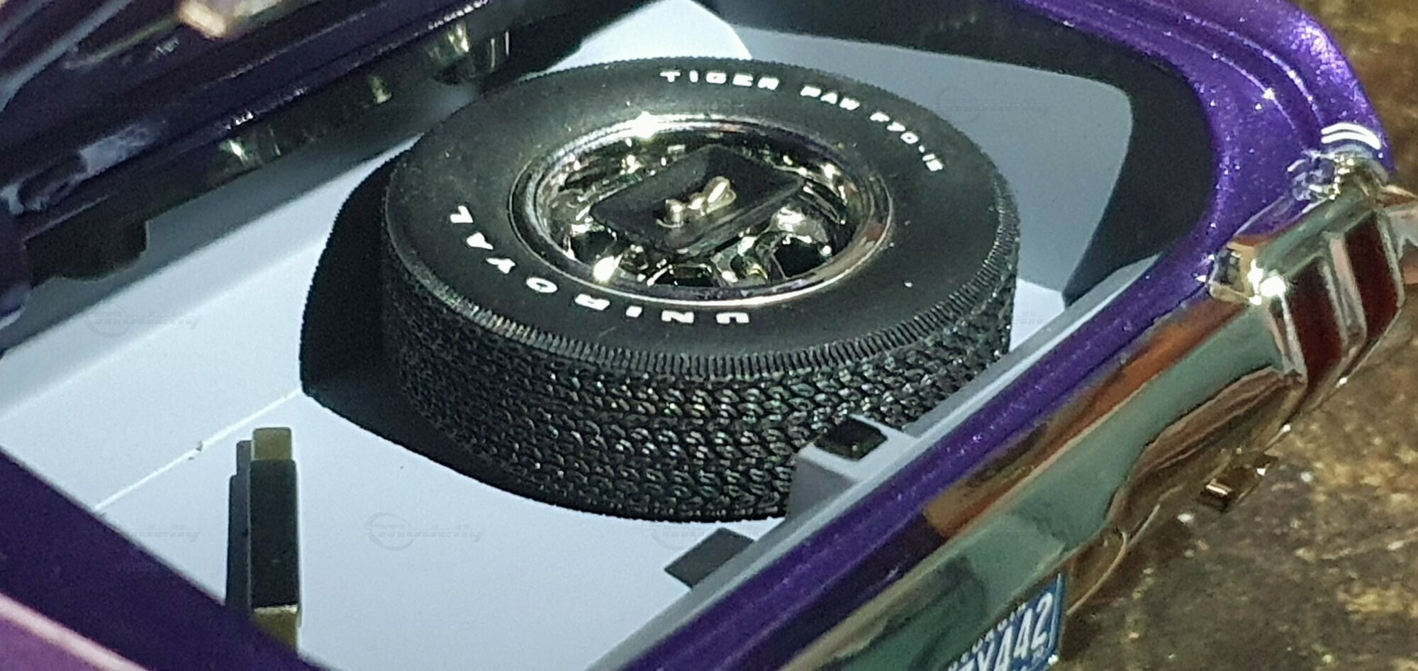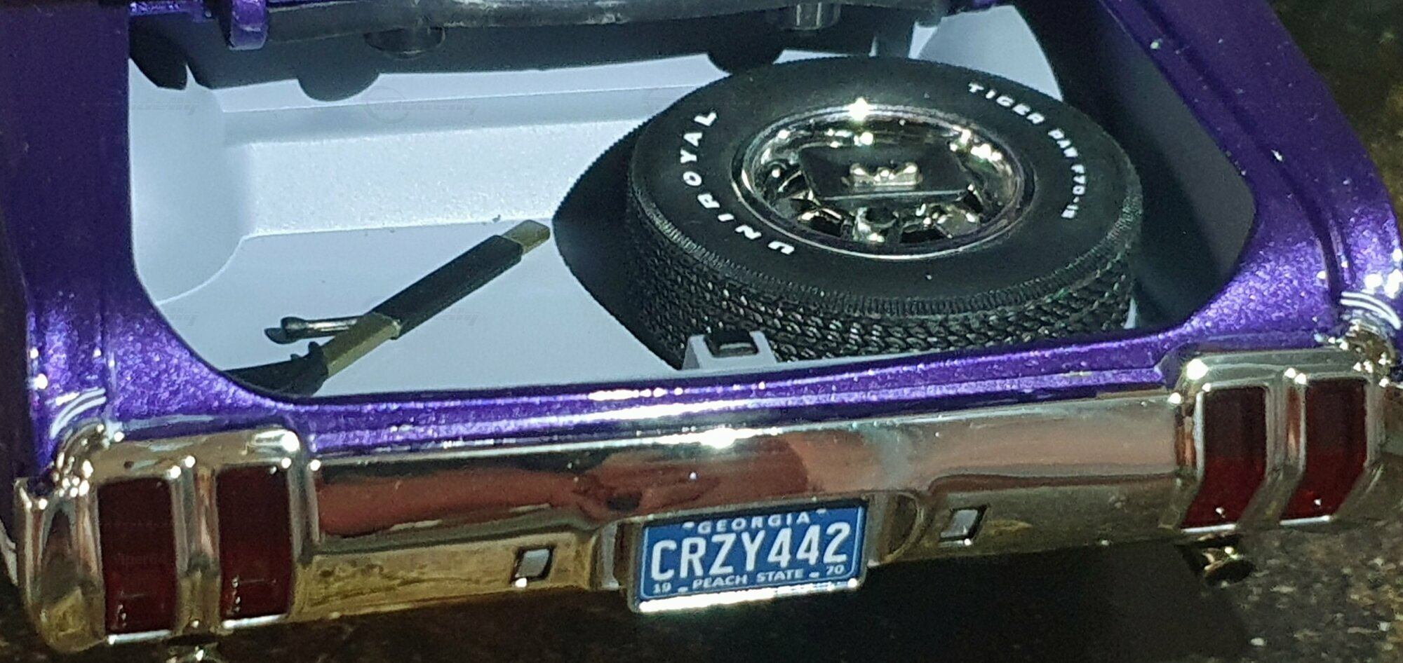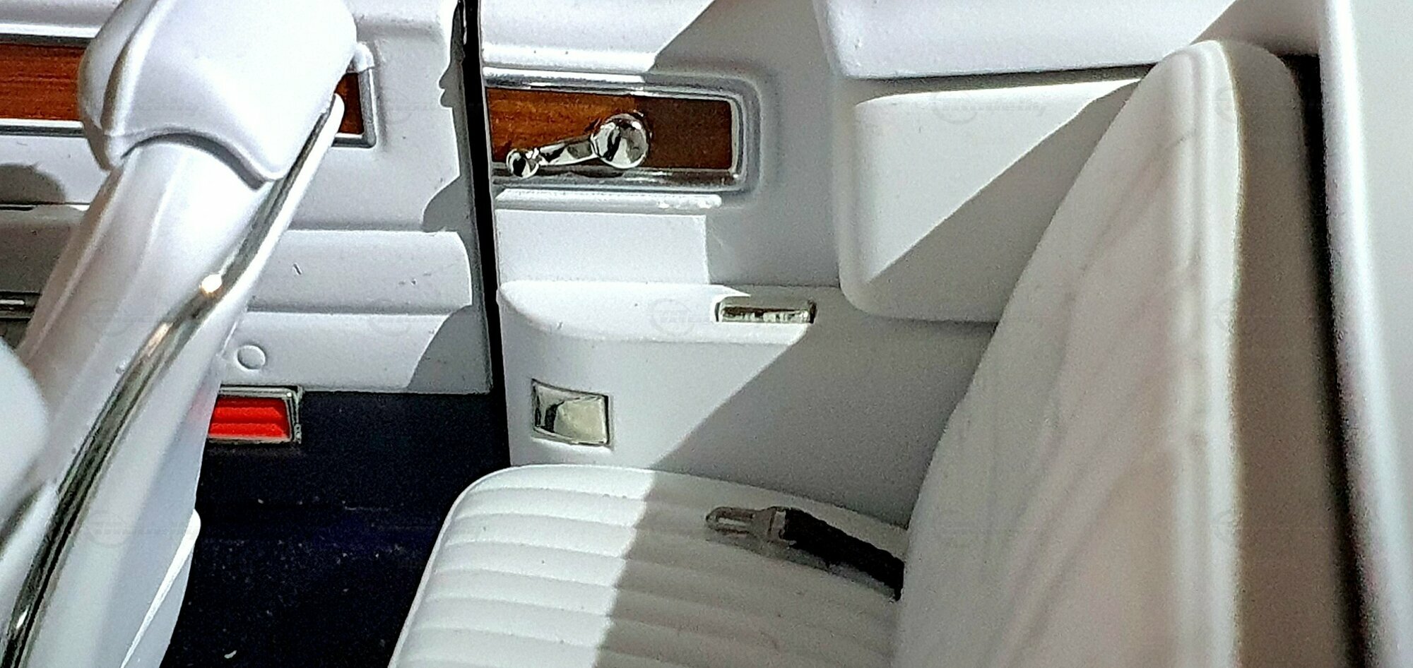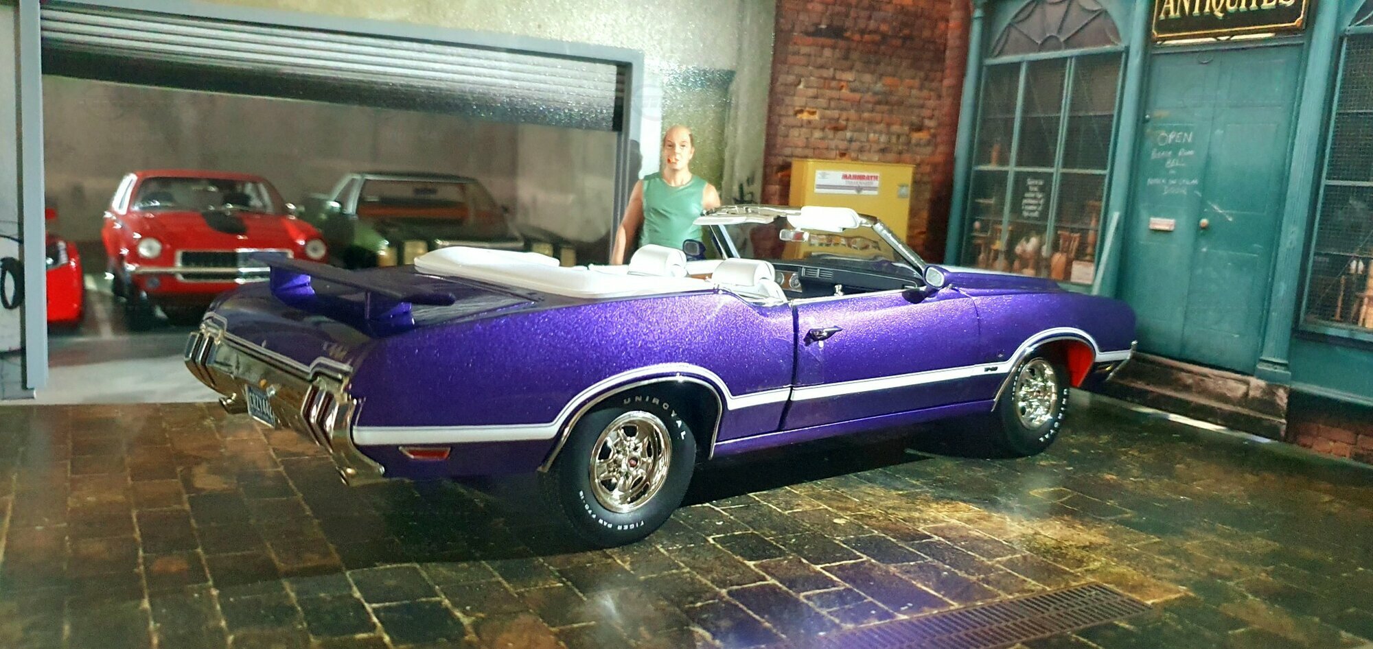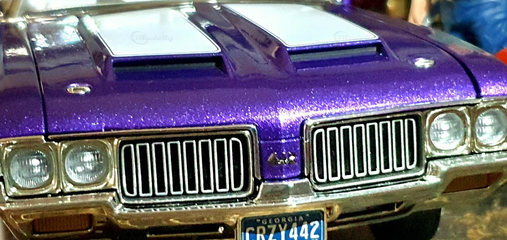 Das Vorbild, der Oldsmobile 442 W-30 Convertible, war formal ein zweitüriges Cabriolet mit klarer A‑Body-Silhouette und markanten Stoßfängern. Auf den hier gezeigten Bildern der Miniatur lässt sich eine violett‑metallic Lackierung mit kontrastierenden weißen Haubenstreifen erkennen. Die beiden Streifen sind in rechteckigen Feldern ausgeführt, wie es bei vielen W‑30‑Hauben mit Luftzufuhr üblich war. Seitlich läuft eine weiße Zierlinie über die Flanken; vorn am Kotflügel sitzt ein 442‑Emblem, darunter ein kleiner W‑30‑Schriftzug. Auffällig ist außerdem der Heckspoiler, der in dieser Zeit bei den leistungsstarken Oldsmobile‑Varianten häufig ab Werk oder als Zubehör montiert wurde. Die Felgen erscheinen als mehrteilige Chromräder in klassischer 5‑Speichen‑Anmutung, die Reifen tragen gut lesbar die Beschriftung „UNIROYAL Tiger Paw“. In der Frontansicht fällt der typische, vertikal gerippte Kühlergrill mit eingelassenen Scheinwerfern auf; verchromte Stoßfänger rahmen das Bild. Im Interieur ist eine vollständig weiße Ausstattung mit geprägten Sitzflächen zu sehen; Armaturenbrett und Türtafeln setzen dunkle Kontraste, ein Holzdekorstreifen am Armaturenbrett ist nachgebildet. Der Blick in den Radlauf zeigt rote Innenkotflügel – ein W‑30‑Erkennungsmerkmal, das die Miniatur berücksichtigt. Das Verdeck liegt als Cabrio‑Persenning an, was den offenen Charakter betont und die Sitze sichtbar macht. Damit spiegelt das Modell wesentliche Vorbilddetails in Form und Proportionen nachvollziehbar wider.