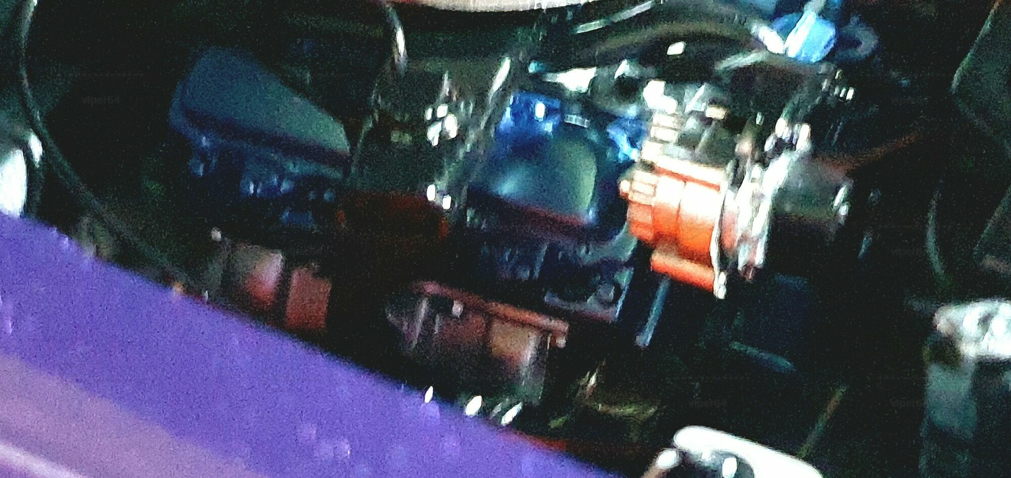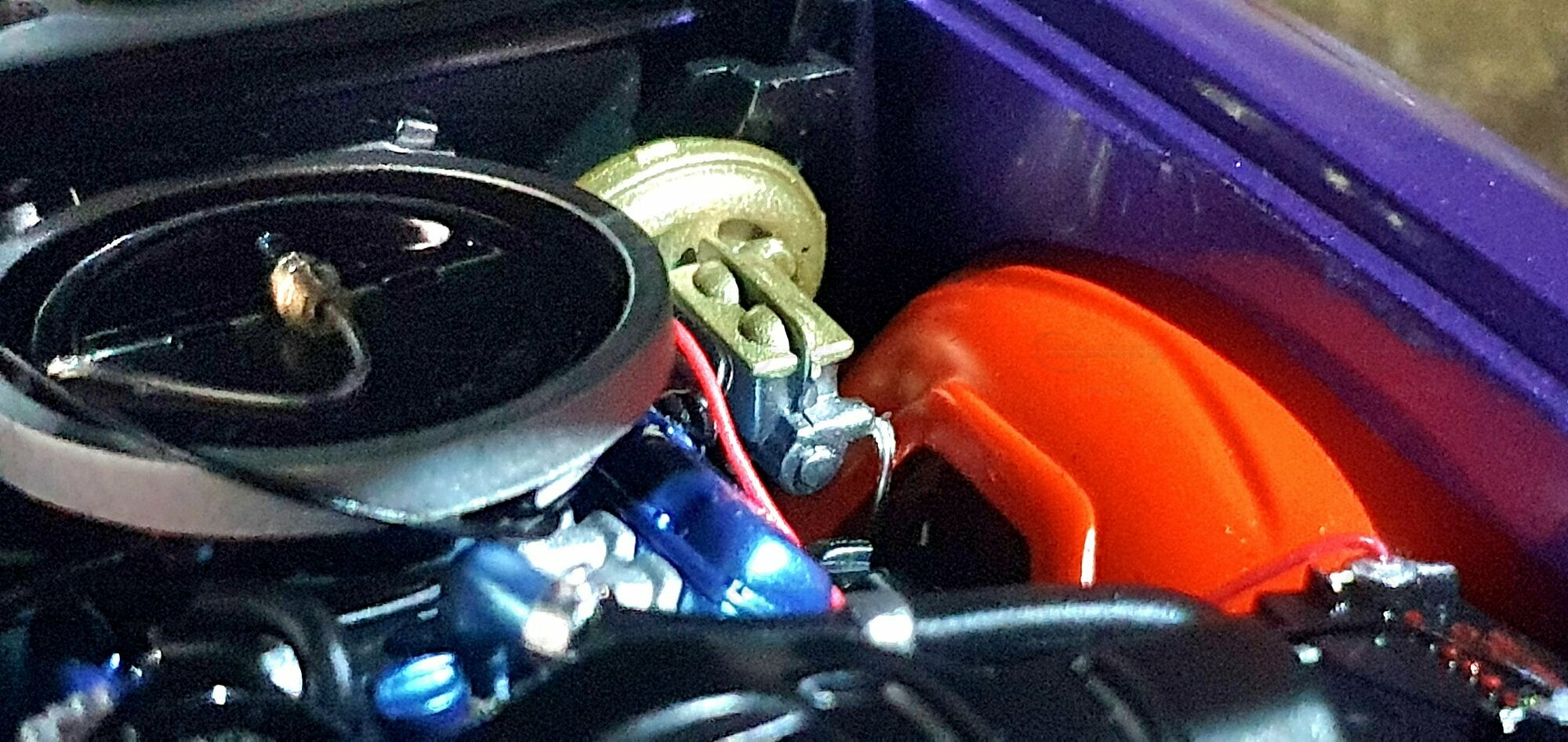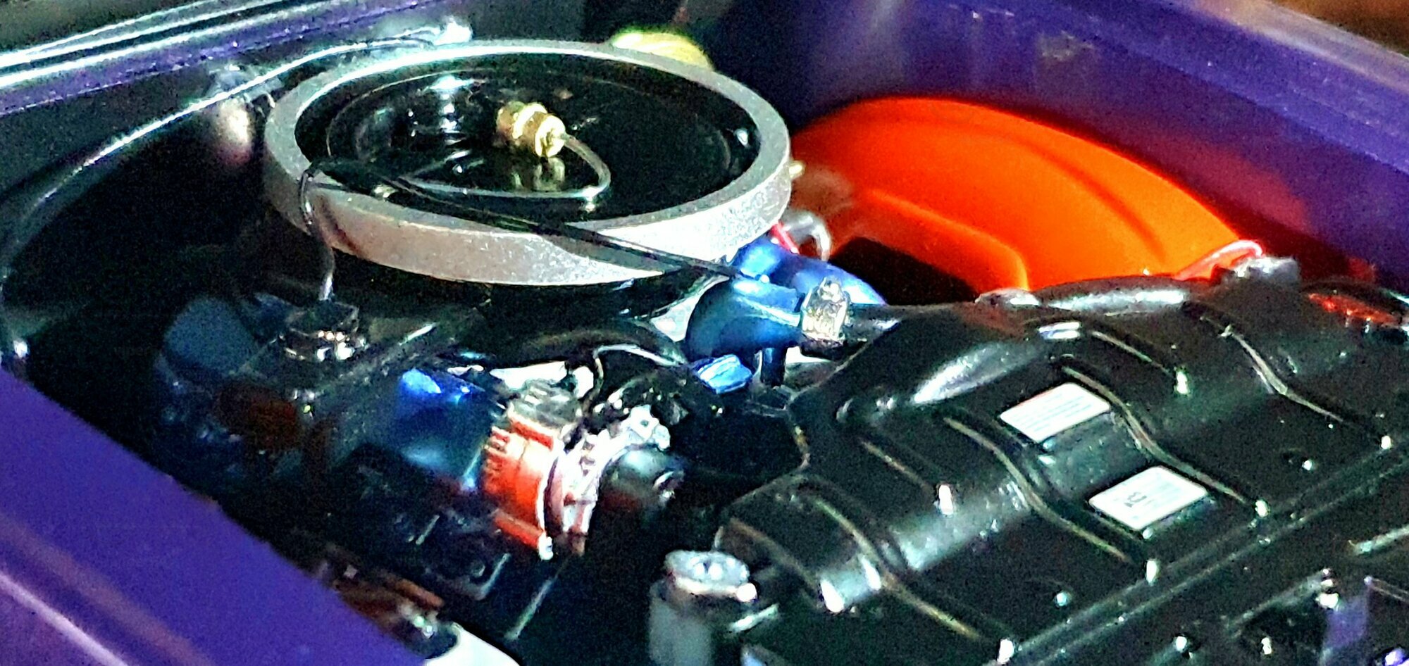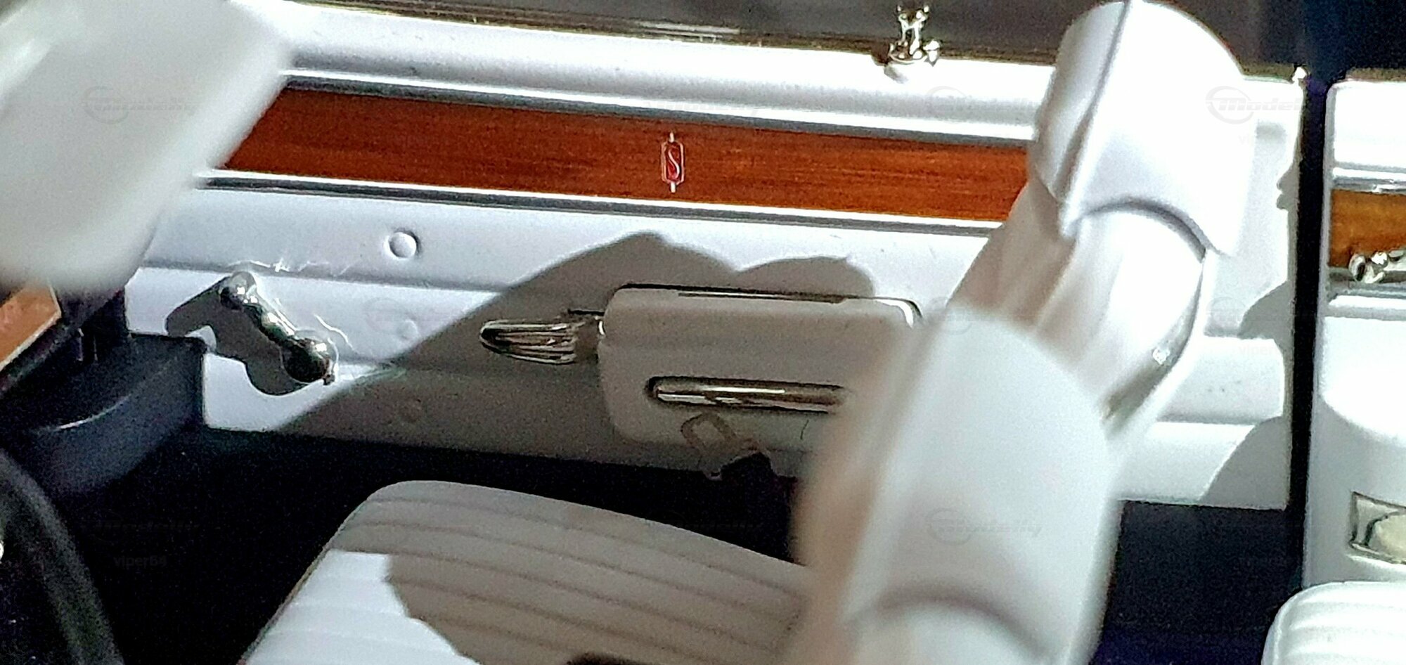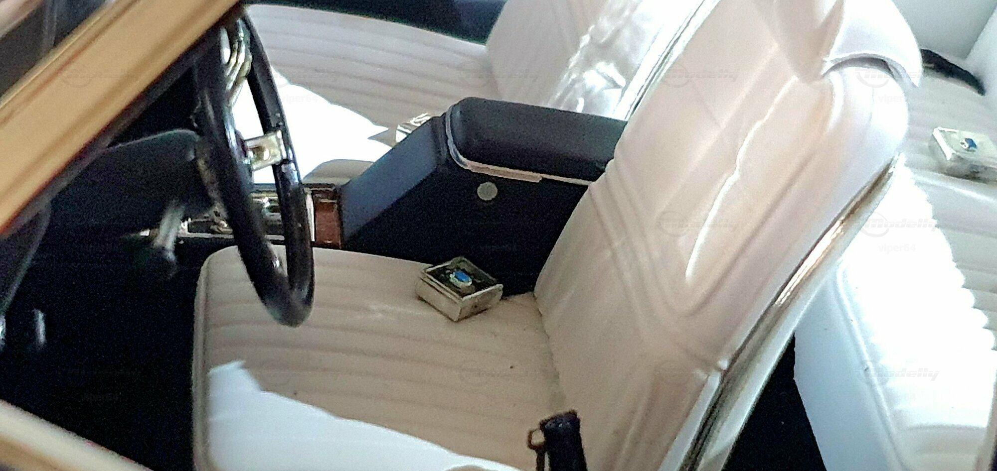 Das Vorbild, der Oldsmobile 442 W-30 Convertible, war formal ein zweitüriges Cabriolet mit klarer A‑Body-Silhouette und markanten Stoßfängern. Auf den hier gezeigten Bildern der Miniatur lässt sich eine violett‑metallic Lackierung mit kontrastierenden weißen Haubenstreifen erkennen. Die beiden Streifen sind in rechteckigen Feldern ausgeführt, wie es bei vielen W‑30‑Hauben mit Luftzufuhr üblich war. Seitlich läuft eine weiße Zierlinie über die Flanken; vorn am Kotflügel sitzt ein 442‑Emblem, darunter ein kleiner W‑30‑Schriftzug. Auffällig ist außerdem der Heckspoiler, der in dieser Zeit bei den leistungsstarken Oldsmobile‑Varianten häufig ab Werk oder als Zubehör montiert wurde. Die Felgen erscheinen als mehrteilige Chromräder in klassischer 5‑Speichen‑Anmutung, die Reifen tragen gut lesbar die Beschriftung „UNIROYAL Tiger Paw“. In der Frontansicht fällt der typische, vertikal gerippte Kühlergrill mit eingelassenen Scheinwerfern auf; verchromte Stoßfänger rahmen das Bild. Im Interieur ist eine vollständig weiße Ausstattung mit geprägten Sitzflächen zu sehen; Armaturenbrett und Türtafeln setzen dunkle Kontraste, ein Holzdekorstreifen am Armaturenbrett ist nachgebildet. Der Blick in den Radlauf zeigt rote Innenkotflügel – ein W‑30‑Erkennungsmerkmal, das die Miniatur berücksichtigt. Das Verdeck liegt als Cabrio‑Persenning an, was den offenen Charakter betont und die Sitze sichtbar macht. Damit spiegelt das Modell wesentliche Vorbilddetails in Form und Proportionen nachvollziehbar wider.