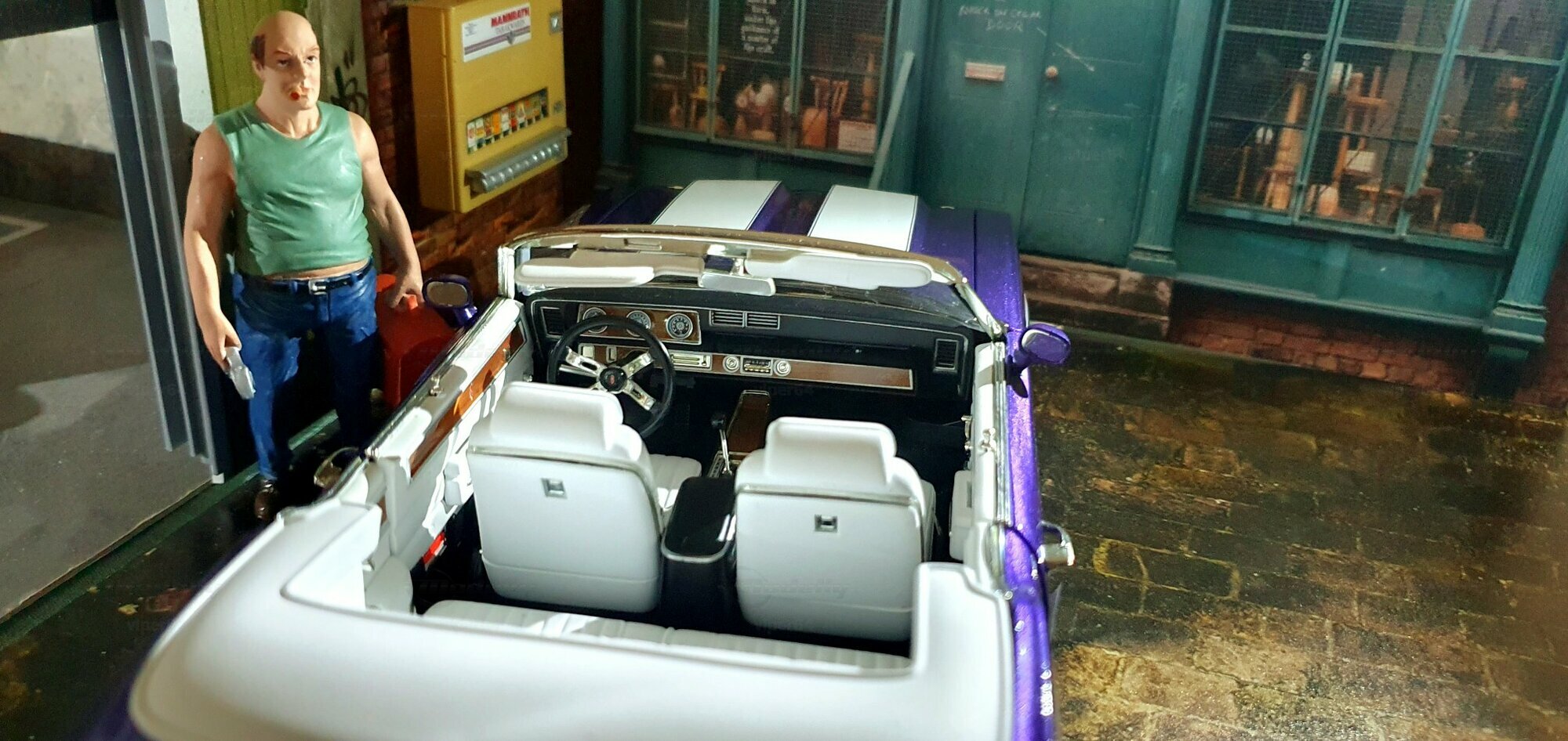 Die abgebildete Miniatur ist ein Modellauto im Maßstab 1:18 von ACME und in der Sammlung von Modelly-Mitglied „viper64“ zu finden. Der Hersteller setzt beim Gehäuse auf die Diecast‑Bauweise; das sorgt für ein realistisches Gewicht und erlaubt präzise Chromteile an Stoßfängern, Griffen und Zierleisten. Sichtbar sind klare Scheinwerfergläser, die umlaufende Fensterrahmung sowie die maßstäbliche Nachbildung der Spiegel. Die Lackierung wirkt gleichmäßig und zeigt feinen Metallic‑Effekt; weiße Doppelstreifen auf der Haube und die seitliche Zierlinie sind sauber abgesetzt. Innen weist das Modell die helle Sitzlandschaft mit Strukturprägung, Gurtschlösser, Lenkrad, Instrumententafel und verchromte Zierleisten aus. Die 442‑ sowie W‑30‑Badges sind gut lesbar. Im Umfeld der Fotos steht das Fahrzeug in einem Diorama mit Garagentor, Getränkeautomat und Ladenfassade – das vermittelt Maßstabstiefe, beeinflusst aber nicht die beschriebenen Fahrzeugdetails. Diese Ausgabe wird als limitierte Auflage geführt, was für Sammler relevante Informationen zum Bestand liefert. Wer sich für amerikanische Performance‑Cabrios der frühen 1970er interessiert, findet in dieser Umsetzung eine authentische Repräsentation des Oldsmobile 442 W-30 Convertible. Abschließend noch einmal der Hinweis für Suchende: Es handelt sich um ein Modellauto im Maßstab 1:18 von ACME, gefertigt in Diecast‑Bauweise und in der Sammlung von „viper64“ dokumentiert.