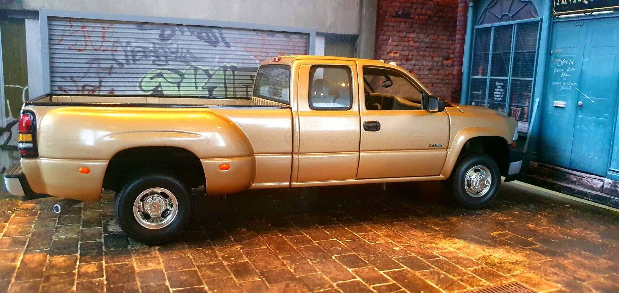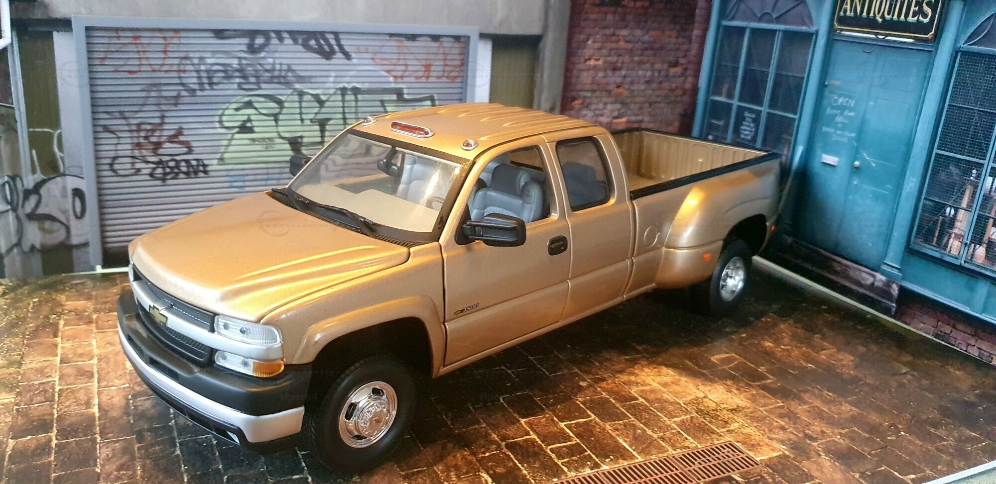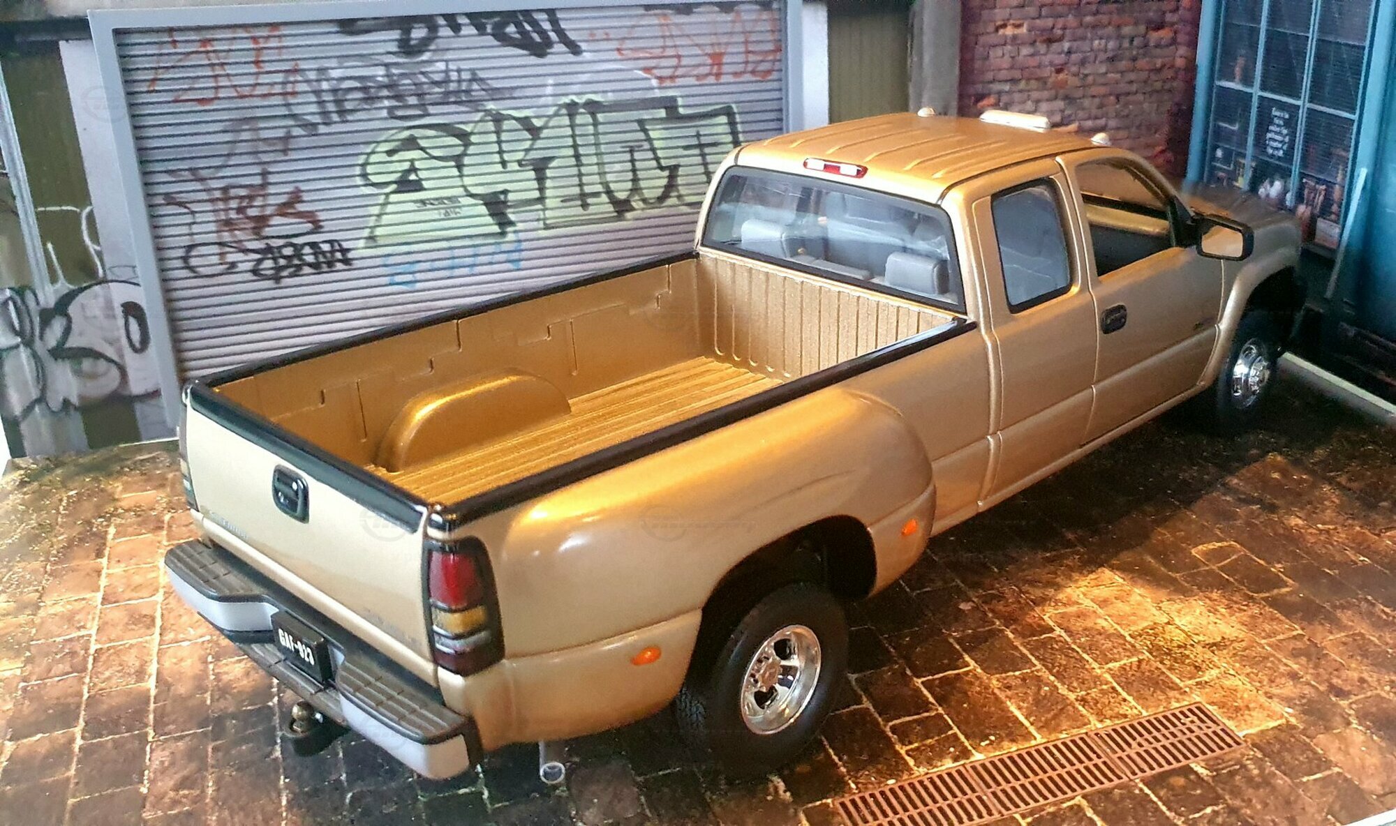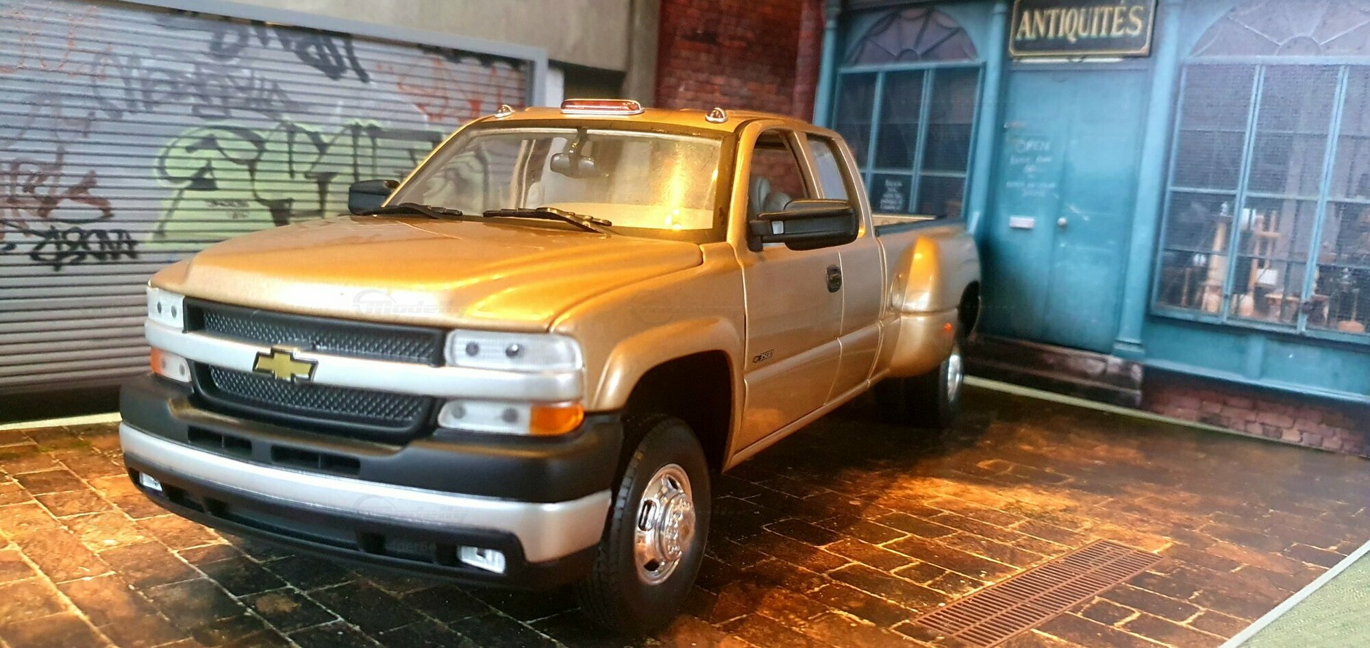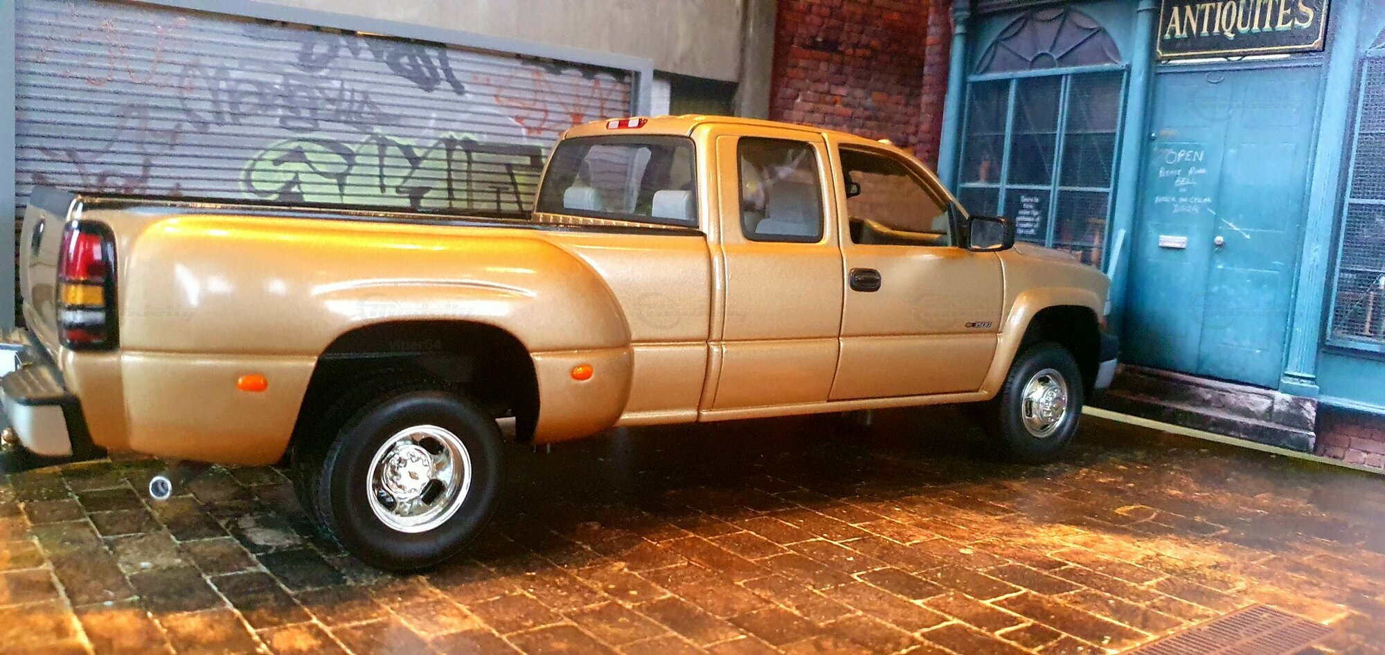 Die Fotos zeigen ein Modellauto im 1:18-Maßstab von Anson, das sich am Chevrolet Silverado 3500 der genannten GMT800-Generation orientiert. Das Exemplar gehört zur Sammlung des Modelly-Mitglieds „viper64“. Das Miniaturfahrzeug ist aus Diecast-Metall gefertigt und weist die für die Dually-Version charakteristischen verbreiterten hinteren Kotflügel auf. Erkennbar ist die Extended-Cab-Kabine mit den typischen kurzen Fondtüren, der lange Ladeboden mit geprägtem Wannenprofil sowie die Clearance-Lights auf dem Kabinendach. Die Front zeigt den zweiteiligen Kühlergrill mit goldfarbenem Bowtie, die übereinander angeordneten Scheinwerfer und die zweiteilige Stoßfängerabdeckung mit schwarzen und silbernen Bereichen. Die Lackierung des Modells wirkt wie ein warmes Gold-Metallic, das im Licht leichte Reflexe zeigt und die Konturen der Motorhaube – inklusive der drei Längssicken – betont. Seitliche Details wie schwarze Türgriffe, Spiegelgehäuse, die „3500“-Beschriftung an der Tür und verchromte Radkappen sind sauber umgesetzt. Im Innenraum ist eine graue Ausstattung zu sehen; vorn sind Armaturenbrett, Lenkrad und Mittelkonsole gut erkennbar, ebenso die hintere Sitzbank der Extended Cab. Das Ladebett zeigt die Riffelstruktur und die Radhauswölbungen der Dually-Ausführung. Auch die klaren Dachmarkierungsleuchten und die in den unteren Stoßfänger integrierten Nebelscheinwerfer sind in den Aufnahmen zu erkennen.