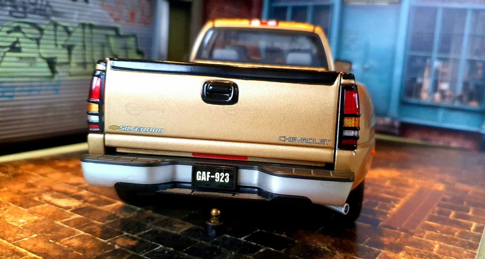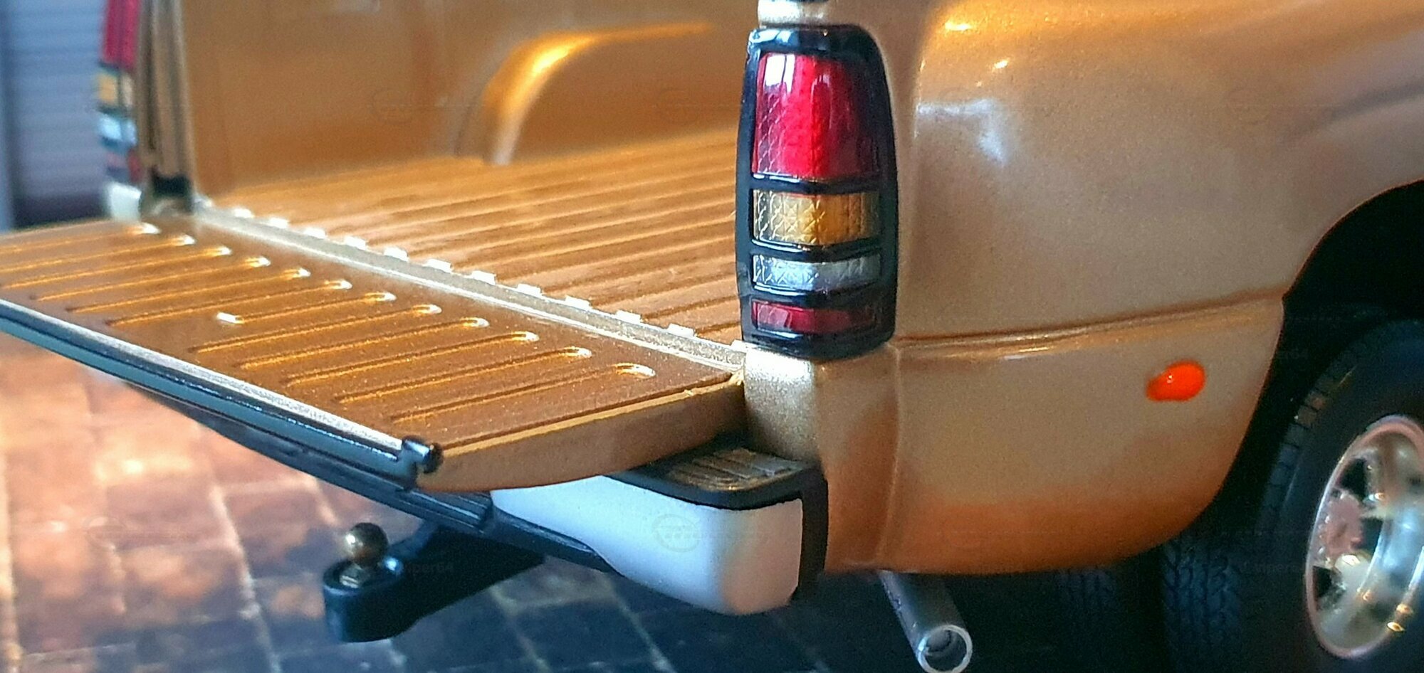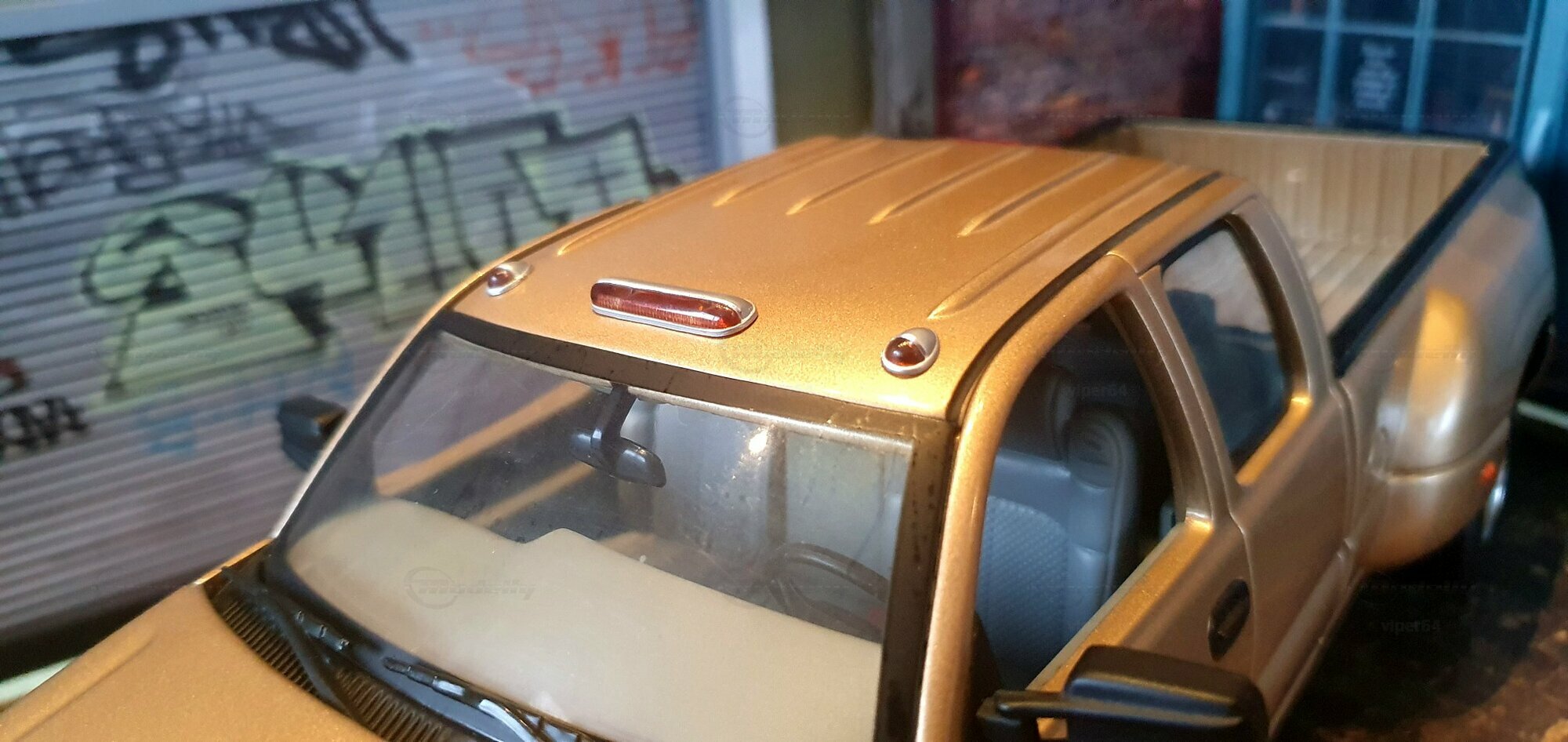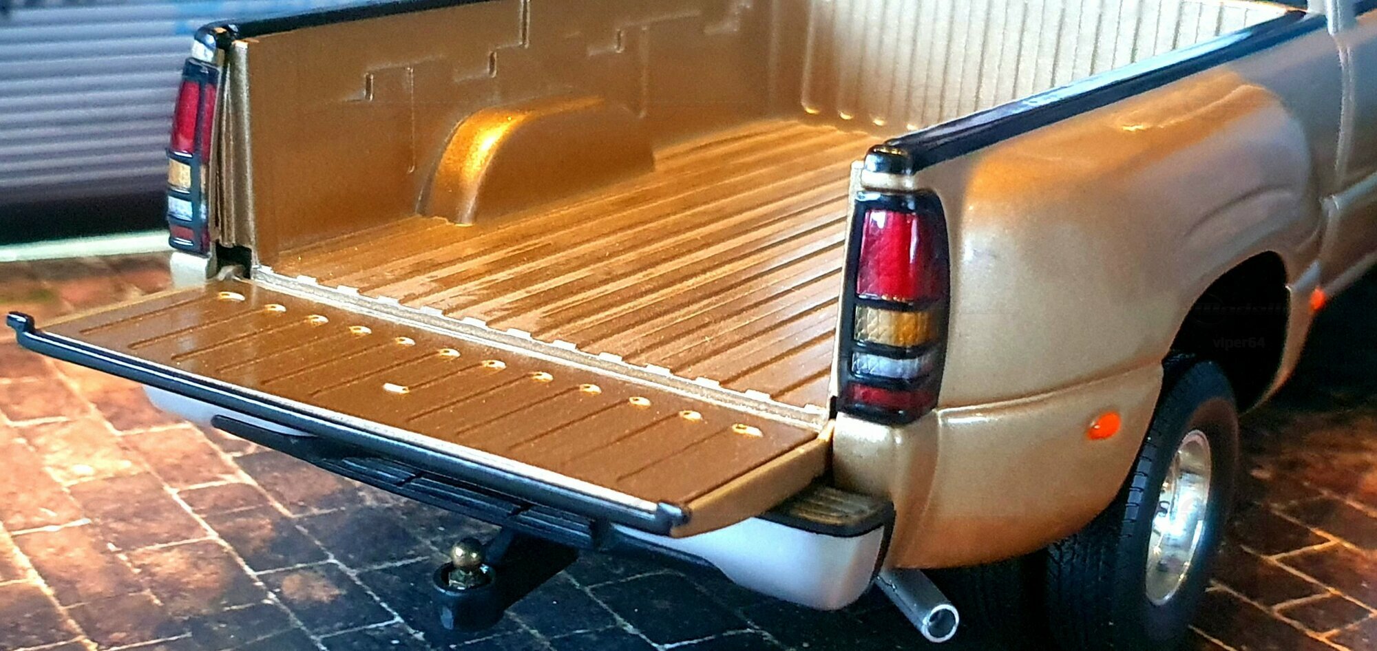 Die Fotos zeigen ein Modellauto im 1:18-Maßstab von Anson, das sich am Chevrolet Silverado 3500 der genannten GMT800-Generation orientiert. Das Exemplar gehört zur Sammlung des Modelly-Mitglieds „viper64“. Das Miniaturfahrzeug ist aus Diecast-Metall gefertigt und weist die für die Dually-Version charakteristischen verbreiterten hinteren Kotflügel auf. Erkennbar ist die Extended-Cab-Kabine mit den typischen kurzen Fondtüren, der lange Ladeboden mit geprägtem Wannenprofil sowie die Clearance-Lights auf dem Kabinendach. Die Front zeigt den zweiteiligen Kühlergrill mit goldfarbenem Bowtie, die übereinander angeordneten Scheinwerfer und die zweiteilige Stoßfängerabdeckung mit schwarzen und silbernen Bereichen. Die Lackierung des Modells wirkt wie ein warmes Gold-Metallic, das im Licht leichte Reflexe zeigt und die Konturen der Motorhaube – inklusive der drei Längssicken – betont. Seitliche Details wie schwarze Türgriffe, Spiegelgehäuse, die „3500“-Beschriftung an der Tür und verchromte Radkappen sind sauber umgesetzt. Im Innenraum ist eine graue Ausstattung zu sehen; vorn sind Armaturenbrett, Lenkrad und Mittelkonsole gut erkennbar, ebenso die hintere Sitzbank der Extended Cab. Das Ladebett zeigt die Riffelstruktur und die Radhauswölbungen der Dually-Ausführung. Auch die klaren Dachmarkierungsleuchten und die in den unteren Stoßfänger integrierten Nebelscheinwerfer sind in den Aufnahmen zu erkennen.