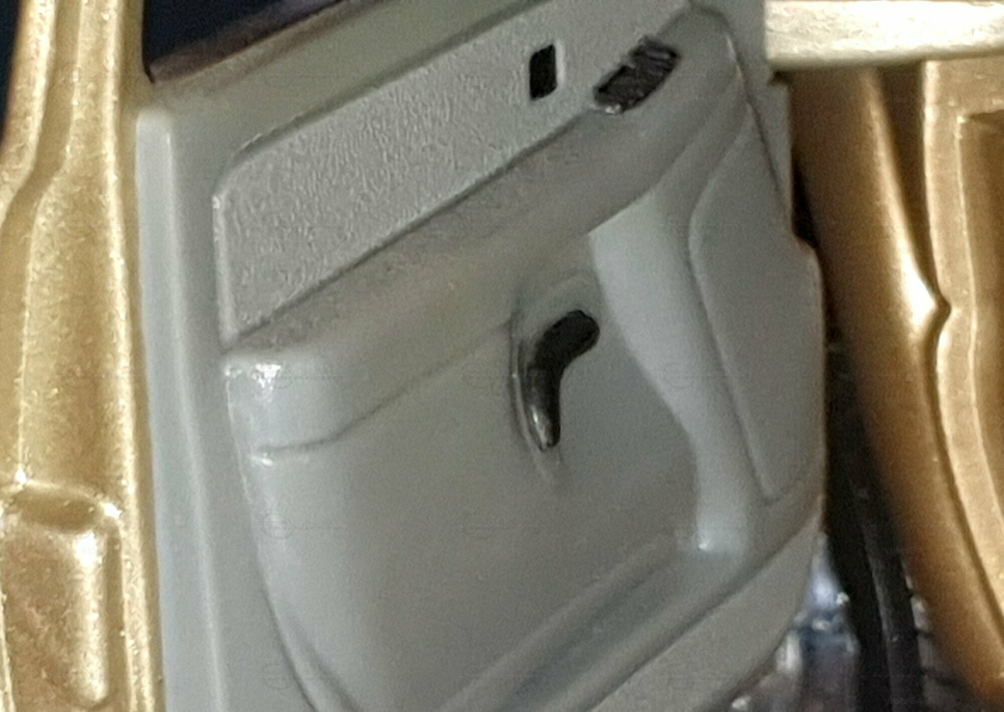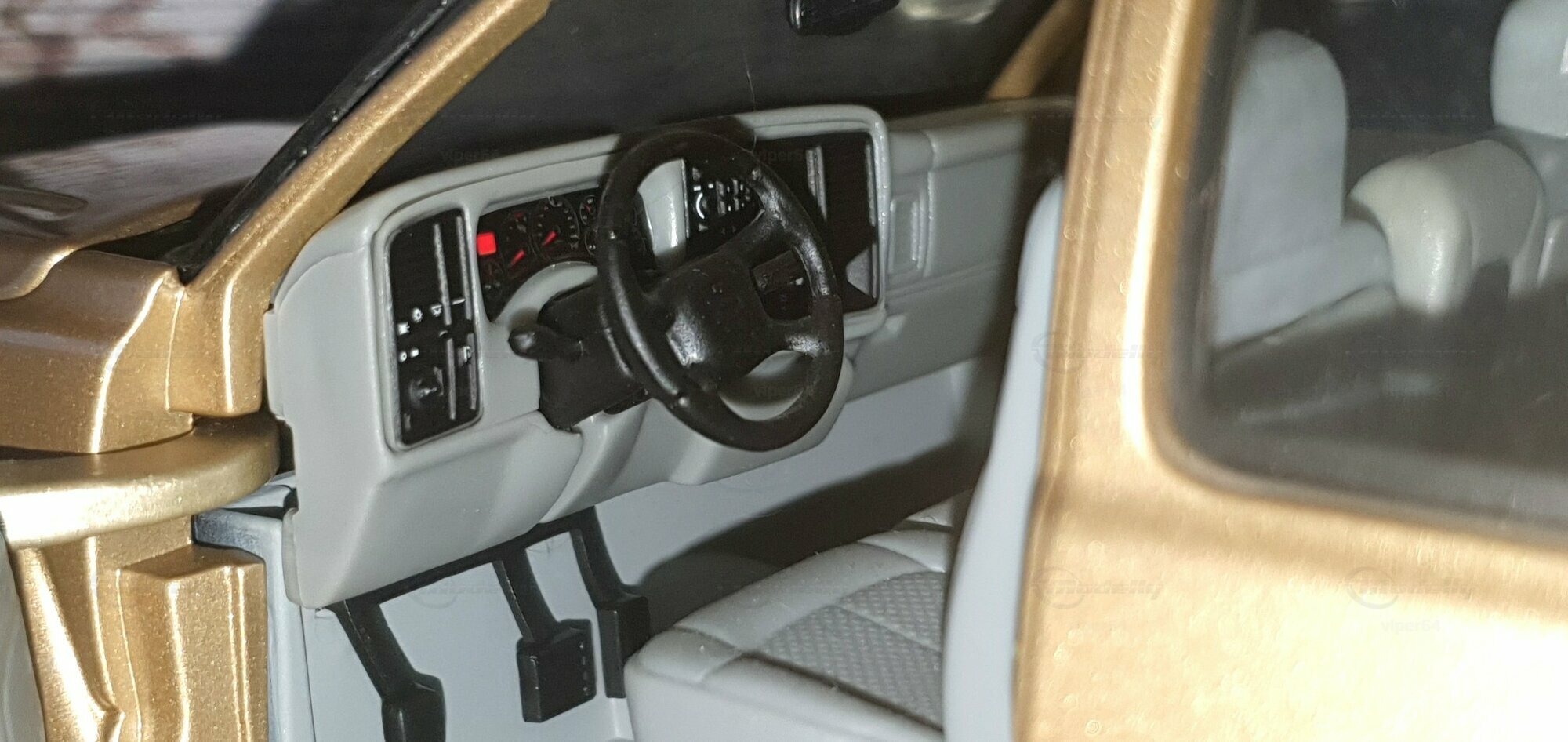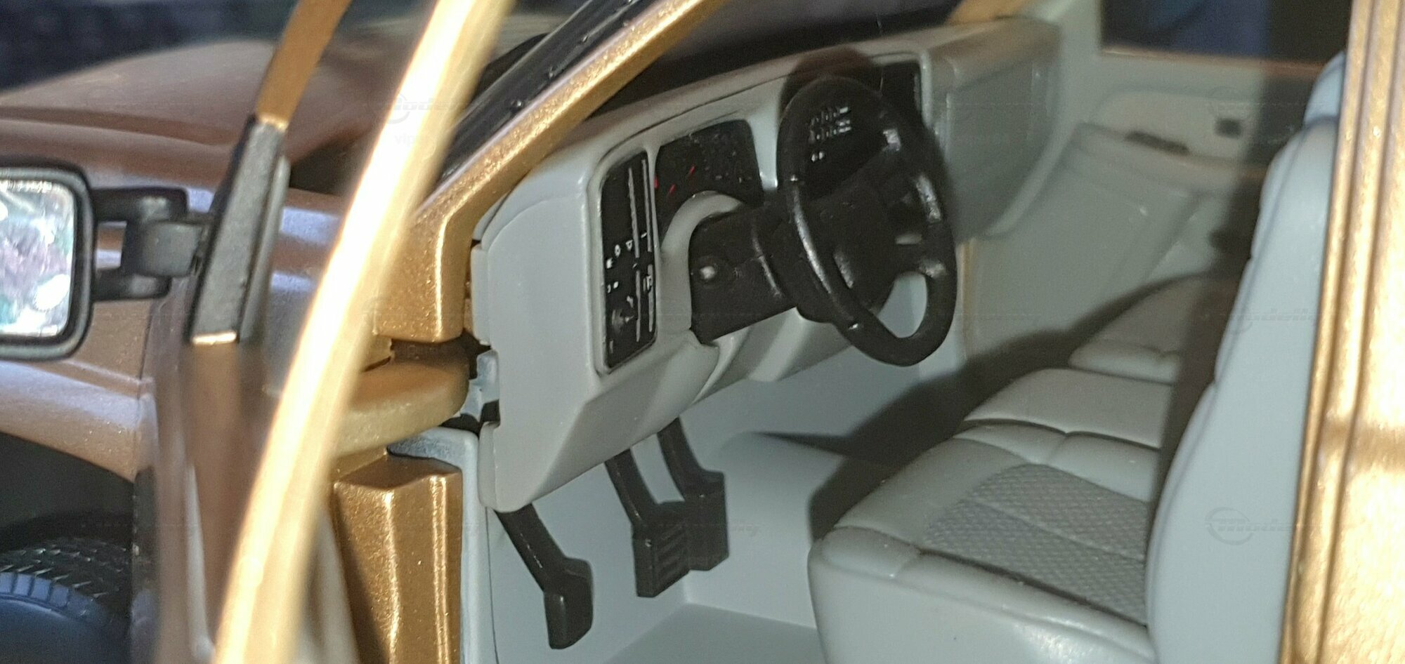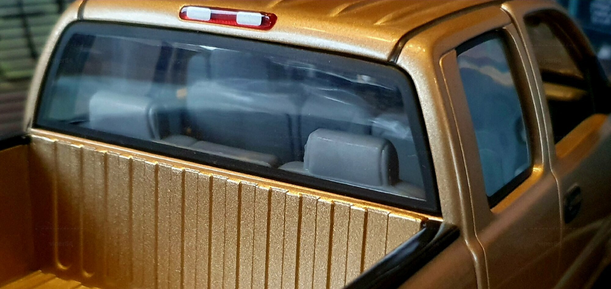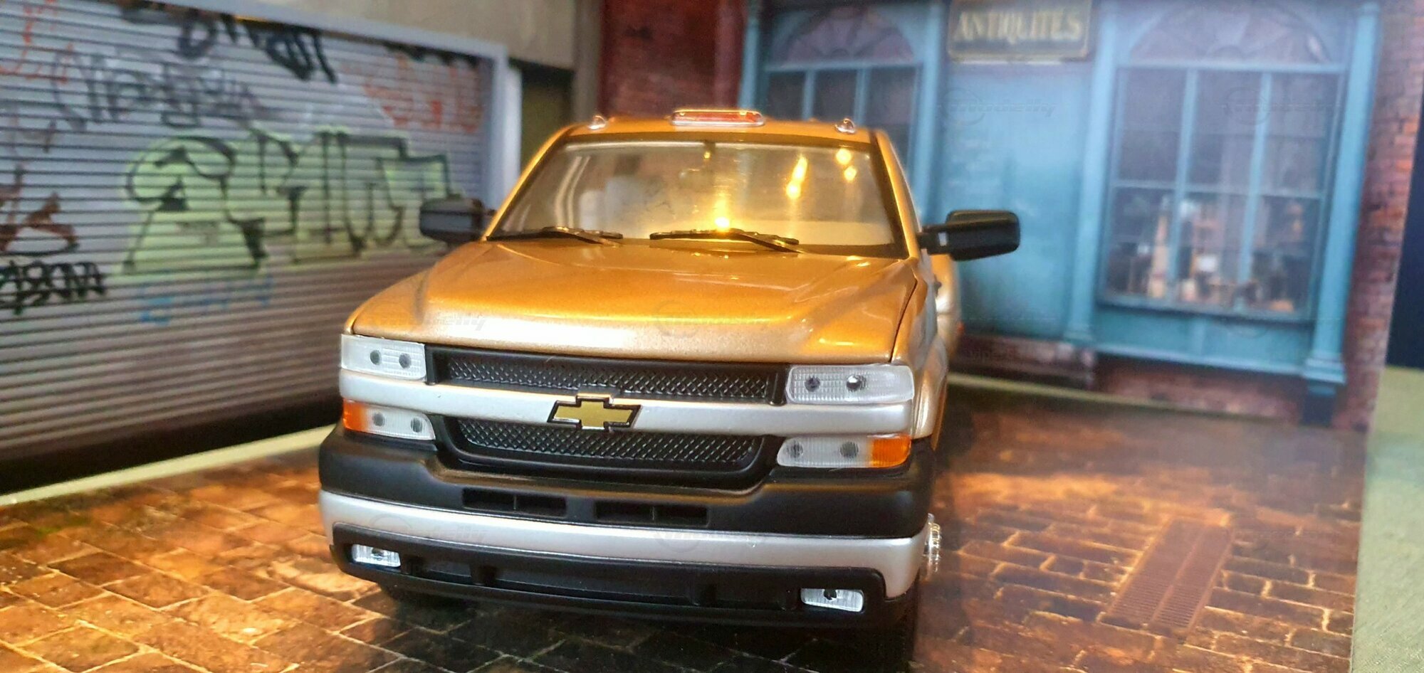 Die Fotos zeigen ein Modellauto im 1:18-Maßstab von Anson, das sich am Chevrolet Silverado 3500 der genannten GMT800-Generation orientiert. Das Exemplar gehört zur Sammlung des Modelly-Mitglieds „viper64“. Das Miniaturfahrzeug ist aus Diecast-Metall gefertigt und weist die für die Dually-Version charakteristischen verbreiterten hinteren Kotflügel auf. Erkennbar ist die Extended-Cab-Kabine mit den typischen kurzen Fondtüren, der lange Ladeboden mit geprägtem Wannenprofil sowie die Clearance-Lights auf dem Kabinendach. Die Front zeigt den zweiteiligen Kühlergrill mit goldfarbenem Bowtie, die übereinander angeordneten Scheinwerfer und die zweiteilige Stoßfängerabdeckung mit schwarzen und silbernen Bereichen. Die Lackierung des Modells wirkt wie ein warmes Gold-Metallic, das im Licht leichte Reflexe zeigt und die Konturen der Motorhaube – inklusive der drei Längssicken – betont. Seitliche Details wie schwarze Türgriffe, Spiegelgehäuse, die „3500“-Beschriftung an der Tür und verchromte Radkappen sind sauber umgesetzt. Im Innenraum ist eine graue Ausstattung zu sehen; vorn sind Armaturenbrett, Lenkrad und Mittelkonsole gut erkennbar, ebenso die hintere Sitzbank der Extended Cab. Das Ladebett zeigt die Riffelstruktur und die Radhauswölbungen der Dually-Ausführung. Auch die klaren Dachmarkierungsleuchten und die in den unteren Stoßfänger integrierten Nebelscheinwerfer sind in den Aufnahmen zu erkennen.