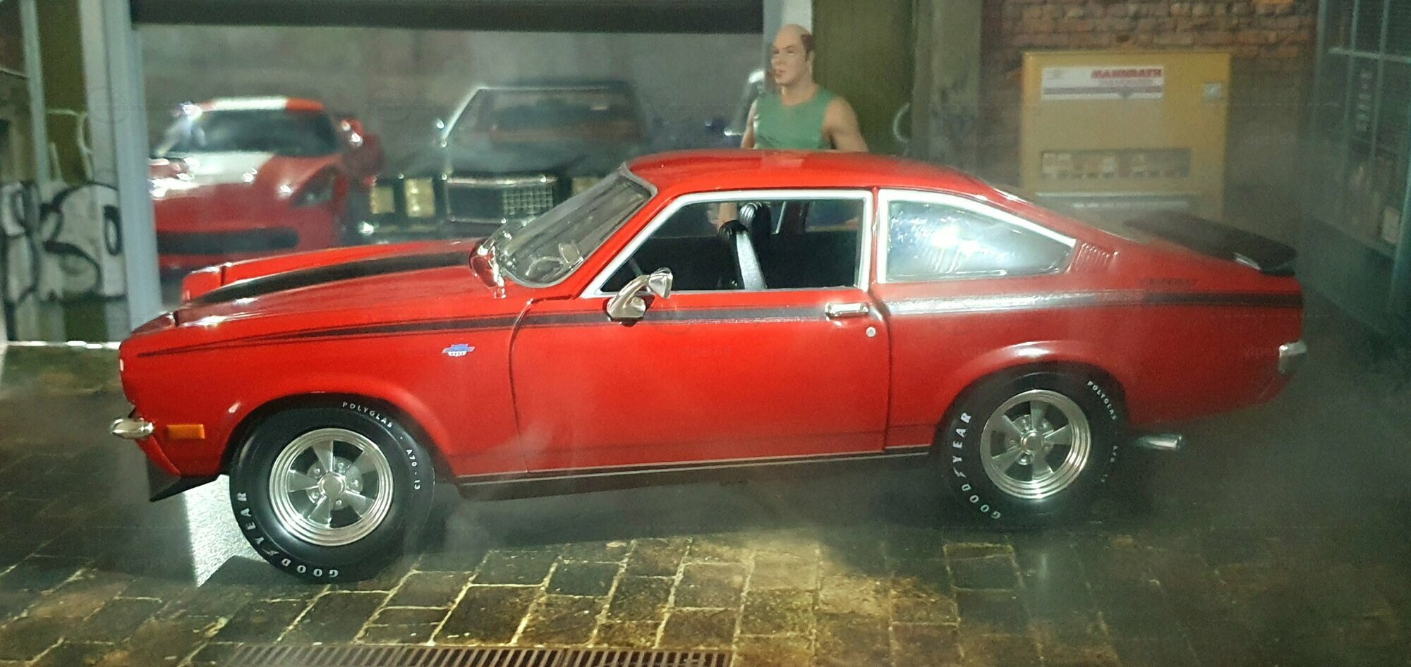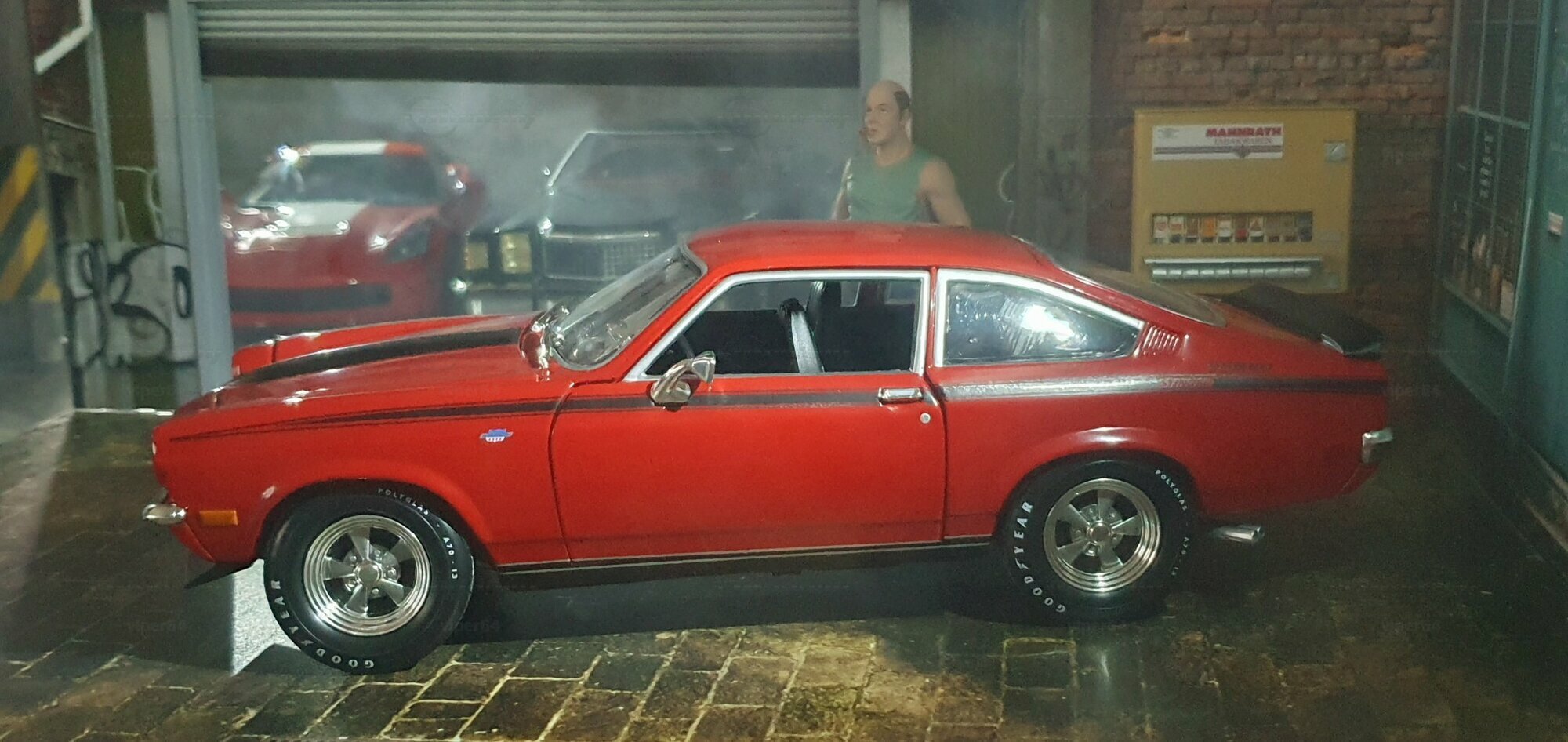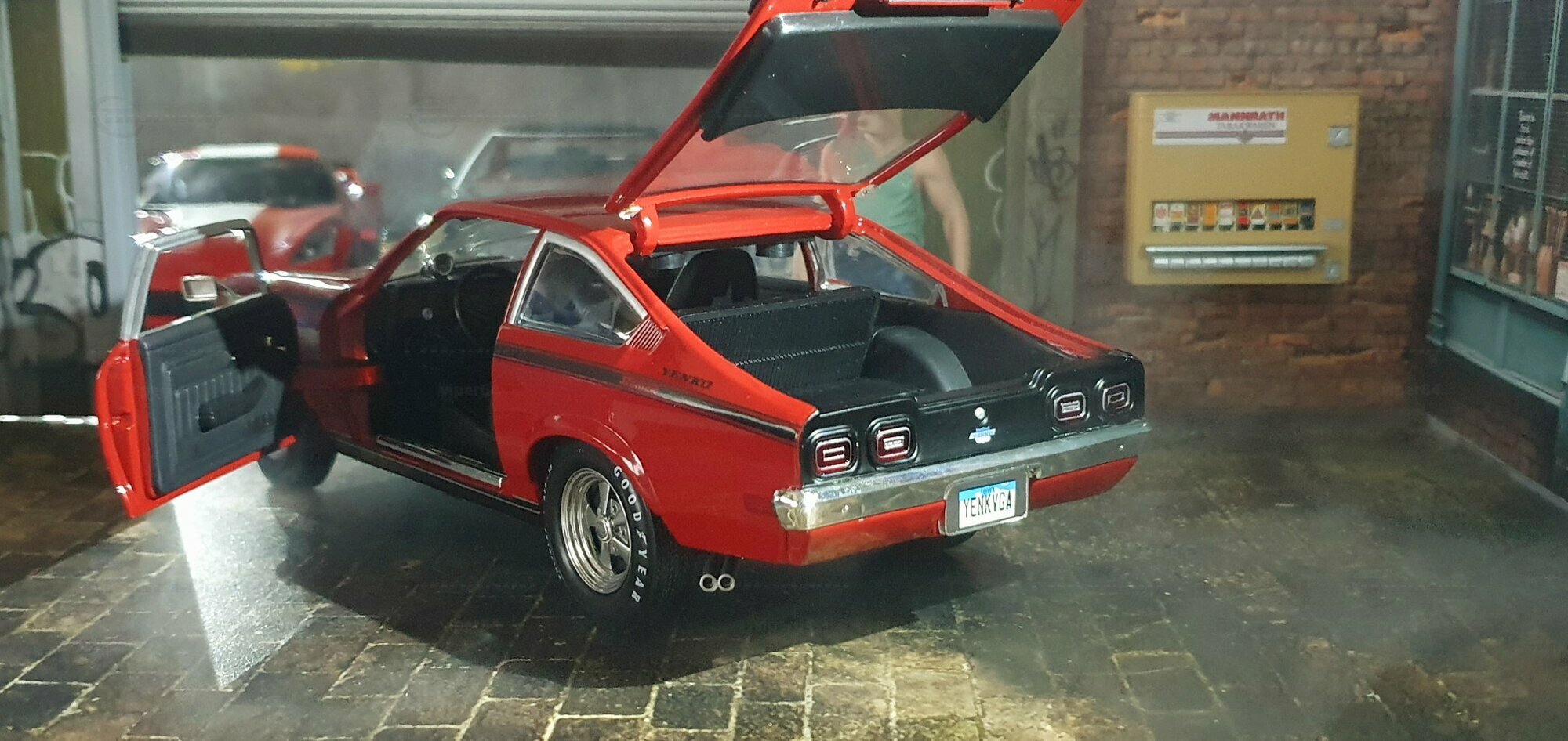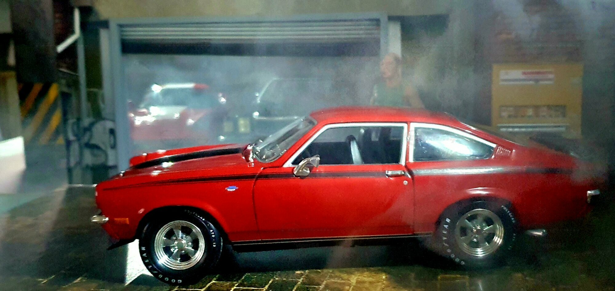 Die Lackierung dieses Diecast‑Modells zeigt eine saubere Kombination aus glänzendem Rot und kontrastierenden schwarzen Applikationen. Die seitliche Dekorlinie läuft von der Front über die Türen bis zum Heckabschluss und wird am Ende durch eine Schraffur und einen Spoiler betont; sie greift damit die typischen grafischen Kennzeichen eines Chevrolet Vega Yenko Stinger auf. In der Frontansicht fällt die flache Haube mit Lufteinlass auf, die Beleuchtung ist mit verchromten Einfassungen nachgebildet, und die Stoßstangen sind als separate Chromteile umgesetzt. Hinten sind Rückleuchteneinheiten, Stoßstange und ein einzelnes Endrohr sichtbar. Alle Abzeichen und Typenschilder erscheinen maßstäblich verkleinert, darunter die kleine Yenko‑Plakette am Kotflügel. Die Fotos wurden in einer Werkstattszenerie aufgenommen; die Perspektive lässt das Modell sachlich und vollständig erkennen. Für Sammler hilfreich: Diese Ausführung ist eine limitierte Auflage in Diecast und wurde von AutoWorld im Maßstab 1:18 produziert. Wer seine Sammlung thematisch nach US‑Kompakten der frühen 1970er gliedert, kann das Modell historisch dem Marktstart des Chevrolet Vega im Jahr 1971 zuordnen – einem Jahr, in dem parallel Ereignisse wie die Mondmission Apollo 14, die Einführung des Intel‑4004‑Chips und die Veröffentlichung des Albums „Imagine“ stattfanden. Diese Rahmendaten verdeutlichen das Alter des Vorbilds und helfen beim zeitlichen Einordnen. Das gezeigte Exemplar von „viper64“ dokumentiert die Linienführung und die zeittypischen Felgen‑/Reifen‑Kombinationen präzise und stellt damit eine gut erkennbare Replik des kompakten Chevrolet Vega mit Yenko‑Anmutung dar.
