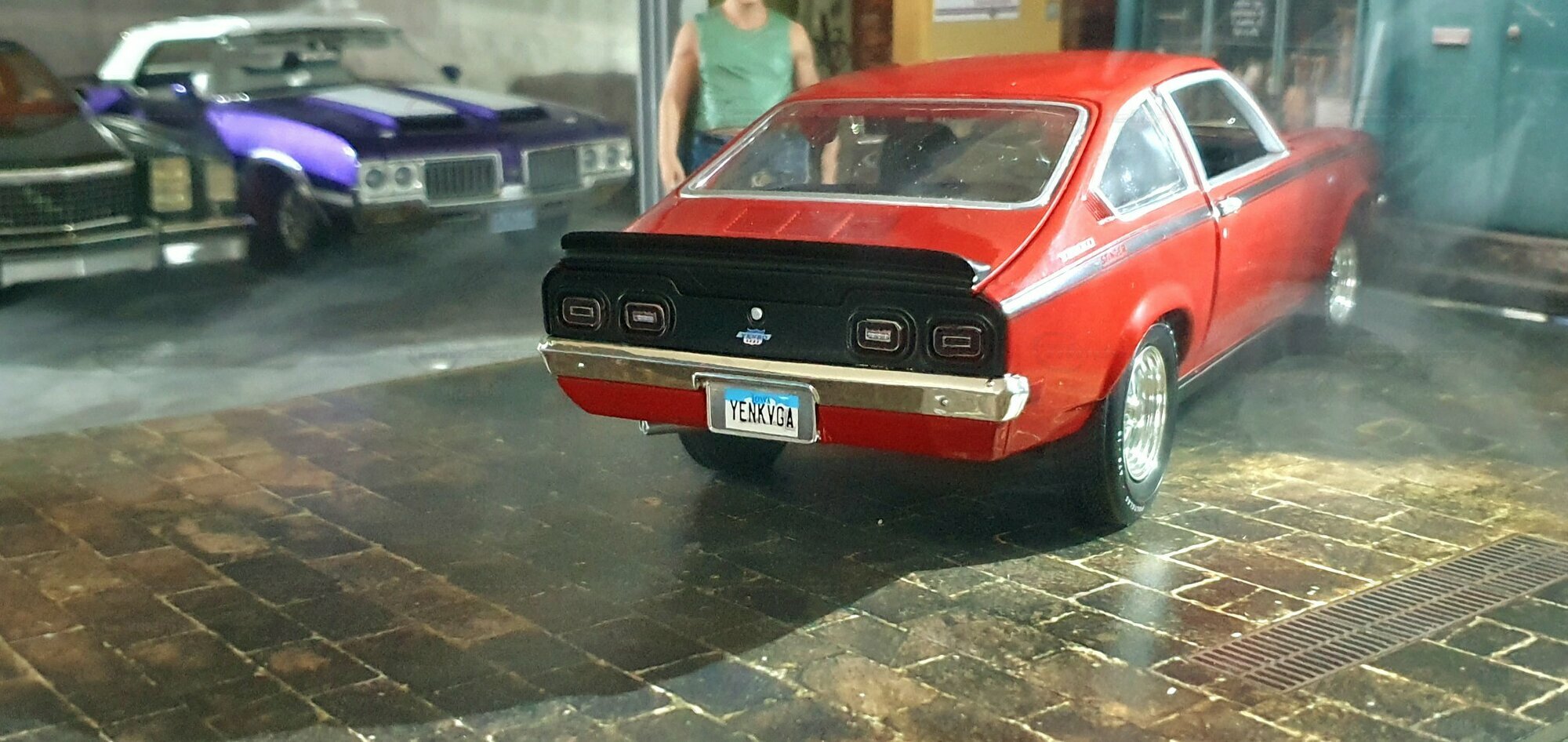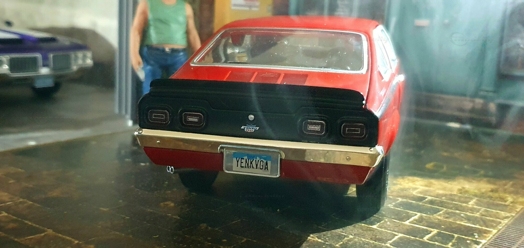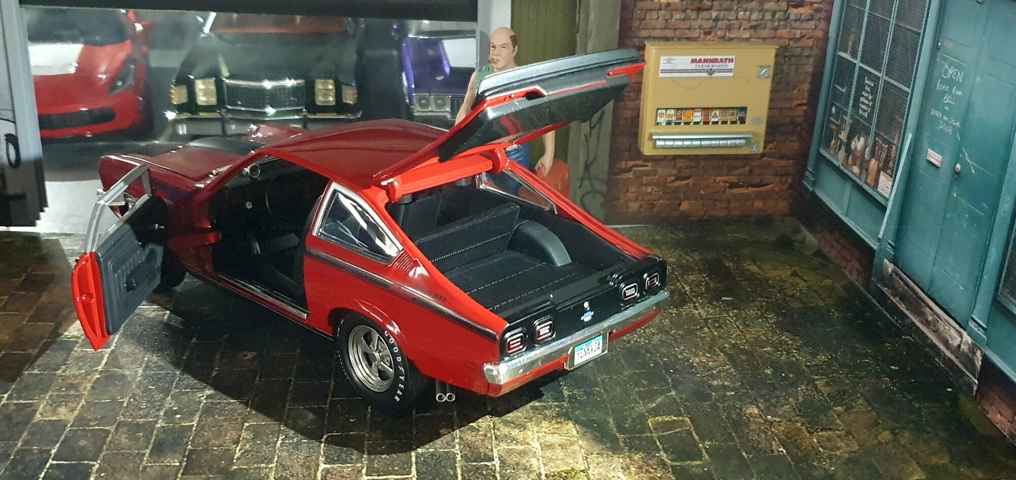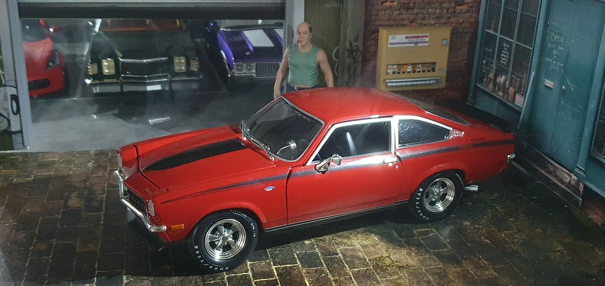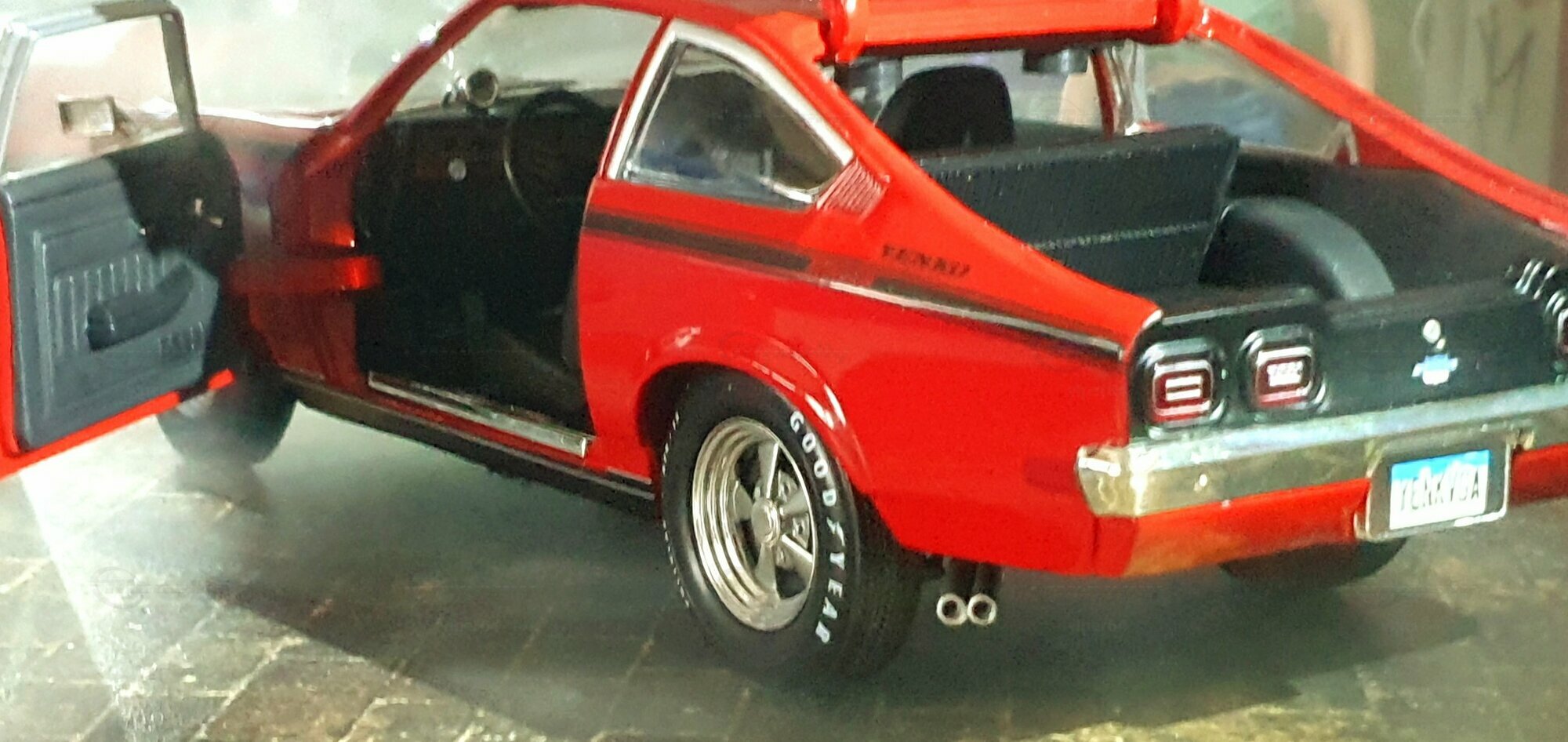 Die Lackierung dieses Diecast‑Modells zeigt eine saubere Kombination aus glänzendem Rot und kontrastierenden schwarzen Applikationen. Die seitliche Dekorlinie läuft von der Front über die Türen bis zum Heckabschluss und wird am Ende durch eine Schraffur und einen Spoiler betont; sie greift damit die typischen grafischen Kennzeichen eines Chevrolet Vega Yenko Stinger auf. In der Frontansicht fällt die flache Haube mit Lufteinlass auf, die Beleuchtung ist mit verchromten Einfassungen nachgebildet, und die Stoßstangen sind als separate Chromteile umgesetzt. Hinten sind Rückleuchteneinheiten, Stoßstange und ein einzelnes Endrohr sichtbar. Alle Abzeichen und Typenschilder erscheinen maßstäblich verkleinert, darunter die kleine Yenko‑Plakette am Kotflügel. Die Fotos wurden in einer Werkstattszenerie aufgenommen; die Perspektive lässt das Modell sachlich und vollständig erkennen. Für Sammler hilfreich: Diese Ausführung ist eine limitierte Auflage in Diecast und wurde von AutoWorld im Maßstab 1:18 produziert. Wer seine Sammlung thematisch nach US‑Kompakten der frühen 1970er gliedert, kann das Modell historisch dem Marktstart des Chevrolet Vega im Jahr 1971 zuordnen – einem Jahr, in dem parallel Ereignisse wie die Mondmission Apollo 14, die Einführung des Intel‑4004‑Chips und die Veröffentlichung des Albums „Imagine“ stattfanden. Diese Rahmendaten verdeutlichen das Alter des Vorbilds und helfen beim zeitlichen Einordnen. Das gezeigte Exemplar von „viper64“ dokumentiert die Linienführung und die zeittypischen Felgen‑/Reifen‑Kombinationen präzise und stellt damit eine gut erkennbare Replik des kompakten Chevrolet Vega mit Yenko‑Anmutung dar.