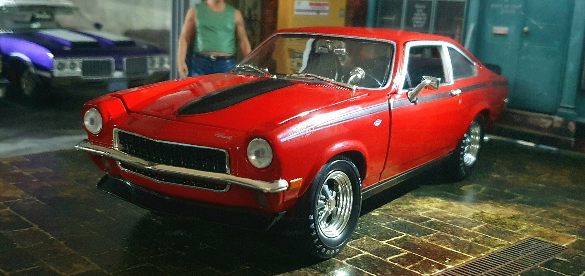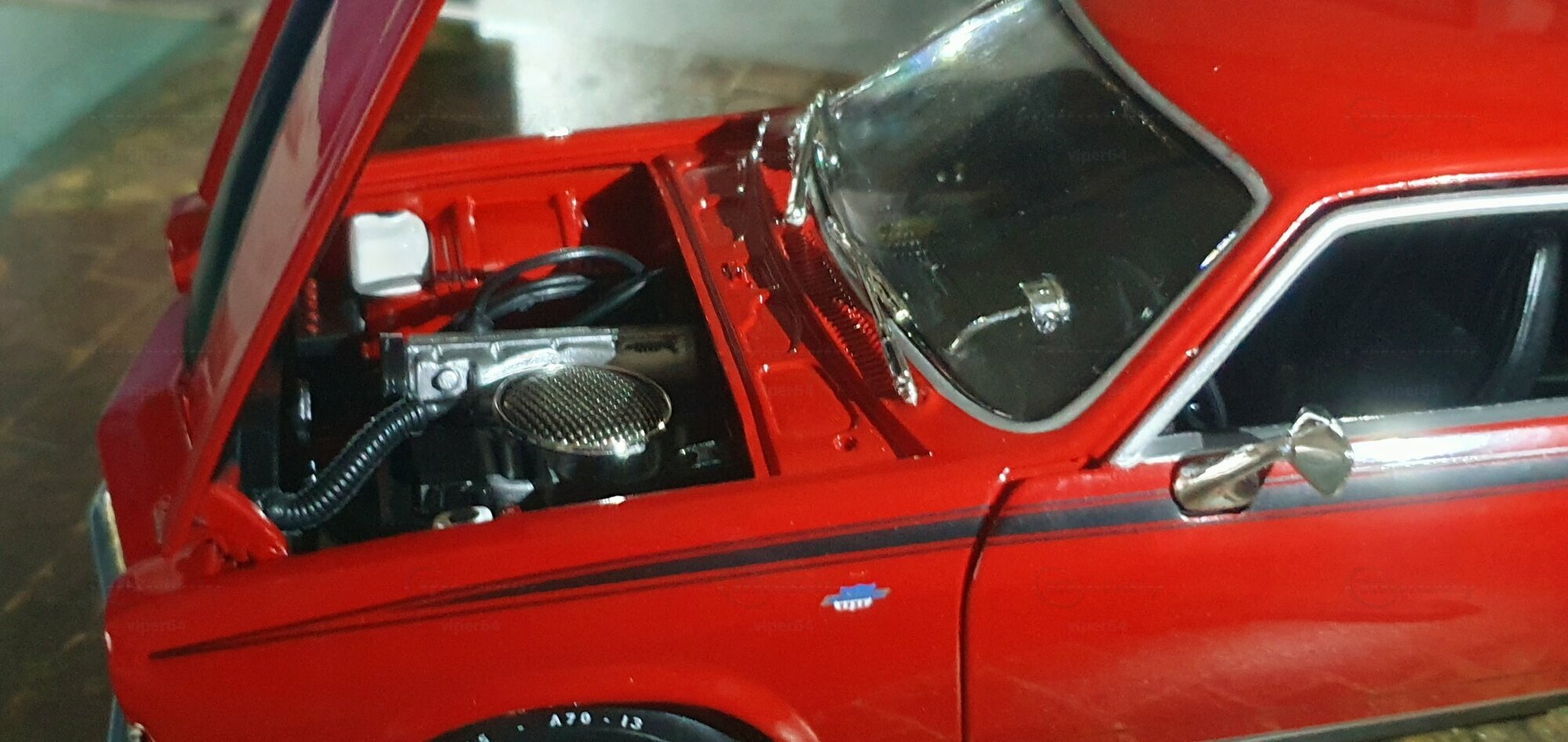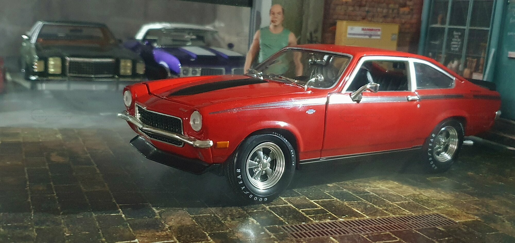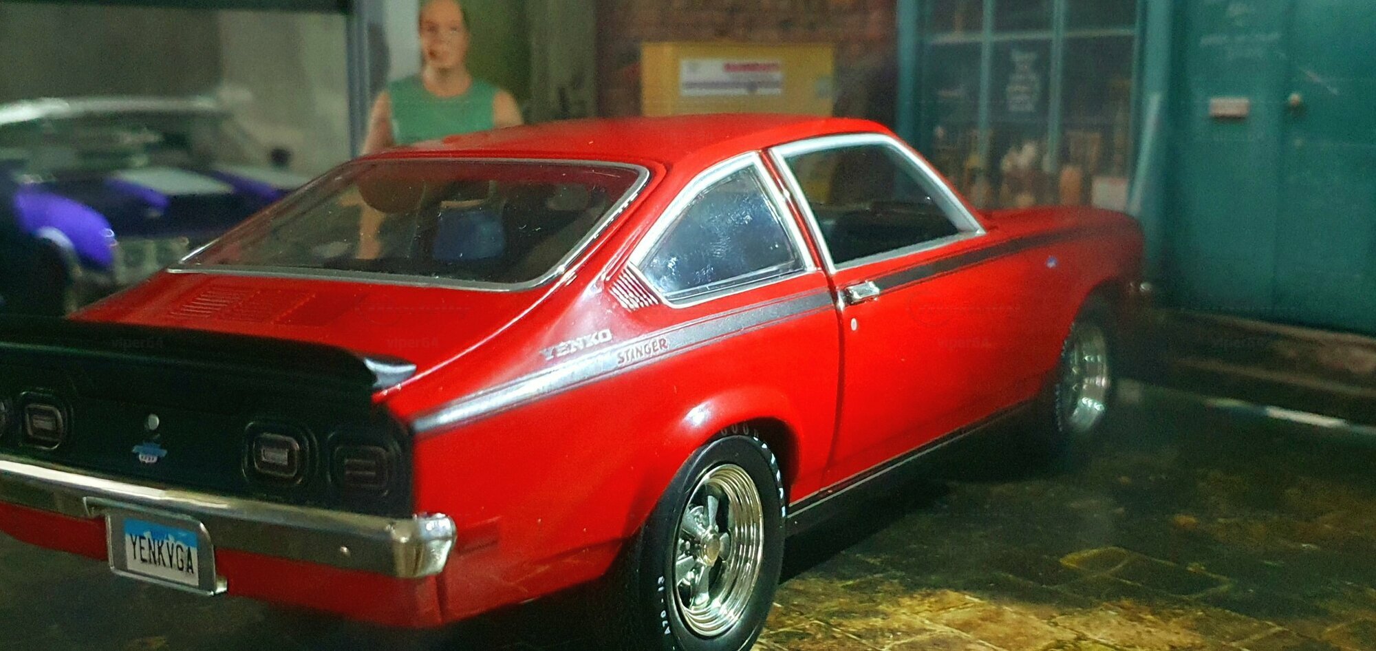 Die Lackierung dieses Diecast‑Modells zeigt eine saubere Kombination aus glänzendem Rot und kontrastierenden schwarzen Applikationen. Die seitliche Dekorlinie läuft von der Front über die Türen bis zum Heckabschluss und wird am Ende durch eine Schraffur und einen Spoiler betont; sie greift damit die typischen grafischen Kennzeichen eines Chevrolet Vega Yenko Stinger auf. In der Frontansicht fällt die flache Haube mit Lufteinlass auf, die Beleuchtung ist mit verchromten Einfassungen nachgebildet, und die Stoßstangen sind als separate Chromteile umgesetzt. Hinten sind Rückleuchteneinheiten, Stoßstange und ein einzelnes Endrohr sichtbar. Alle Abzeichen und Typenschilder erscheinen maßstäblich verkleinert, darunter die kleine Yenko‑Plakette am Kotflügel. Die Fotos wurden in einer Werkstattszenerie aufgenommen; die Perspektive lässt das Modell sachlich und vollständig erkennen. Für Sammler hilfreich: Diese Ausführung ist eine limitierte Auflage in Diecast und wurde von AutoWorld im Maßstab 1:18 produziert. Wer seine Sammlung thematisch nach US‑Kompakten der frühen 1970er gliedert, kann das Modell historisch dem Marktstart des Chevrolet Vega im Jahr 1971 zuordnen – einem Jahr, in dem parallel Ereignisse wie die Mondmission Apollo 14, die Einführung des Intel‑4004‑Chips und die Veröffentlichung des Albums „Imagine“ stattfanden. Diese Rahmendaten verdeutlichen das Alter des Vorbilds und helfen beim zeitlichen Einordnen. Das gezeigte Exemplar von „viper64“ dokumentiert die Linienführung und die zeittypischen Felgen‑/Reifen‑Kombinationen präzise und stellt damit eine gut erkennbare Replik des kompakten Chevrolet Vega mit Yenko‑Anmutung dar.