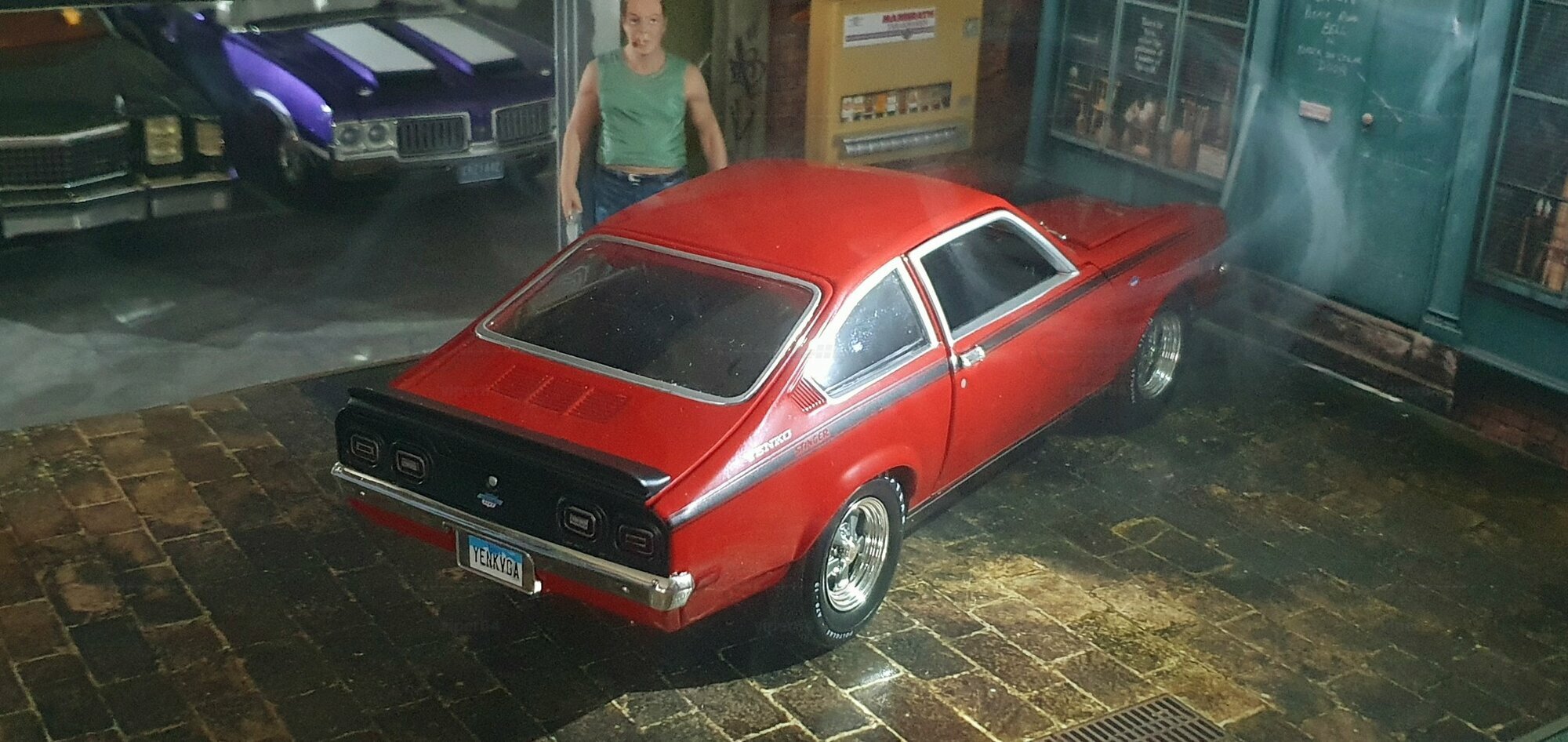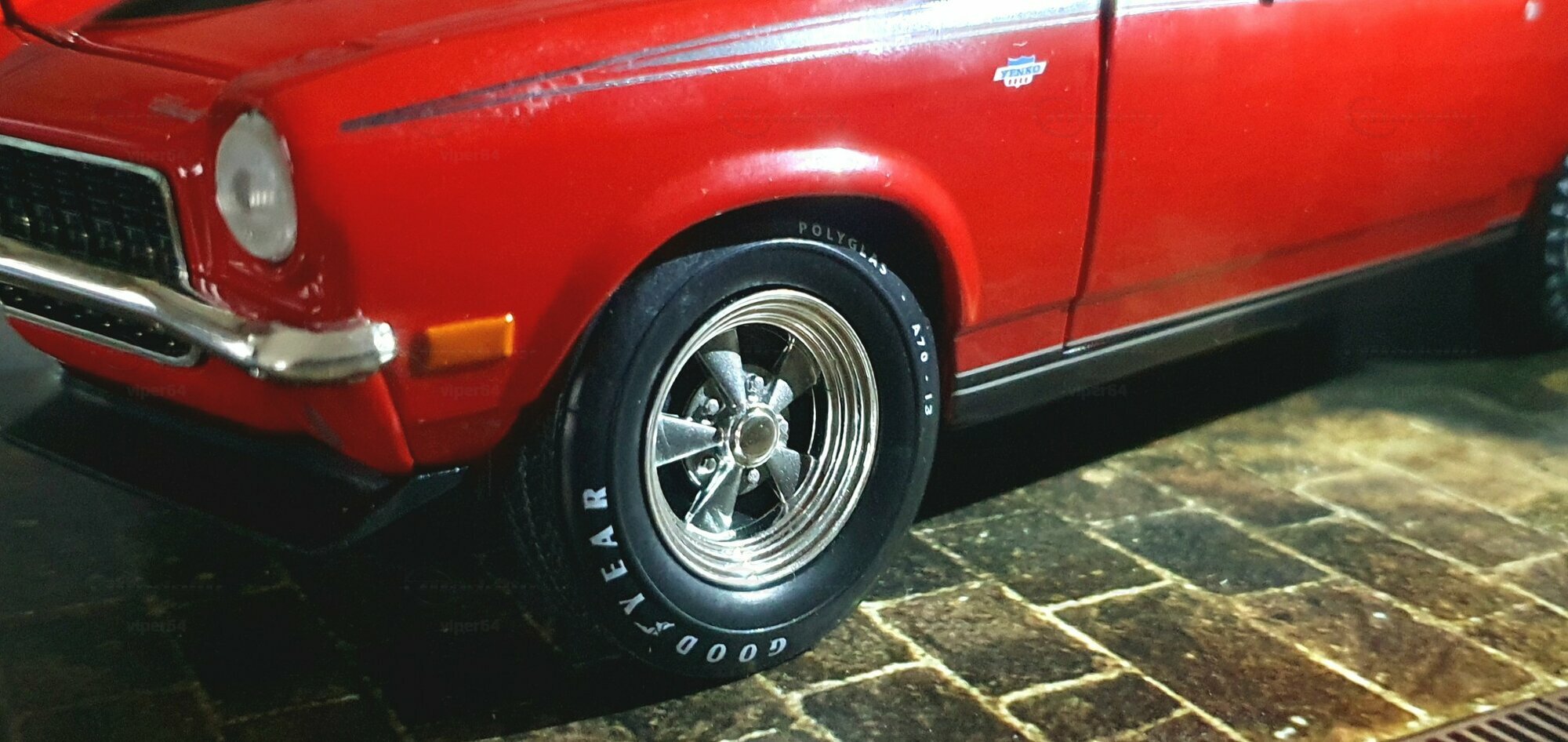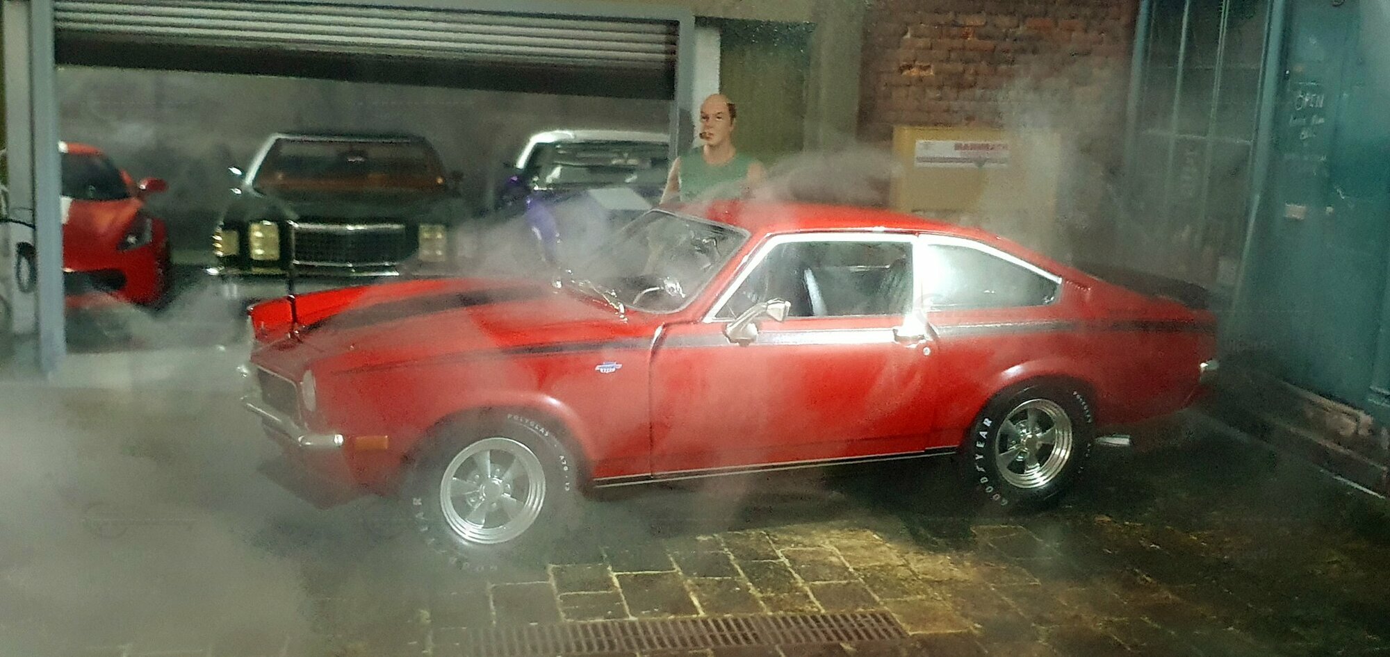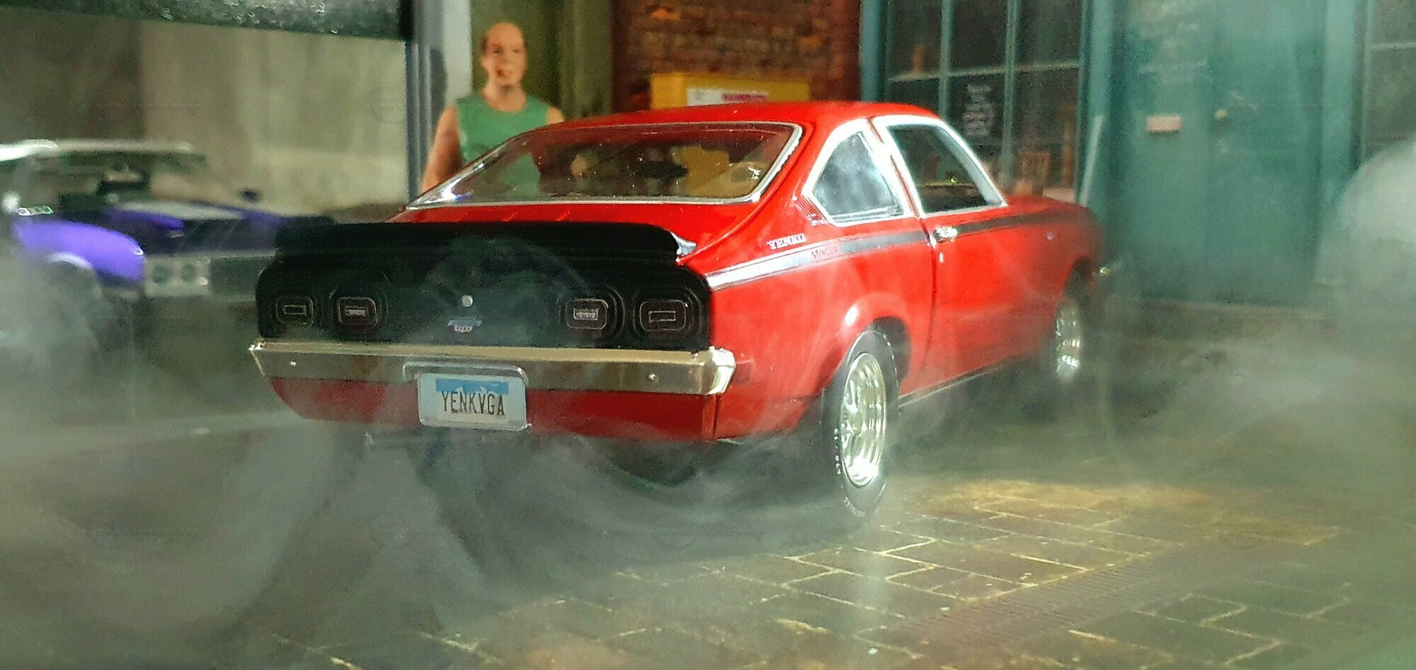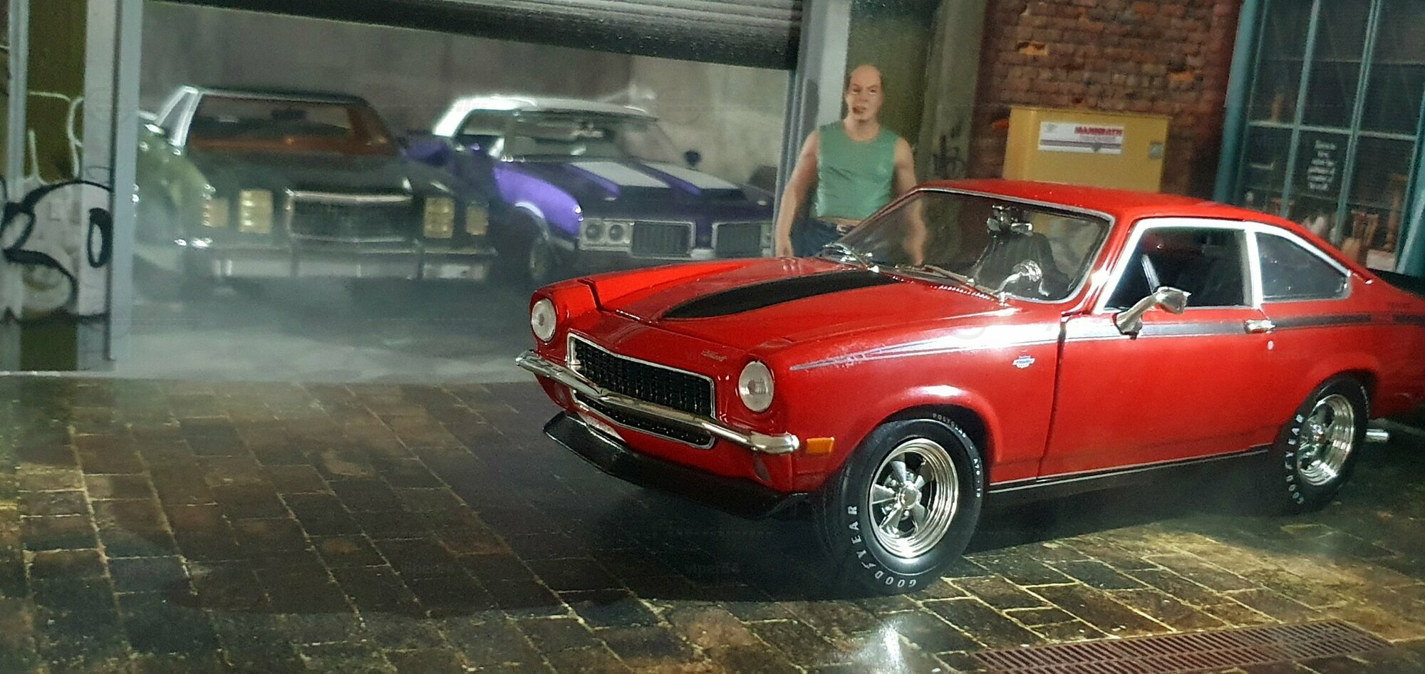 Die Lackierung dieses Diecast‑Modells zeigt eine saubere Kombination aus glänzendem Rot und kontrastierenden schwarzen Applikationen. Die seitliche Dekorlinie läuft von der Front über die Türen bis zum Heckabschluss und wird am Ende durch eine Schraffur und einen Spoiler betont; sie greift damit die typischen grafischen Kennzeichen eines Chevrolet Vega Yenko Stinger auf. In der Frontansicht fällt die flache Haube mit Lufteinlass auf, die Beleuchtung ist mit verchromten Einfassungen nachgebildet, und die Stoßstangen sind als separate Chromteile umgesetzt. Hinten sind Rückleuchteneinheiten, Stoßstange und ein einzelnes Endrohr sichtbar. Alle Abzeichen und Typenschilder erscheinen maßstäblich verkleinert, darunter die kleine Yenko‑Plakette am Kotflügel. Die Fotos wurden in einer Werkstattszenerie aufgenommen; die Perspektive lässt das Modell sachlich und vollständig erkennen. Für Sammler hilfreich: Diese Ausführung ist eine limitierte Auflage in Diecast und wurde von AutoWorld im Maßstab 1:18 produziert. Wer seine Sammlung thematisch nach US‑Kompakten der frühen 1970er gliedert, kann das Modell historisch dem Marktstart des Chevrolet Vega im Jahr 1971 zuordnen – einem Jahr, in dem parallel Ereignisse wie die Mondmission Apollo 14, die Einführung des Intel‑4004‑Chips und die Veröffentlichung des Albums „Imagine“ stattfanden. Diese Rahmendaten verdeutlichen das Alter des Vorbilds und helfen beim zeitlichen Einordnen. Das gezeigte Exemplar von „viper64“ dokumentiert die Linienführung und die zeittypischen Felgen‑/Reifen‑Kombinationen präzise und stellt damit eine gut erkennbare Replik des kompakten Chevrolet Vega mit Yenko‑Anmutung dar.