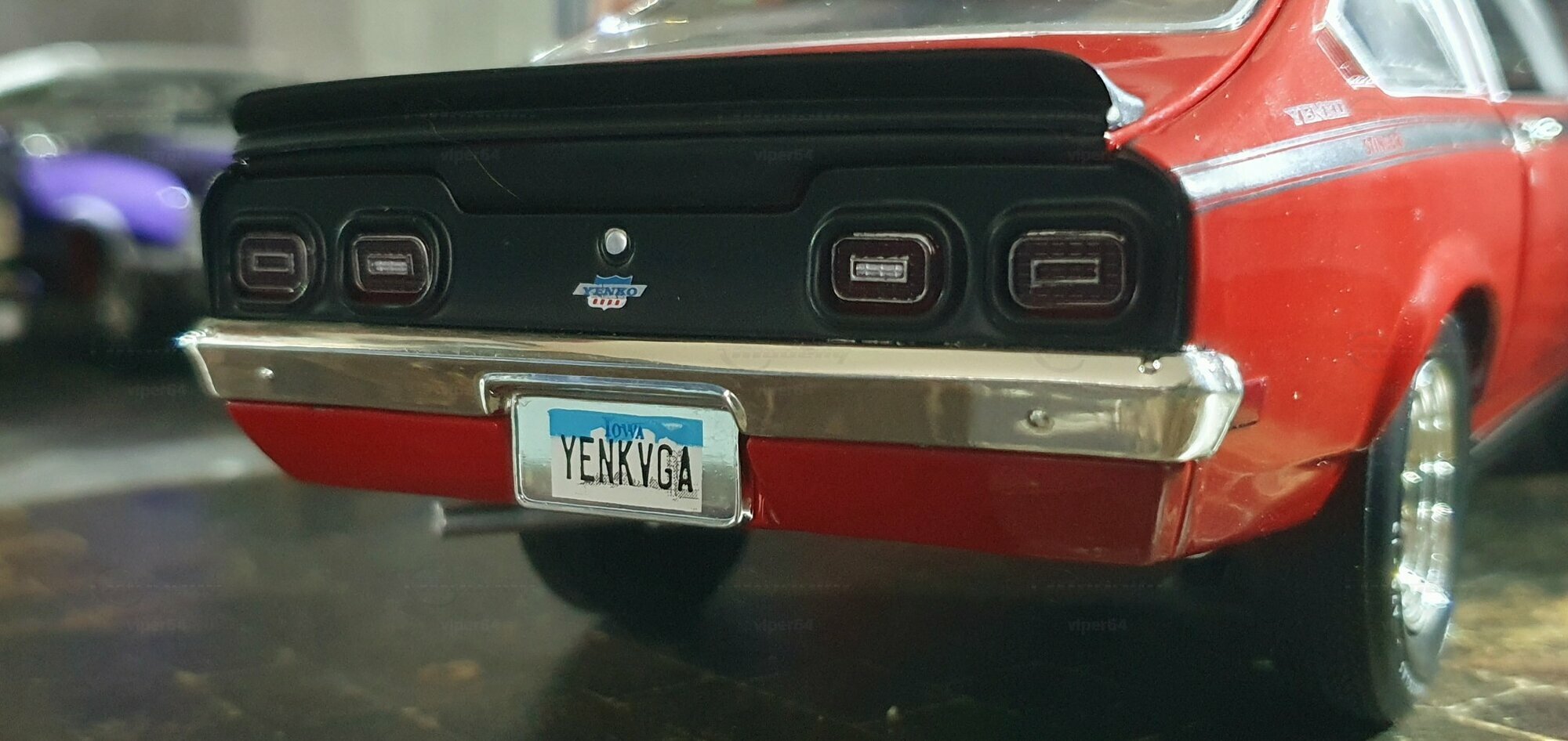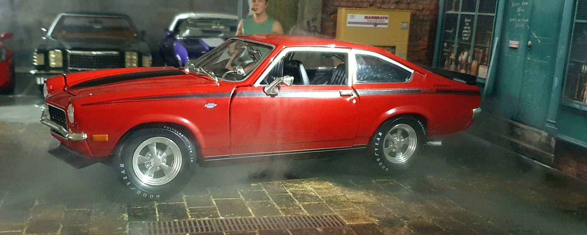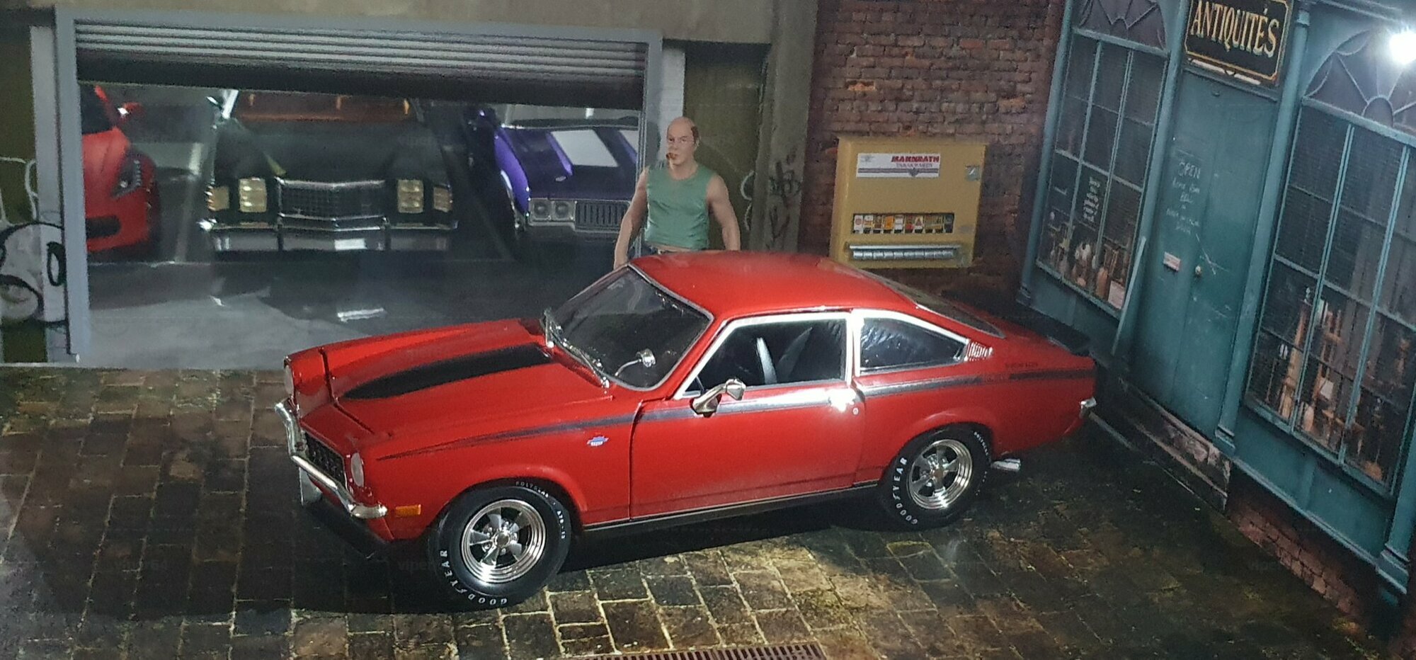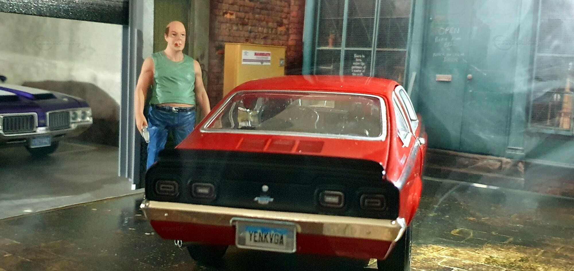 Die Lackierung dieses Diecast‑Modells zeigt eine saubere Kombination aus glänzendem Rot und kontrastierenden schwarzen Applikationen. Die seitliche Dekorlinie läuft von der Front über die Türen bis zum Heckabschluss und wird am Ende durch eine Schraffur und einen Spoiler betont; sie greift damit die typischen grafischen Kennzeichen eines Chevrolet Vega Yenko Stinger auf. In der Frontansicht fällt die flache Haube mit Lufteinlass auf, die Beleuchtung ist mit verchromten Einfassungen nachgebildet, und die Stoßstangen sind als separate Chromteile umgesetzt. Hinten sind Rückleuchteneinheiten, Stoßstange und ein einzelnes Endrohr sichtbar. Alle Abzeichen und Typenschilder erscheinen maßstäblich verkleinert, darunter die kleine Yenko‑Plakette am Kotflügel. Die Fotos wurden in einer Werkstattszenerie aufgenommen; die Perspektive lässt das Modell sachlich und vollständig erkennen. Für Sammler hilfreich: Diese Ausführung ist eine limitierte Auflage in Diecast und wurde von AutoWorld im Maßstab 1:18 produziert. Wer seine Sammlung thematisch nach US‑Kompakten der frühen 1970er gliedert, kann das Modell historisch dem Marktstart des Chevrolet Vega im Jahr 1971 zuordnen – einem Jahr, in dem parallel Ereignisse wie die Mondmission Apollo 14, die Einführung des Intel‑4004‑Chips und die Veröffentlichung des Albums „Imagine“ stattfanden. Diese Rahmendaten verdeutlichen das Alter des Vorbilds und helfen beim zeitlichen Einordnen. Das gezeigte Exemplar von „viper64“ dokumentiert die Linienführung und die zeittypischen Felgen‑/Reifen‑Kombinationen präzise und stellt damit eine gut erkennbare Replik des kompakten Chevrolet Vega mit Yenko‑Anmutung dar.