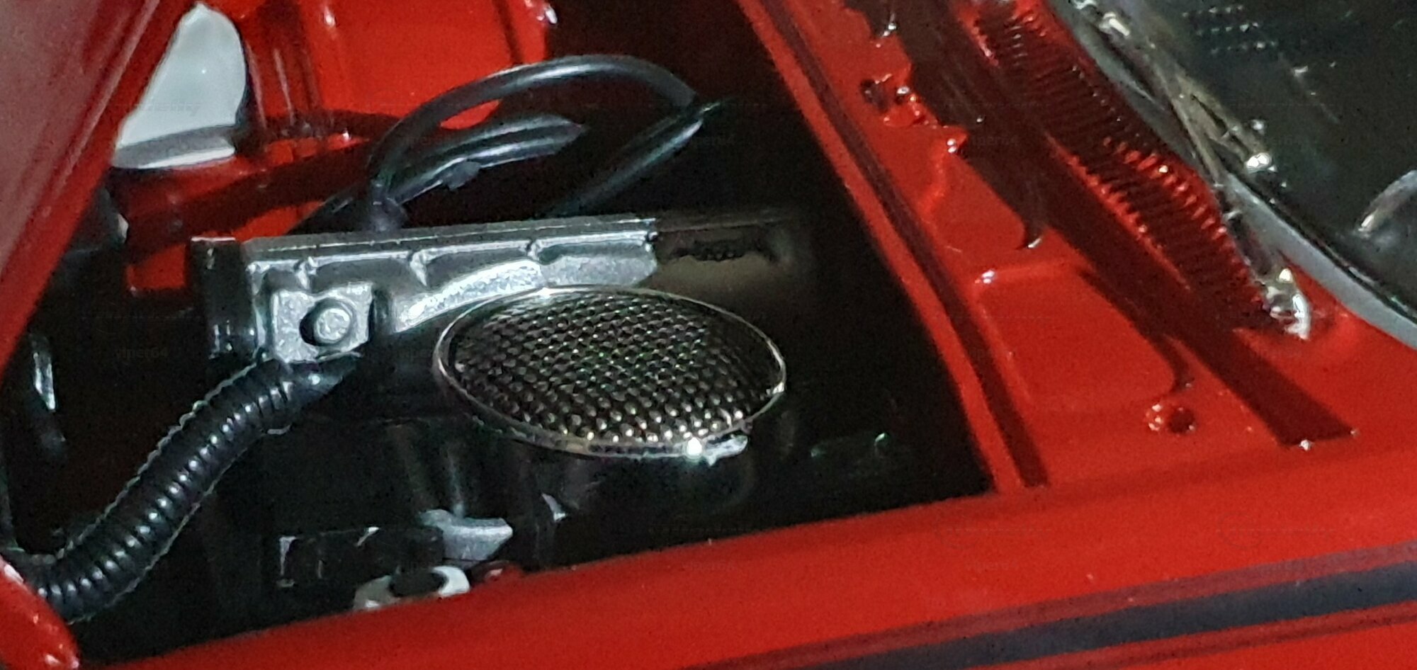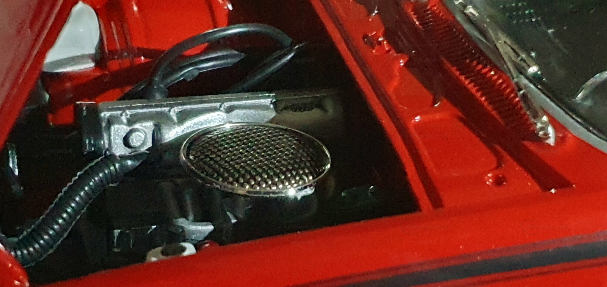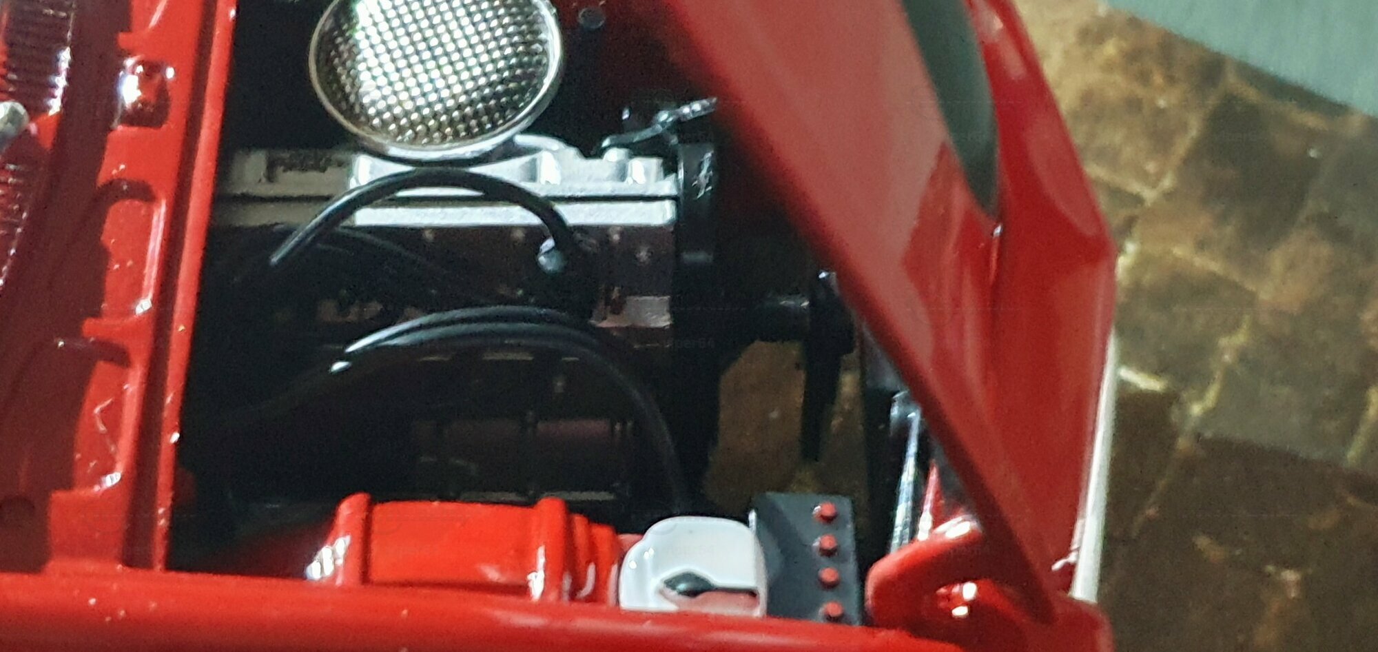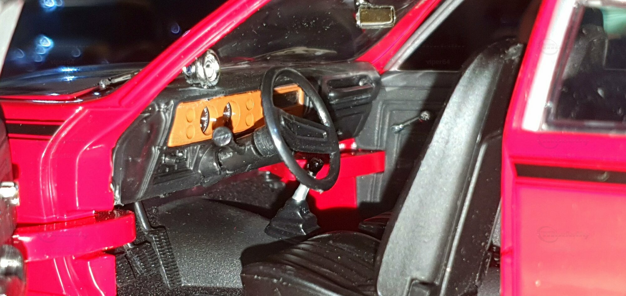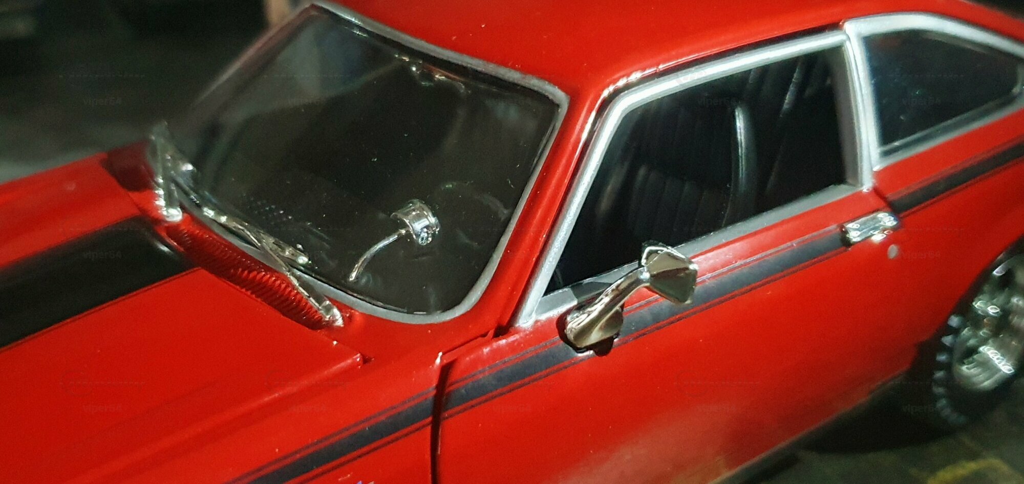 Die Lackierung dieses Diecast‑Modells zeigt eine saubere Kombination aus glänzendem Rot und kontrastierenden schwarzen Applikationen. Die seitliche Dekorlinie läuft von der Front über die Türen bis zum Heckabschluss und wird am Ende durch eine Schraffur und einen Spoiler betont; sie greift damit die typischen grafischen Kennzeichen eines Chevrolet Vega Yenko Stinger auf. In der Frontansicht fällt die flache Haube mit Lufteinlass auf, die Beleuchtung ist mit verchromten Einfassungen nachgebildet, und die Stoßstangen sind als separate Chromteile umgesetzt. Hinten sind Rückleuchteneinheiten, Stoßstange und ein einzelnes Endrohr sichtbar. Alle Abzeichen und Typenschilder erscheinen maßstäblich verkleinert, darunter die kleine Yenko‑Plakette am Kotflügel. Die Fotos wurden in einer Werkstattszenerie aufgenommen; die Perspektive lässt das Modell sachlich und vollständig erkennen. Für Sammler hilfreich: Diese Ausführung ist eine limitierte Auflage in Diecast und wurde von AutoWorld im Maßstab 1:18 produziert. Wer seine Sammlung thematisch nach US‑Kompakten der frühen 1970er gliedert, kann das Modell historisch dem Marktstart des Chevrolet Vega im Jahr 1971 zuordnen – einem Jahr, in dem parallel Ereignisse wie die Mondmission Apollo 14, die Einführung des Intel‑4004‑Chips und die Veröffentlichung des Albums „Imagine“ stattfanden. Diese Rahmendaten verdeutlichen das Alter des Vorbilds und helfen beim zeitlichen Einordnen. Das gezeigte Exemplar von „viper64“ dokumentiert die Linienführung und die zeittypischen Felgen‑/Reifen‑Kombinationen präzise und stellt damit eine gut erkennbare Replik des kompakten Chevrolet Vega mit Yenko‑Anmutung dar.