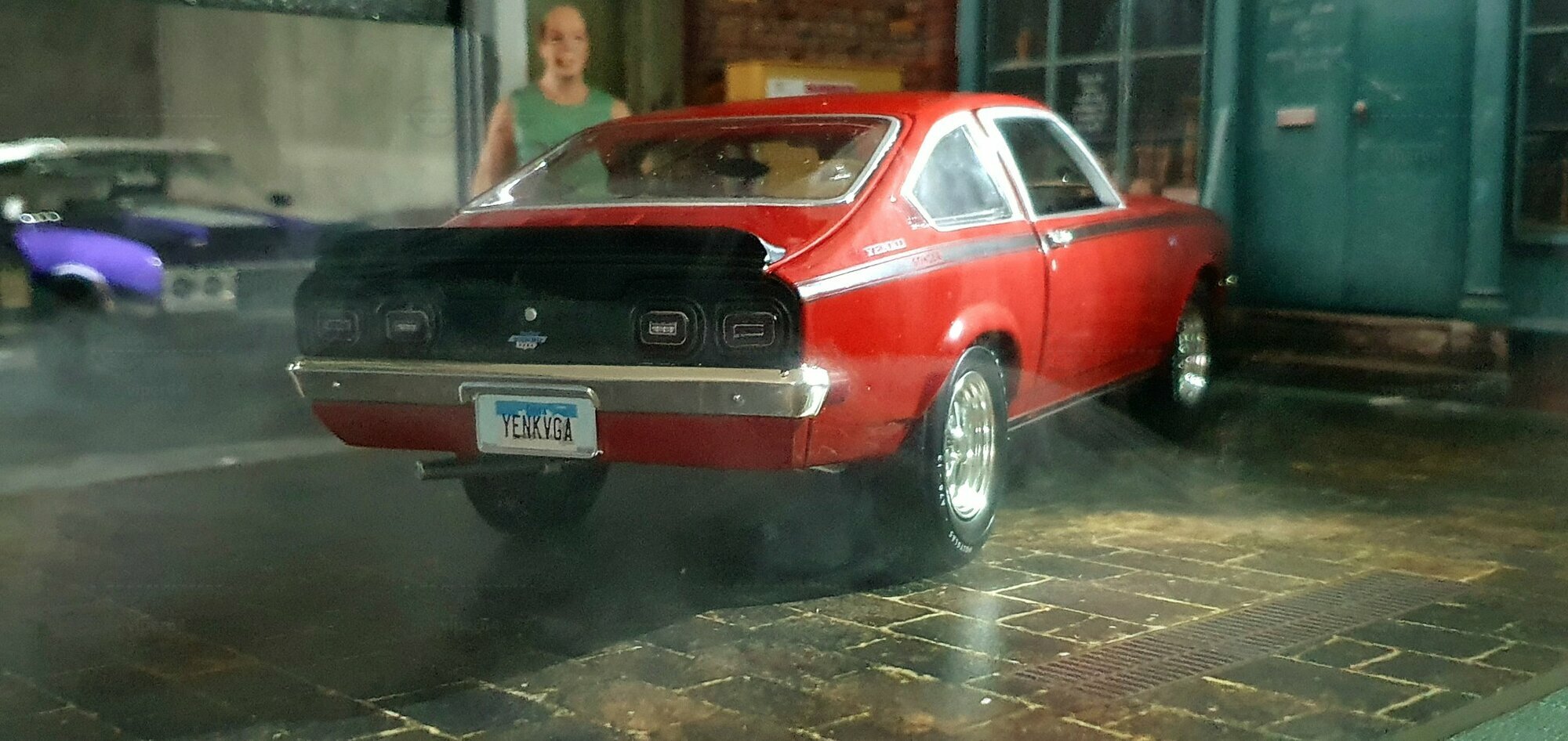 Der hier gezeigte Miniaturwagen orientiert sich am kompakten US‑Serienfahrzeug Chevrolet Vega und an einem der von Don Yenko veredelten Ableger wie dem Chevrolet Vega Yenko Stinger beziehungsweise dem selten genannten Chevrolet Vega Yenko Sprint. Der Chevrolet Vega gehörte zur 1. Generation und wurde von 1971–1977 gebaut. General Motors positionierte den Chevrolet Vega als H‑Body‑Baureihe unterhalb von Nova und Camaro, um der wachsenden Nachfrage nach kompakten Fahrzeugen zu begegnen. Einen direkten Vorgänger im GM‑Programm gab es nicht; in der Rolle eines kleineren Chevy war zuvor der luftgekühlte Corvair aktiv, jedoch in anderer technischer Auslegung. Das Styling des Chevrolet Vega entstand im GM‑Designstudio unter Leitung von Bill Mitchell, während die konzeptionelle Unterstützung für den leichten Vierzylinder und das neue Produktionsverfahren auch von Ed Cole innerhalb des GM‑Managements vorangetrieben wurde. Das Startjahr 1971 lässt sich zeitlich einordnen: Die Mission Apollo 14 landete im Februar 1971 auf dem Mond, der Mikroprozessor Intel 4004 kam 1971 auf den Markt und John Lennon veröffentlichte „Imagine“. Diese Beispiele dienen lediglich der zeitlichen Einordnung der Epoche, in der der Chevrolet Vega erschien.