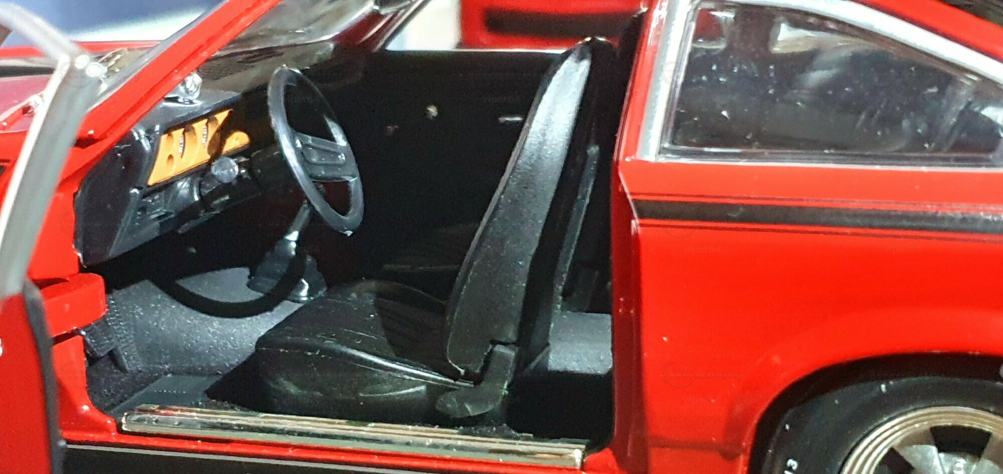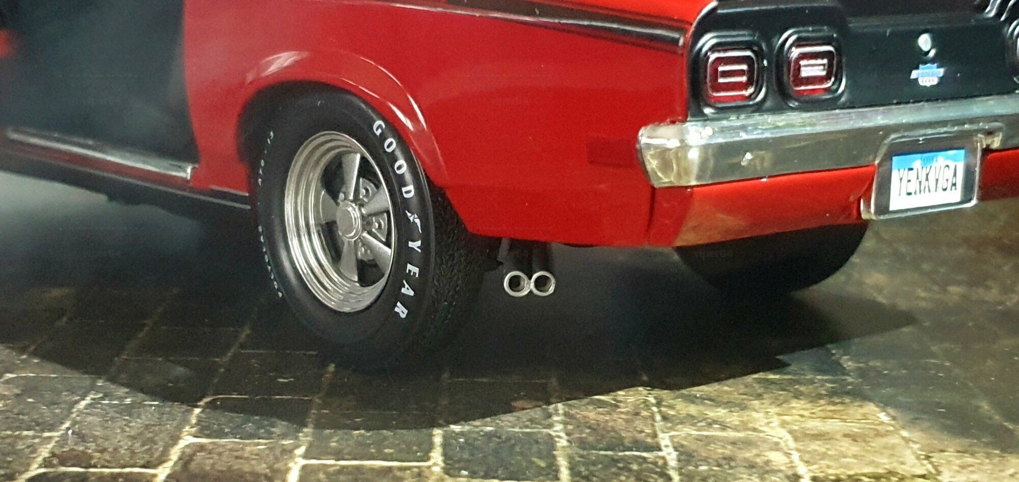 Die Fotos zeigen ein Modellauto im Maßstab 1:18 von AutoWorld aus der Sammlung des Modelly‑Mitglieds „viper64“. Es handelt sich um eine Ausführung in Diecast‑Druckguss, was für ein solides Grundgewicht und klar abgegrenzte Kanten an Karosserieteilen sorgt. Der Hersteller setzt an Stoßfängern, Spiegeln und Scheibenrahmen auf separat eingesetzte Bauteile; die Spaltmaße der Türen und das formgegebene Heck mit Spoiler bilden die Linien des Chevrolet Vega stimmig nach. Die Modellkarosserie trägt eine rot lackierte Oberfläche mit schwarzen Elementen: eine längs verlaufende Seitenlinie, ein dunkles Power‑Domes‑Element auf der Haube und ein Heckspoiler. Auf den vorderen Kotflügeln ist das typisch schildförmige Yenko‑Badge zu erkennen; die Aufschrift erinnert an die Streifenpakete der Yenko‑Sondermodelle des Chevrolet Vega. Die fünf‑speichigen Chromräder mit Schriftzugreifen „Goodyear Polyglas GT“ geben dem Modell eine zeittypische Optik. Im Innenraum sind schwarze Schalensitze, Gurte und ein klassisches Dreispeichenlenkrad sichtbar. Diese Ausführung wurde in einer limitierten Auflage hergestellt; Sammler erhalten damit eine klar definierte Stückzahl. Da es sich um ein Modellauto im Maßstab 1:18 von AutoWorld handelt, passt es in Vitrinen mit gängigen 1:18‑Abmessungen und ist mit anderen US‑Kompaktfahrzeugen dieser Ära gut kombinierbar.