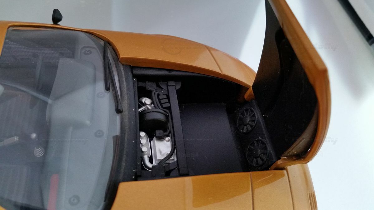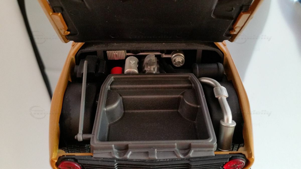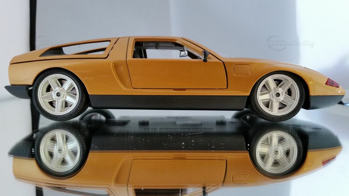 Das hier gezeigte Modell im Maßstab 1:18 stammt vom renommierten Modellhersteller Guiloy und spiegelt die charakteristischen Merkmale des Originals getreu wider. Der Einsatz von Diecast-Material bei der Herstellung dieses Modells sorgt für eine robuste und trotzdem detailreiche Nachbildung. Die Lackierung des Modells ist in glänzendem Gold gehalten, mit zwei markanten schwarzen Streifen auf der Motorhaube, die den sportlichen Charakter des Originals betonen. Die Felgen, deren Hersteller nicht eindeutig identifizierbar ist, wirken mit ihrem fünf-speichigen Design modern und elegant.