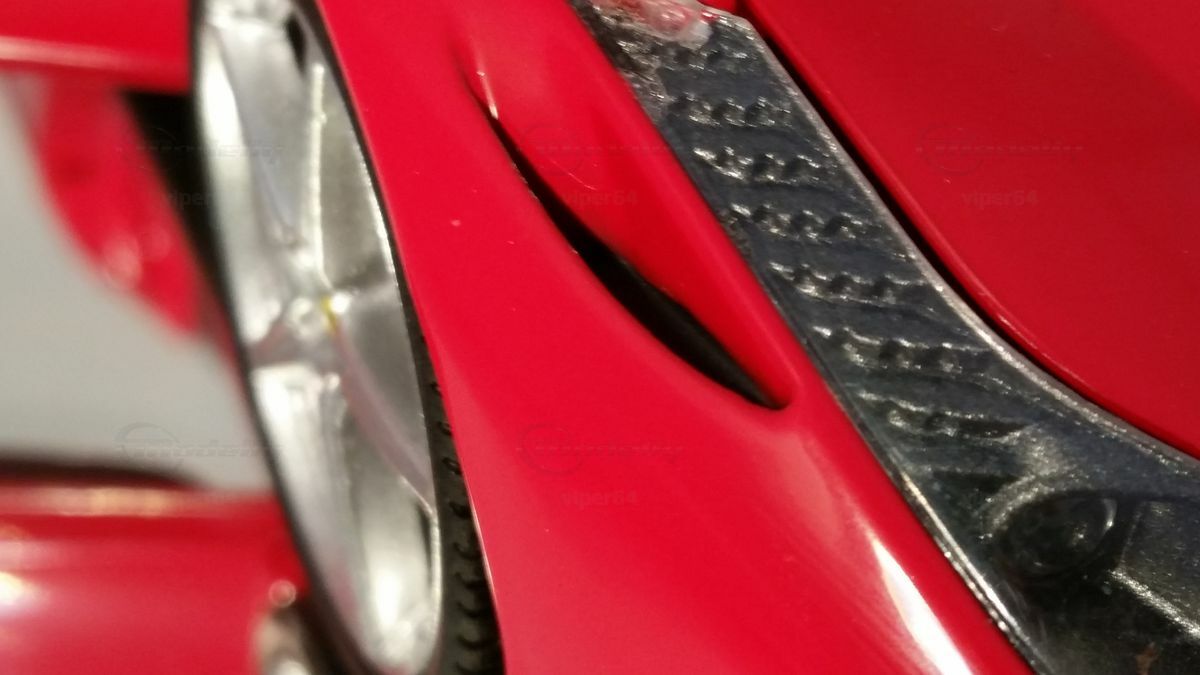 Die Front besteht ganz aus einem aerodynamischen „Maul“, auf dem sich zwei große seitliche Lufteinlässe zur Kühlung der Motorflüssigkeiten befinden. Der Mittelteil besitzt Unterteilungen und Profile, die entwickelt wurden, um die Luft zu den Kühlern und zum Unterboden zu leiten. Dabei fließt diese durch den unteren Teil des Stoßfängers und die Säule in dessen Mitte. Die zwei am zentralen Teil verankerten Flügel tragen zur Erhöhung der Effizienz oder zur Verringerung des Widerstands bei hoher Geschwindigkeit bei. Im unteren Bereich erinnert die Gestaltung der seitlichen Volumen an zwei Flossen, die als Verkleidung der Radkästen dienen, während das schwebende Mittelvolumen zur Verkleidung des Dreifach-Auspuffs dient. Eine suggestive Wahl mit starker Anlehnung an den F40, die diesem Wagen sein extrem sportliches Aussehen verleiht. Der Motor ist der Tradition der sportlichen V8-Zylindermodelle von Ferrari getreu durch die Heckscheibe sichtbar.