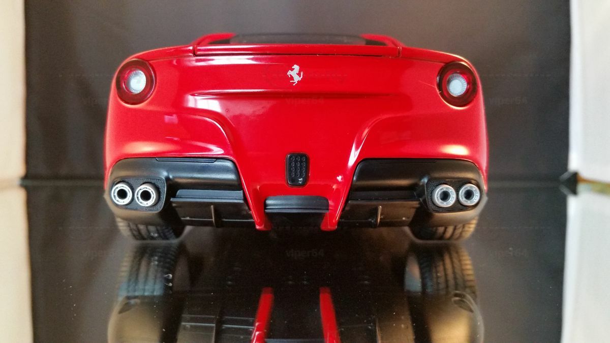 Das Heck des F12berlinetta zeichnet sich durch eine moderne und funktionelle Neuinterpretation des Kammhecks aus, das nahtlos in die beiden Heckdiffusoren integriert ist. Die daraus resultierende T-Form umfasst auch die beiden runden LED-Hecklichter und den von der Formel 1 übernommenen Hecknebelscheinwerfer.