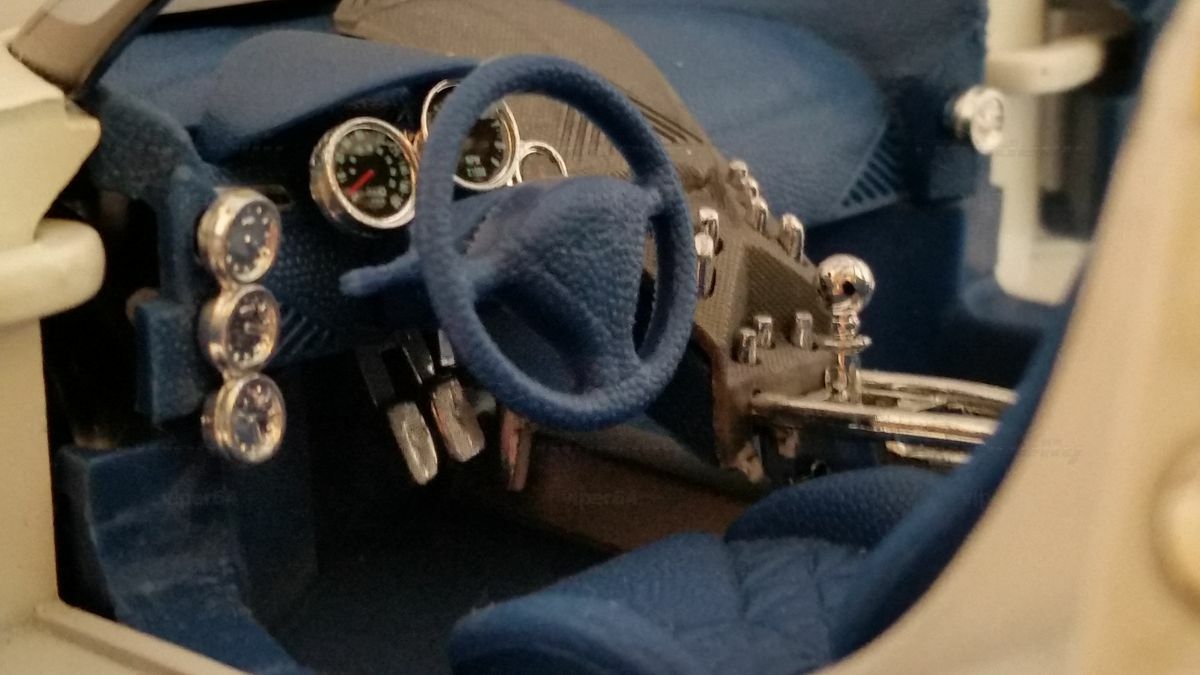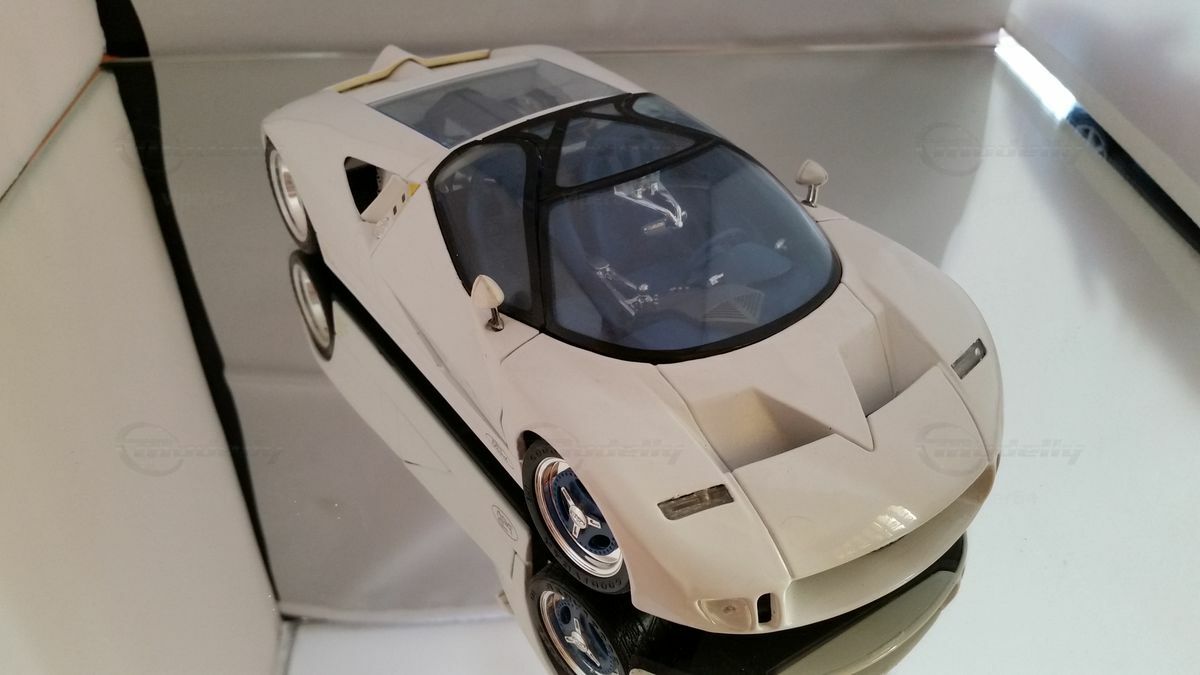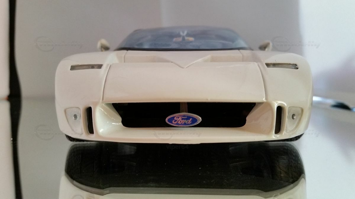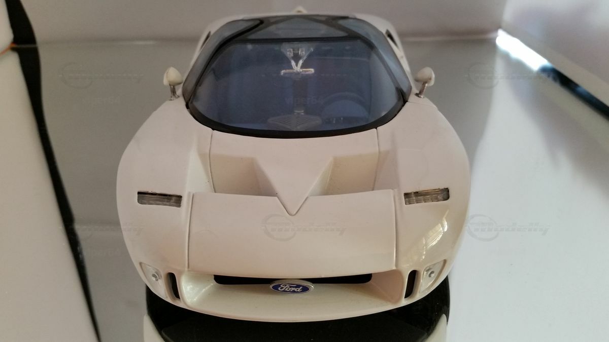 Die Miniatur dieses ikonischen Konzeptfahrzeugs, hergestellt von Maisto im Maßstab 1:18, zeigt eine hohe Detailtreue und Qualität. Die Lackierung in Weiß, kombiniert mit den blauen Akzenten auf den Felgen, spiegelt die futuristische Farbgebung des Originalfahrzeugs wider. Auffällig sind die präzise nachgebildete Front mit ihren scharfen Linien und die aerodynamischen Lüftungsschlitze, die das Konzept des Originals wiedergeben. Darüber hinaus ist das Logo des Ford GT90 an der Seite des Modells sichtbar, was die Authentizität weiter unterstreicht. Dieses Modellauto ist aus Druckgussmaterial hergestellt, was seine Robustheit und Langlebigkeit garantiert. In der Sammlung von Modelly-Mitglied "viper64" nimmt diese Nachbildung des Ford GT90 einen besonderen Platz ein und ist für jeden Sammler ein wertvolles Stück.