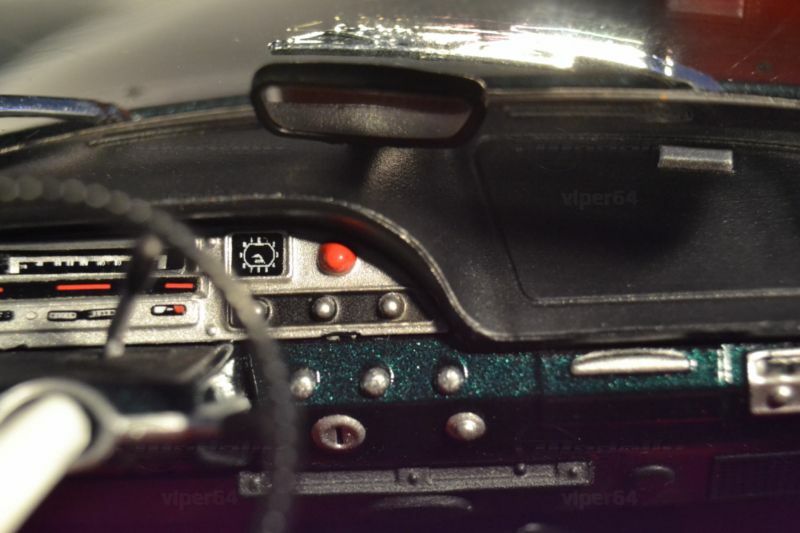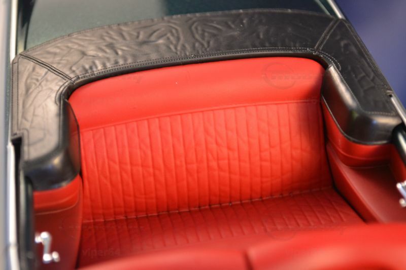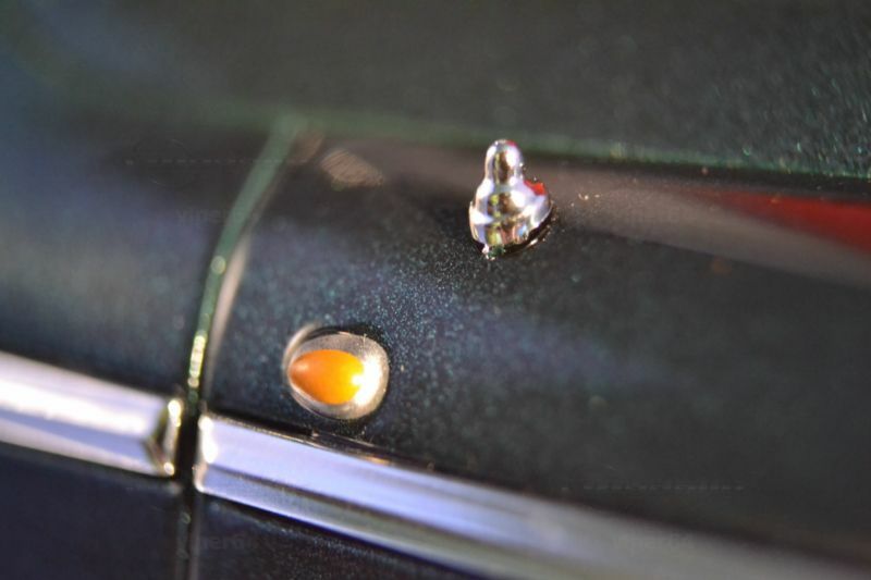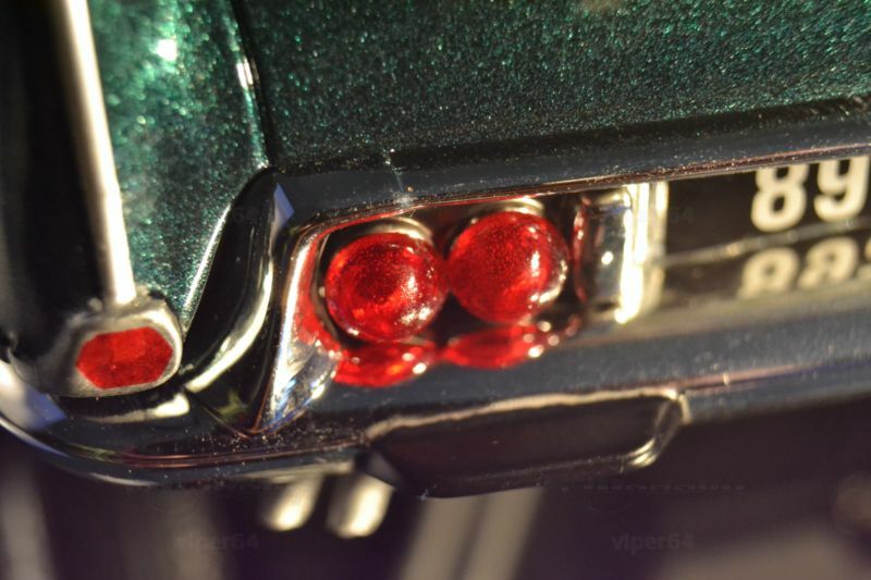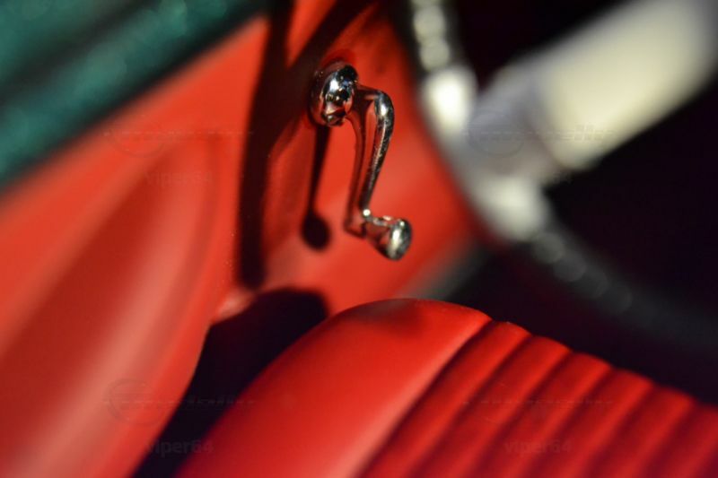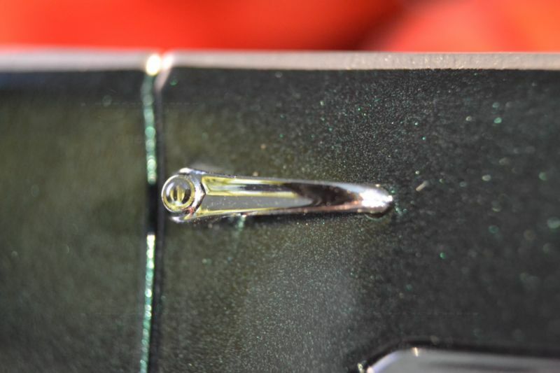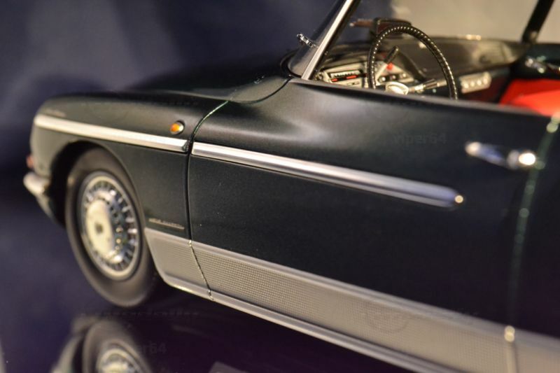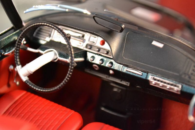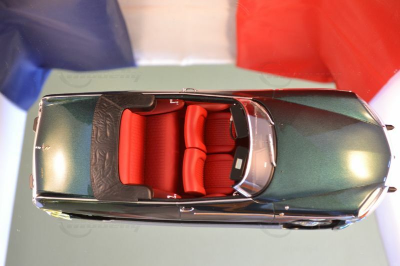Die feine Lackierung in einem tiefen Metallic-Grün, kombiniert mit den silbernen Akzenten und dem roten Interieur, lässt das Miniaturmodell besonders authentisch und ästhetisch ansprechend erscheinen. Die Türen, der Kofferraum und die Motorhaube sind beweglich, was die Detailtreue und spielerische Eignung des Modells unterstreicht. Ein Blick ins Innere des Modells enthüllt eine detailgetreue Nachbildung des Interieurs, komplett mit roten Sitzen und einem realitätsnah gestalteten Armaturenbrett.