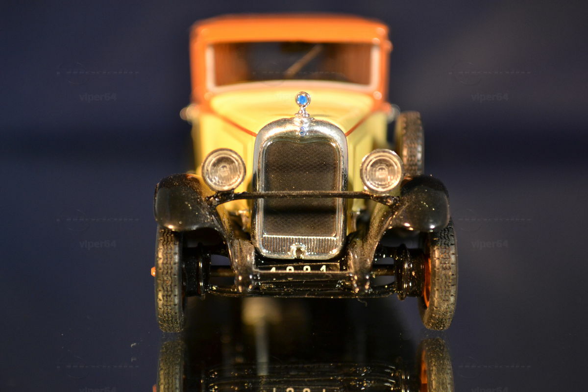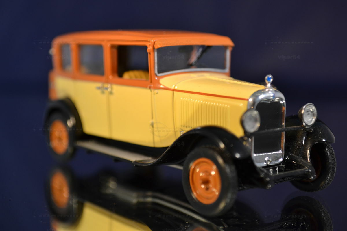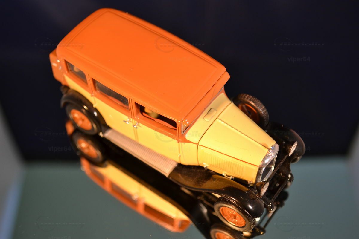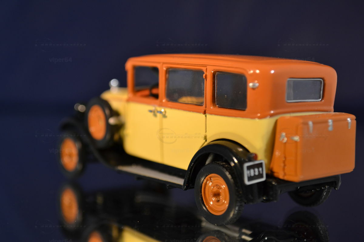 Für Sammler von Autominiaturen ist der 1:43 Maßstab des Citroen C4F Familiale, hergestellt von Universal Hobbies, ein besonderes Highlight. Dieses Modell ist präzise aus Diecast-Material gefertigt und fängt die wesentlichen Details und die klassische Form des Originals ein. Im Rahmen der Sammlung des Modelly Mitglieds "viper64" zeigt dieses Modell einen hohen Standard an Verarbeitungsqualität und Detailtreue. Die zweifarbige Lackierung in kräftigem Orange und sanftem Gelb verleiht dem Modell ein authentisches Aussehen, das an die Farbschemata der frühen 30er Jahre erinnert. Besonders auffällig sind die trommelförmigen Radkappen und die charakteristischen Linien des Körpers, die die Eleganz und den Stil des Citroen C4F Familiale bewahren.