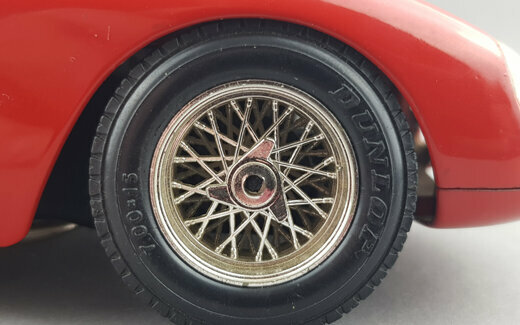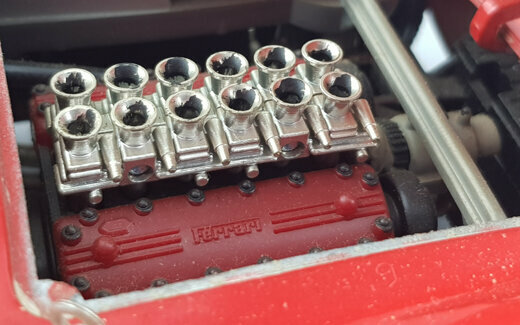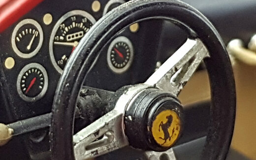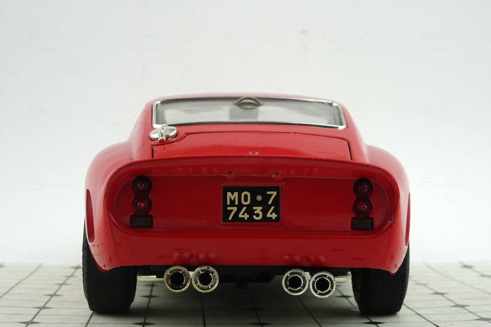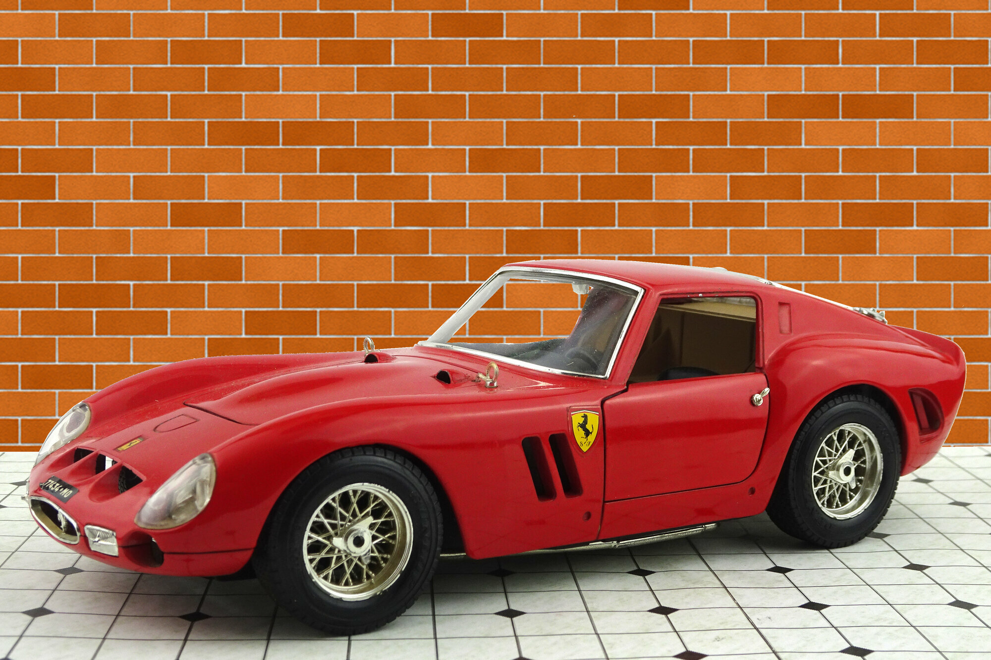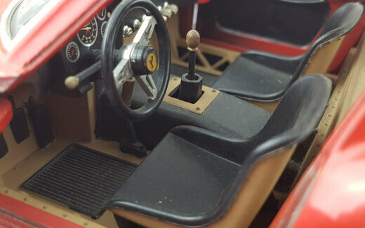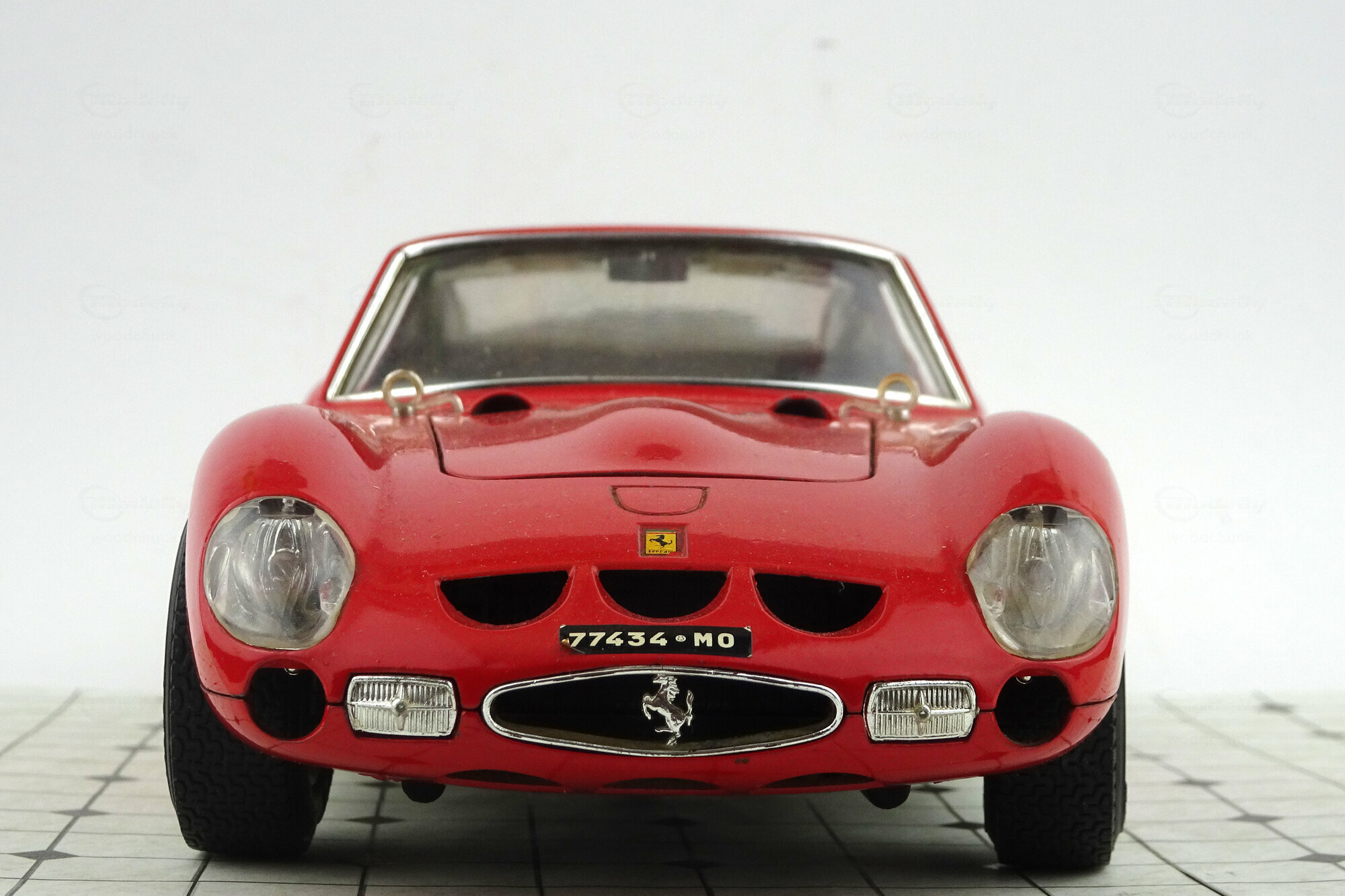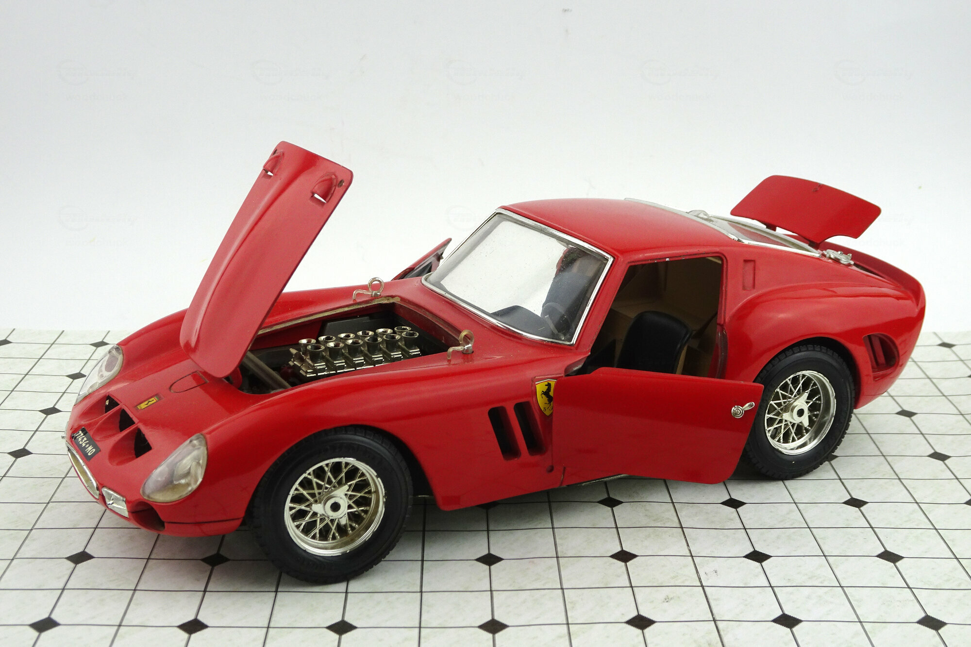 Ein DieCast-Modell des 250 GTO von 1962 erschien bereits 1984 von Bburago. Die Qualität des Metallgusses ist trotz kleiner Fehlerstellen gut und auch die Lackierung in Ferrari-Rot ist ohne Beanstandungen. Die äußeren Details sind aufgrund des Modellalters recht grob und die Idee Rücklichter und Frontgrill hinter Aussparungen in der Metallkarosserie zu setzten ist nicht unbedingt die Beste. Weiter fehlen Spiegel, Scheibenwischer sowie Seitenscheiben und deren Rahmen. Die Räder sind zu „gewaltig“ was auch für die Größe der Speichenstruktur gilt. Es lassen sich beide Türen, Motorhaube sowie die Heckklappe öffnen. Unter dieser findet lediglich das Ersatzrad Platz. Die Motornachbildung ist sehr einfach und kaum detailliert. Auch der Innenraum ist nur „Karo-einfach“, hier dominiert schwarzes Plastik und Chrom (hier habe ich mit etwas Farbe nachgeholfen). Bei Maßstab hat man es nicht so genau genommen, das Modell ist über 1 cm zu breit und auch Länge und Radstand sind leider etwas zu groß geraten. Ein Modell mit vielen Schwächen welche aber auch dem Alter des Modells geschuldet sind. Heute gibt es eine Reihe von Besseren, allerdings auch zu höheren Preisen. Das Bburago Modell ist im Netz gebraucht zu Preisen ab 20 € noch zu finden.