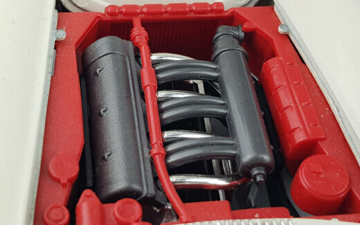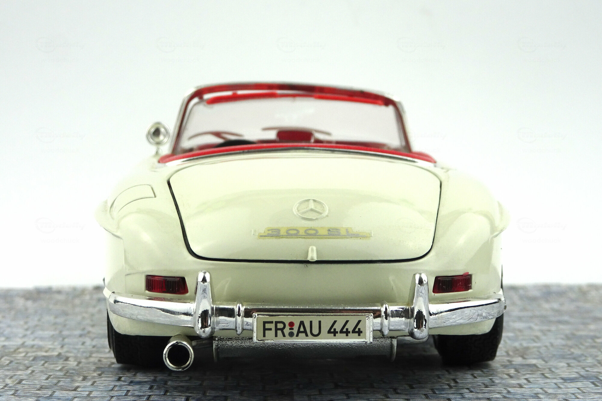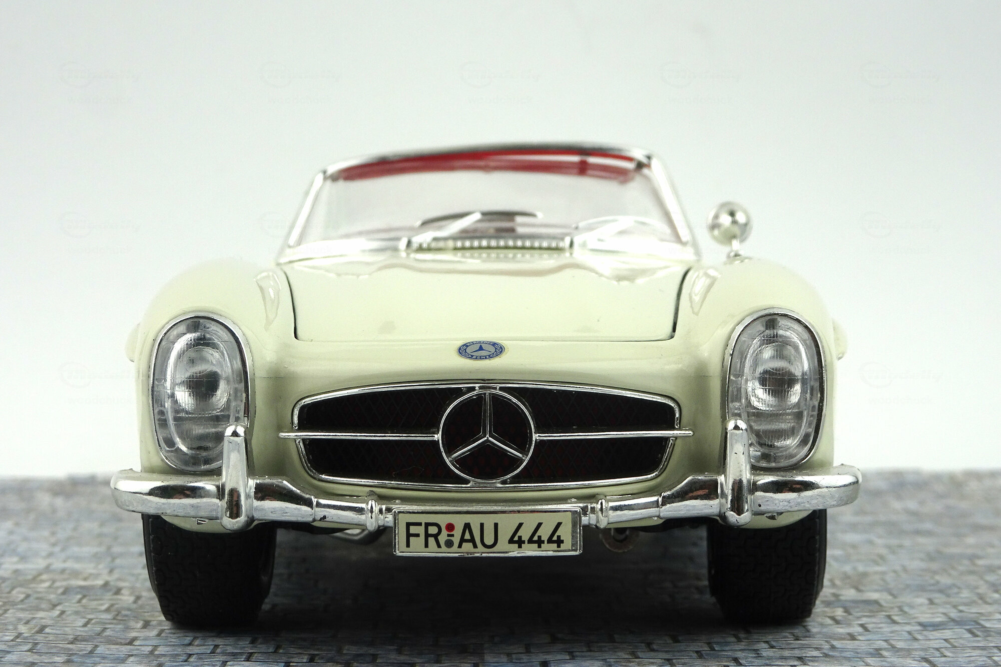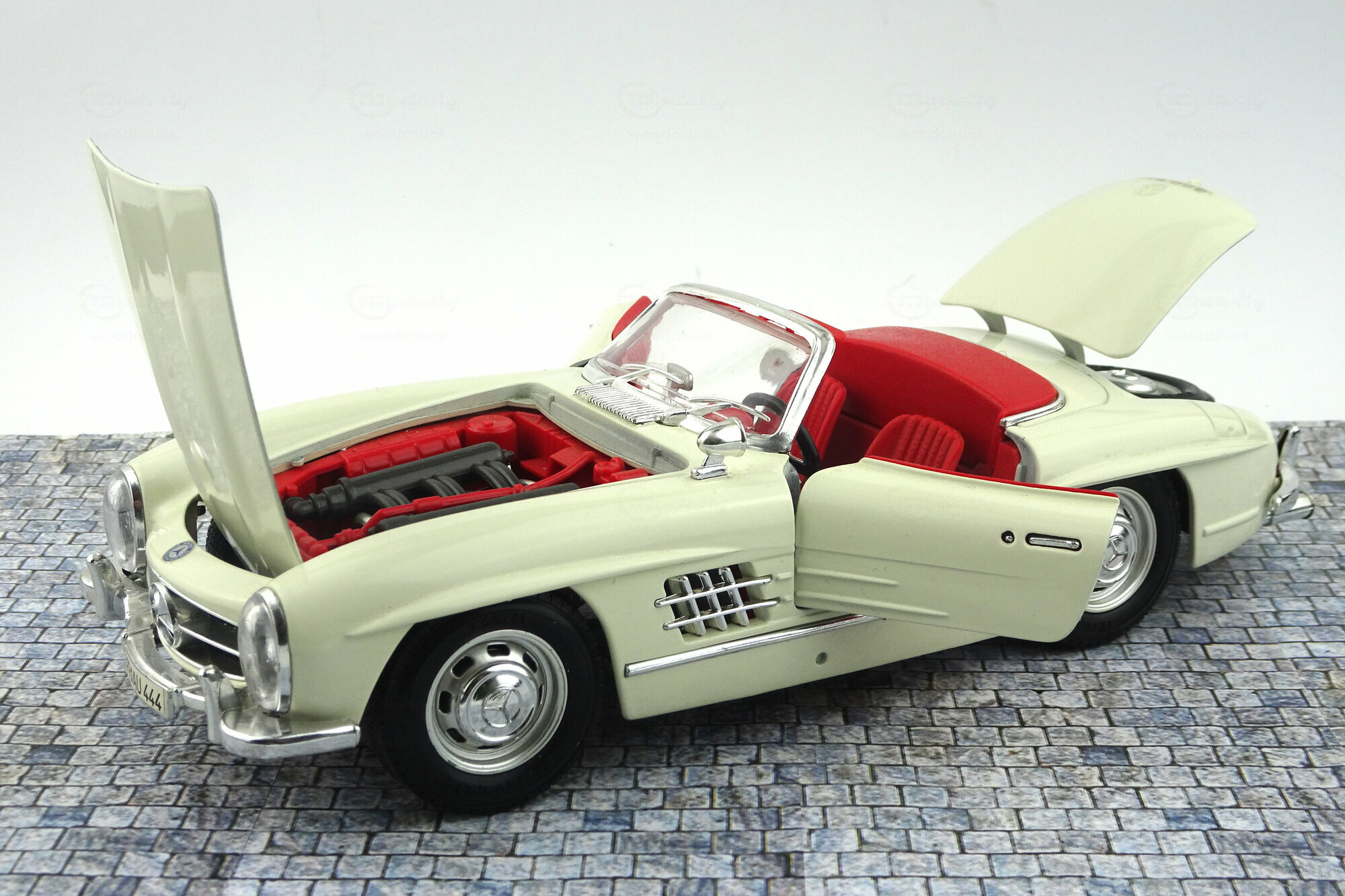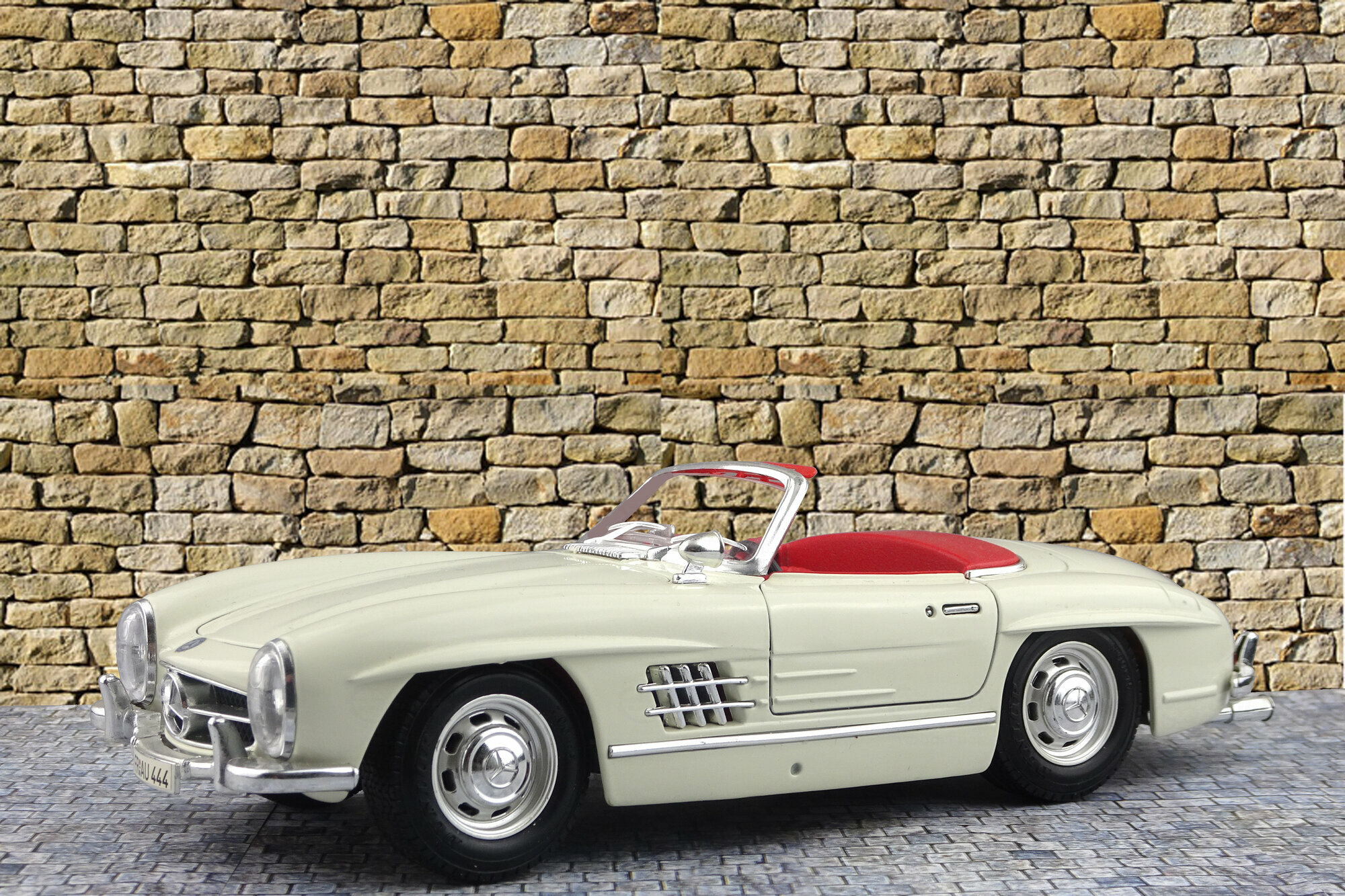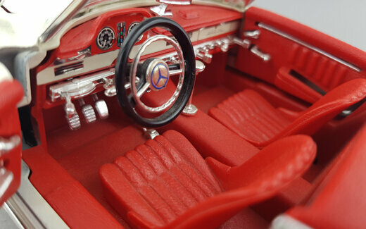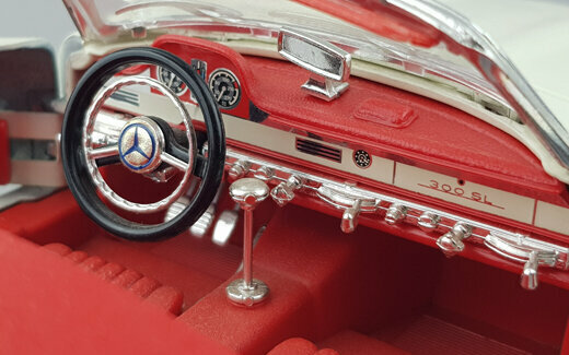Das DieCast-Modell des 300 SL Roadsters von Bburago erschien 1996. Die Verarbeitung ist eher mittelmäßig, so findet sich auf dem rechten vorderen Kotflügel eine Beule die entweder vom Lack oder dem Metallguss herrührt. Auch ansonsten haben sich in die Form einige Fehler eingeschlichen. So verläuft die seitlich „Gürtellinie zu gradlinig. Der hintere Kotflügel müßte deutlich weiter nach oben gewölbt sein. Die seitlichen Ausbuchtungen über den Vorderrädern sind zu kurz und zu flach geraten und der vordere Kotflügel ist zwischen Radausschnitt und Scheinwerfen zu kurz. Die Hinterräder sind zu tiel im Radkasten was zusammen mit der zu stark geneigten Frontscheibe eine sehr niedrige Silhouette erzeugt. Die äußeren Details sind sehr grob wobei der Kühlergrill noch am besten geraten ist. Die Felgen sind gut gelungen, leider sind die Reifen jedoch zu breit. Es lassen sich beiden Türen, Kofferraum und Motorhaube öffnen. Unter dieser findet sich ein mäßig detaillierter Motor mit einem in Rot! Gehaltenen Motorraum. Im Kofferraum befindet sich nur das viel zu gewaltig geratene Ersatzrad. Auch der Innenraum ist mit einfachsten Mitteln sehr grob gestaltet. Armaturenhebel habe eine Dicke von Besenstielen. Dieser Standard setzt sich bei der Maßstabstreue fort; das Modell ist zu kurz, zu schmal und zu flach. Lange war es das einzige Modell in diesem Maßstab, zwischenzeitlich wäre aber die Minichamps Version trotz des erheblich höheren Preise diesem vorzuziehen. Das Bburago Modell ist nach wie vor im Netz um die 30 € im Angebot.