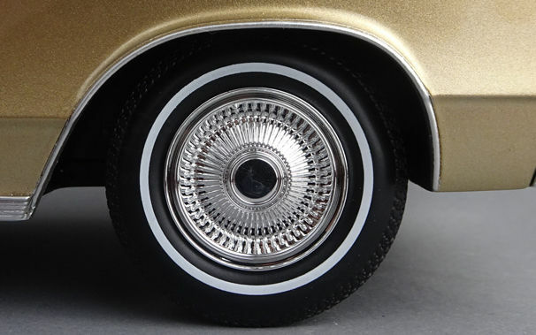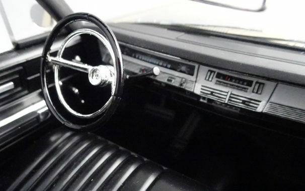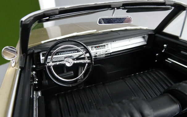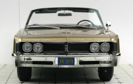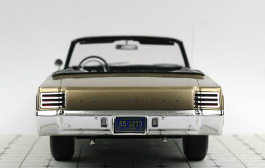 Das im August 2016 bei BoS Models erschienene Resin Modell des 1967 Chrysler Newport Convertible gibt die Erscheinung dieses Straßenkreuzers der Sechziger sehr eindrucksvoll wieder. Eine gute Verarbeitung und die makellose Lackierung in metallic Gold tun ein Übriges. Große Räder mit Weißwandreifen und verchromten Felgen-Vollverkleidungen ergänzen das gute Gesamtbild. Im offenen Innenraum hätte man ein wenig mehr tun können. Dieser ist doch recht einfach gehalten, Schade! Der Maßstab wird leider nicht bei allen Dimensionen korrekt eingehalten. Das Modell ist etwas zu kurz, dafür ist der Radstand 5 mm zu groß. Wie auch immer, Liebhaber dieser „Straßenkreuzer“ schreckt auch der Preis von knapp 120 €, für den es aktuell auch noch im Handel zu haben ist, nicht ab.