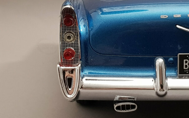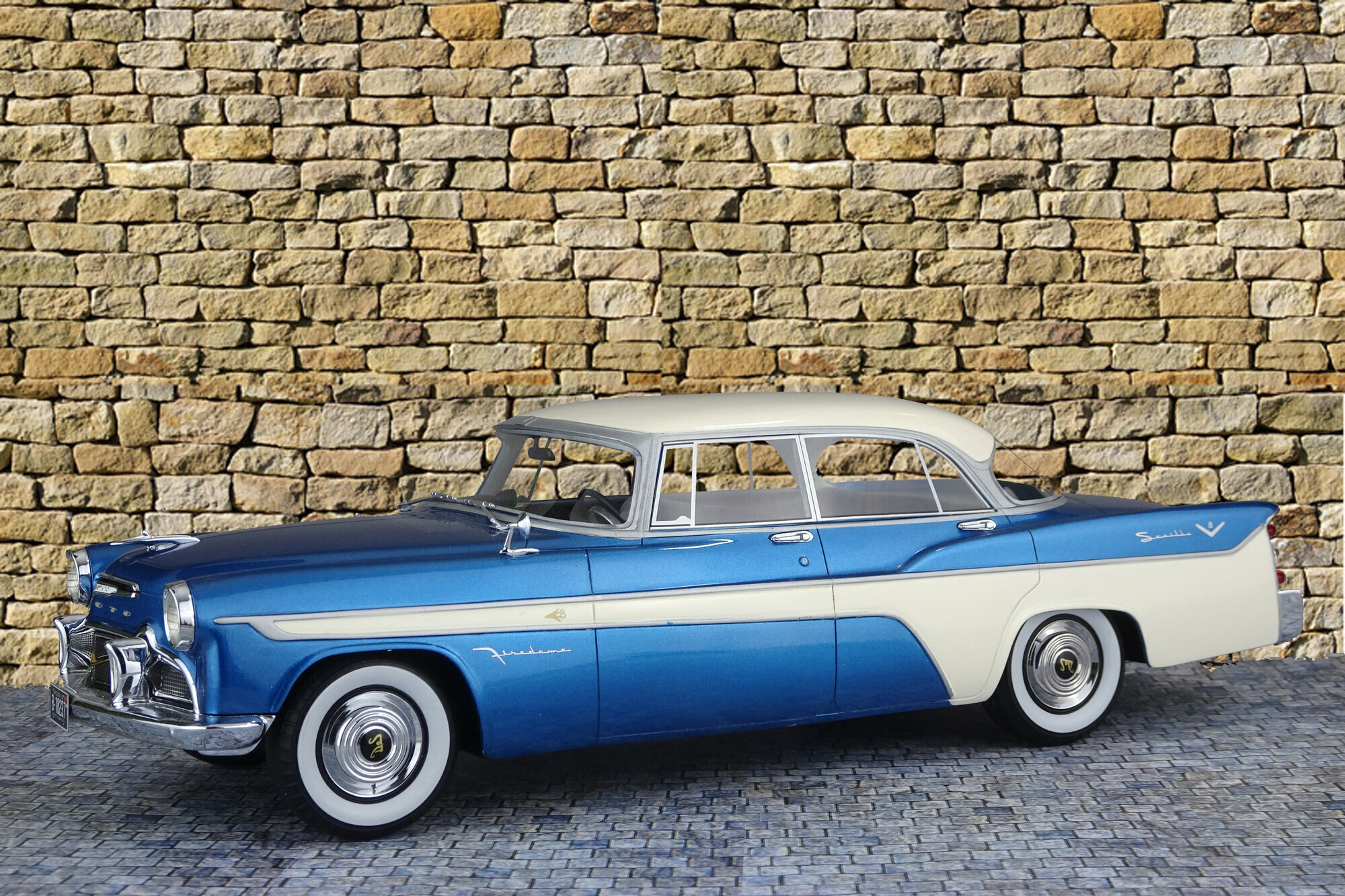 Ein Resin-Modell des 1956 Firedome 4-door Seville erschien im Juni 2017 bei BoS-Models. Die Karosserie gibt die geschwungenen Linien des Originals sehr gut wieder und eine schöne 2-farb Lackierung in Metallicblau und Cremeweiß zusammen mit vielen, sehr gut gearbeiteten Details vermittelt einen exzellenten Gesamteindruck. Auch die großen Räder mit Weißwandreifen und verchromten Radabdeckungen fügen sich sehr gut in das Bild ein. Der Innenraum ist rech gut modelliert und zeigt auch einige gur herausgearbeitete Details. Leider sind alle Instrumente als ein einziges Decal mit schwachem Kontrast ausgeführt. Der Maßstab wird recht gut eingehalten und die Proportionen sind stimmig. Für einen Einstandspreis von 120 € erhält man ein sehr ordentliches Modell dieses Straßenkreuzers aus den Fünfzigern.
