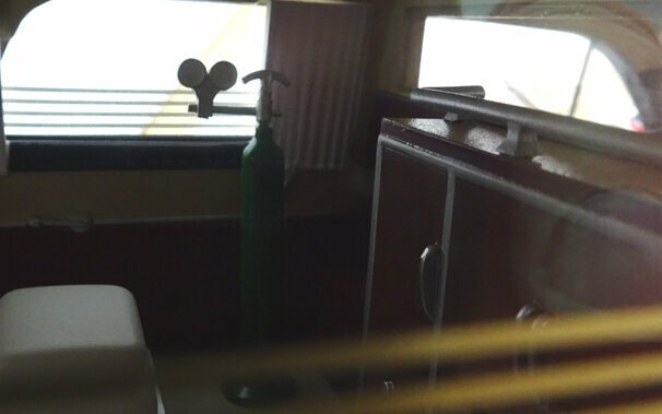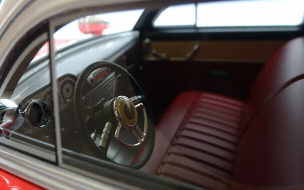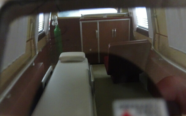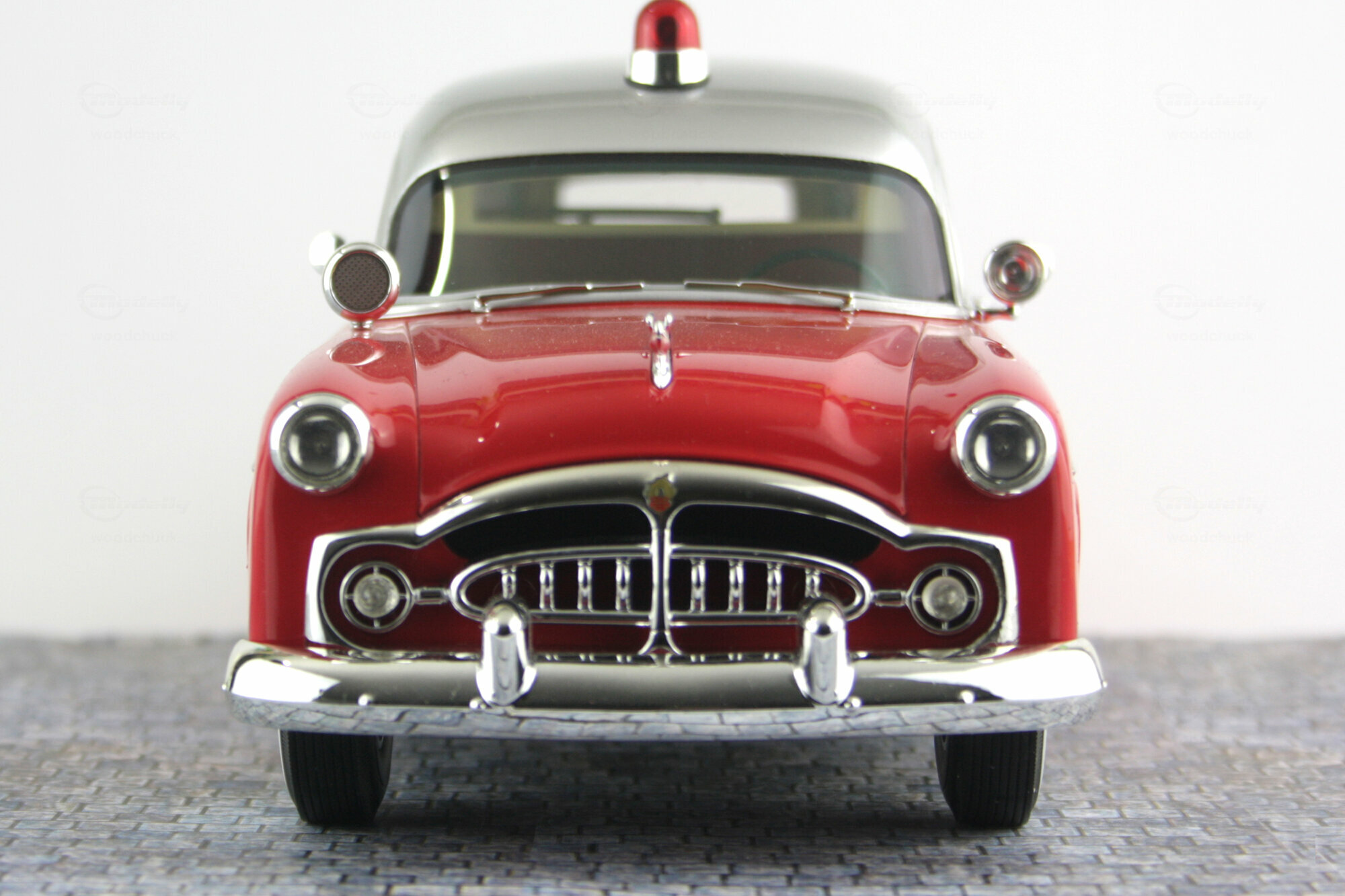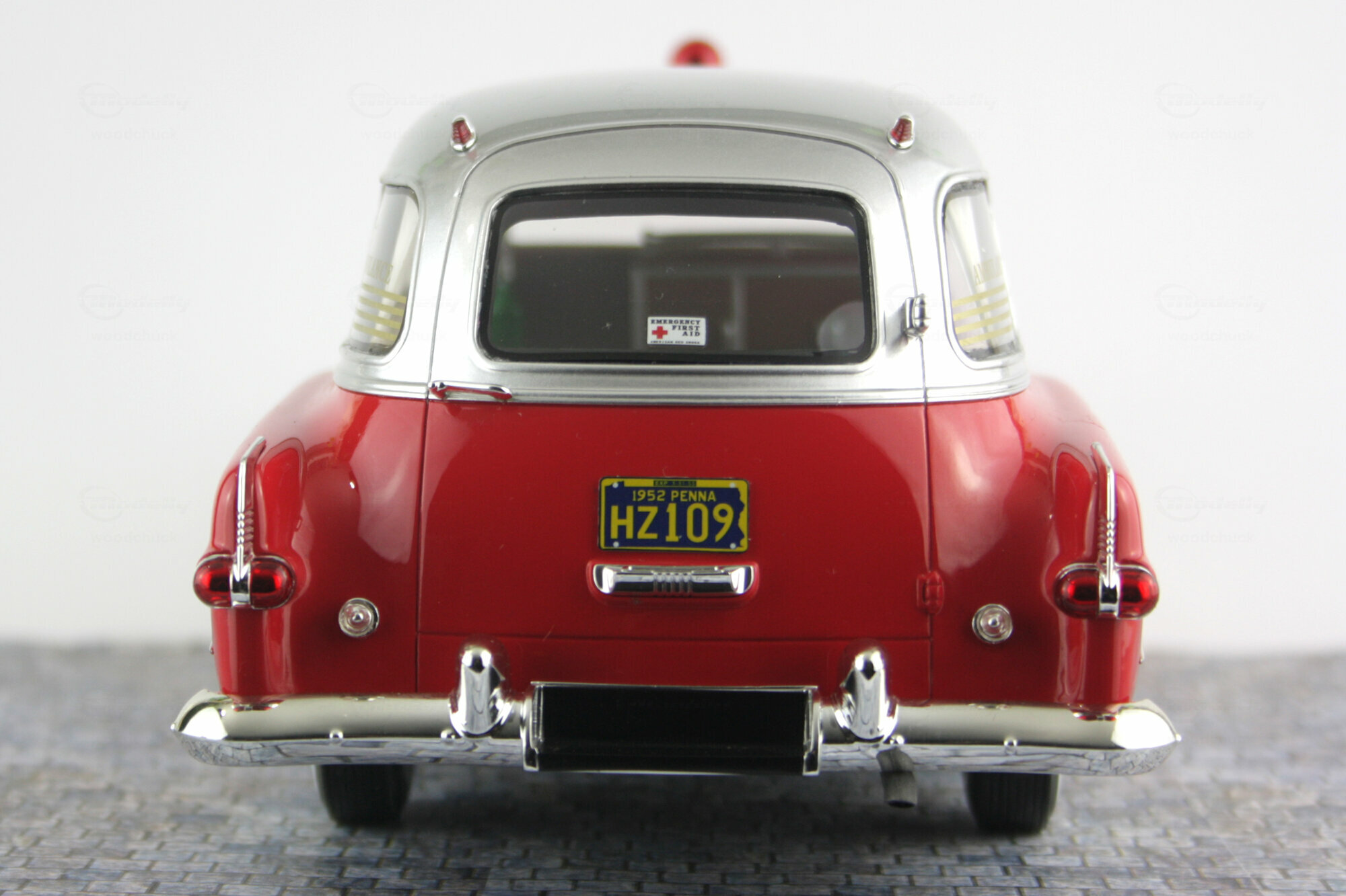 Eine Monat nach dem Henney Hearse, im Mai 2018, erschien Bei BoS Model s ein Resinmodell des Henney Ambulance von 1952. Das in Rot/Silber lackierte Modell gibt die Imposante Erscheinung dieses riesigen Fahrzeugs sehr schön wieder. Das geschwungene Design des Henny Entwurfes verbunden mit den klassischen Linien des Packard Patrician kommen sehr gut zur Geltung. Der Chromschmuck und die äußeren Details, wie die entgegengesetzt angeschlagenen Türen, die große Hecktür, der Suchscheinwerfer am linken Außenspiegel, die filigrane Kühlerfigur sowie die Sirene und die rote Rundumleuchte, sind gut nachgebildet. Innen findet man vorn im Fahrerbereich ein gut gestaltete Lenkrad und Armaturenbrett sowie ordentlich modellierte Sitze und Türverkleidungen. Im hinteren Abteil setzt sich die Detaillierung in gleicher Weise fort und man findet dort neben einem kleinen Schrank noch eine Krankentrage, Sauerstoffflaschen und einen Sitz für einen Sanitäter. Die Fenstergardinen hier ebenfalls aus Plastik wirken etwas besser als beim Hearse Modell. . Soweit eine Überprüfung aufgrund fehlender Daten möglich war, wird der Maßstab eingehalten. Das Modell ist ab 150 € im handel erhältlich und man bekommt eine Menge Modell dafür.