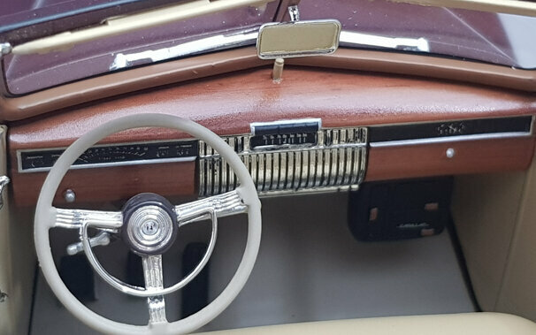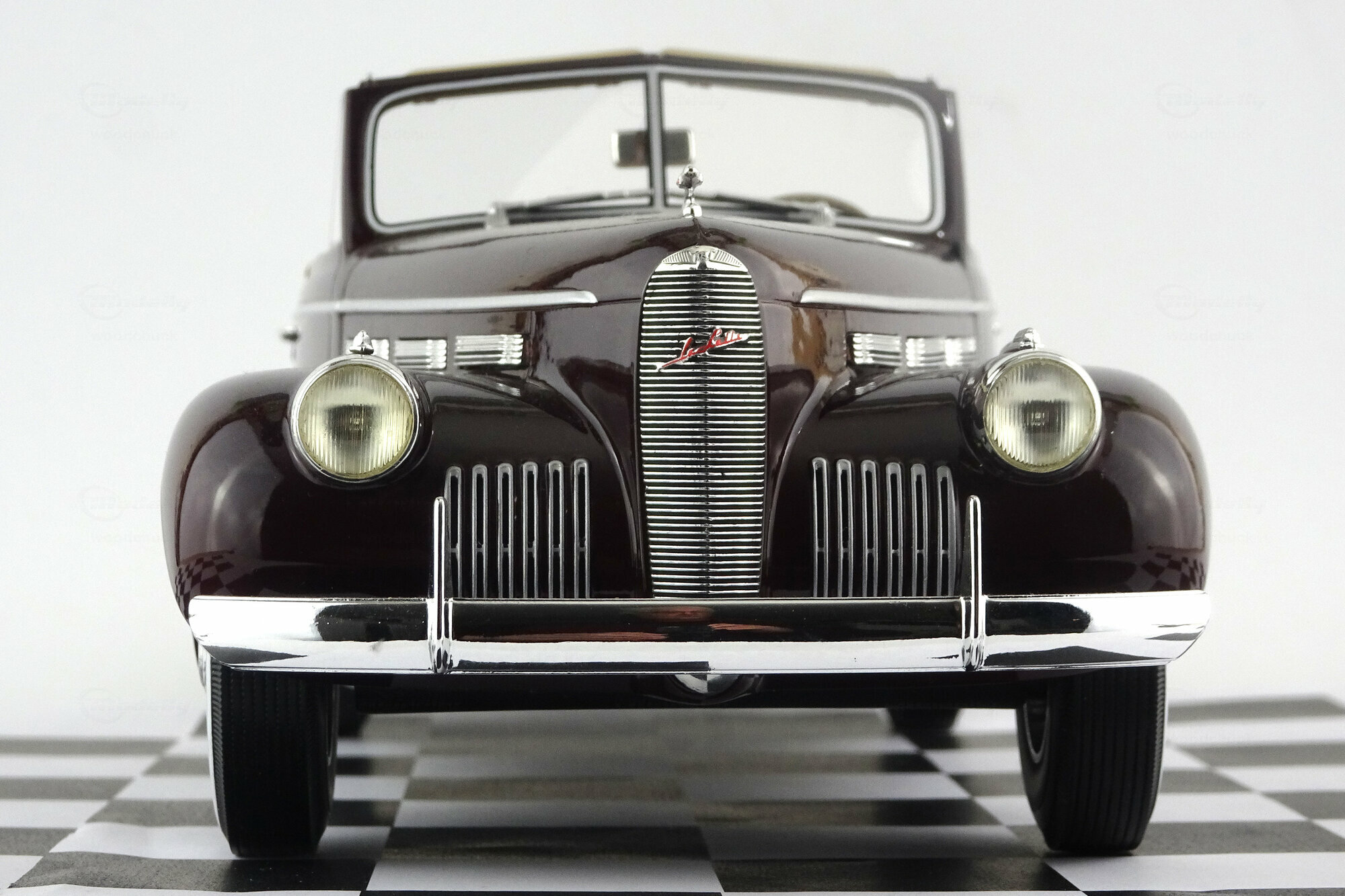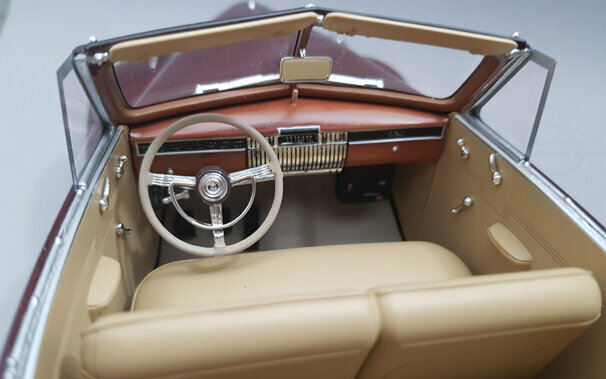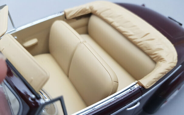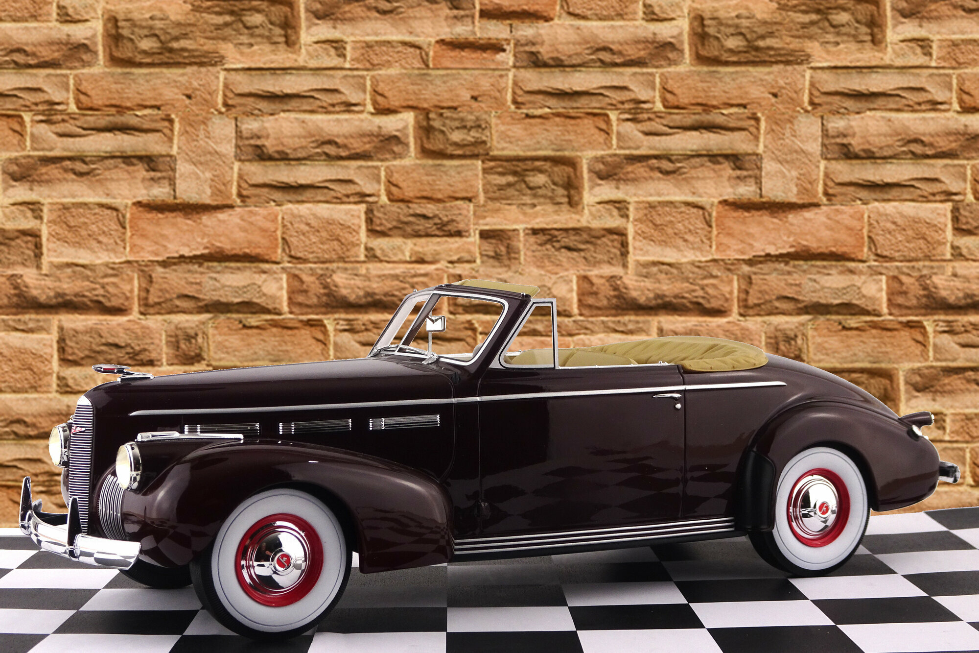 Das Modell des Series 50 Convertible Coupé von 1940 erschien bei BoS Models im Juli 2017 als Resin-Modell. Die Linienführung des Modells ist in der schön verarbeiteten Karosserie gut wiedergegeben und die rotbraune Lackierung entspricht einem der überlebenden Originale. Die äußeren Applikationen sind bis hin zu den Schriftzügen gut detailliert und sauber ausgeführt. Wie beim Original wurde auf Außenspiegel verzichtet. Der Innenraum ist wirklich gut gelungen. Ein Armaturenbrett mit Holzoptik und allen Details, ein filigranes Lenkrad, Sonnenblenden und die Cadillac Heizung im Beifahrer Fußraum sind die Highlights. Auch die Sitze und Türverkleidungen sind gut modelliert und mit Details ausgestattet. Der Maßstab wird, soweit man das an den wenigen verfügbaren Daten sagen kann, sehr gut eingehalten. Der Preis von knapp 120 € ist durchaus angemessen, zumal es sich auch um ein limitiertes Modell handelt.