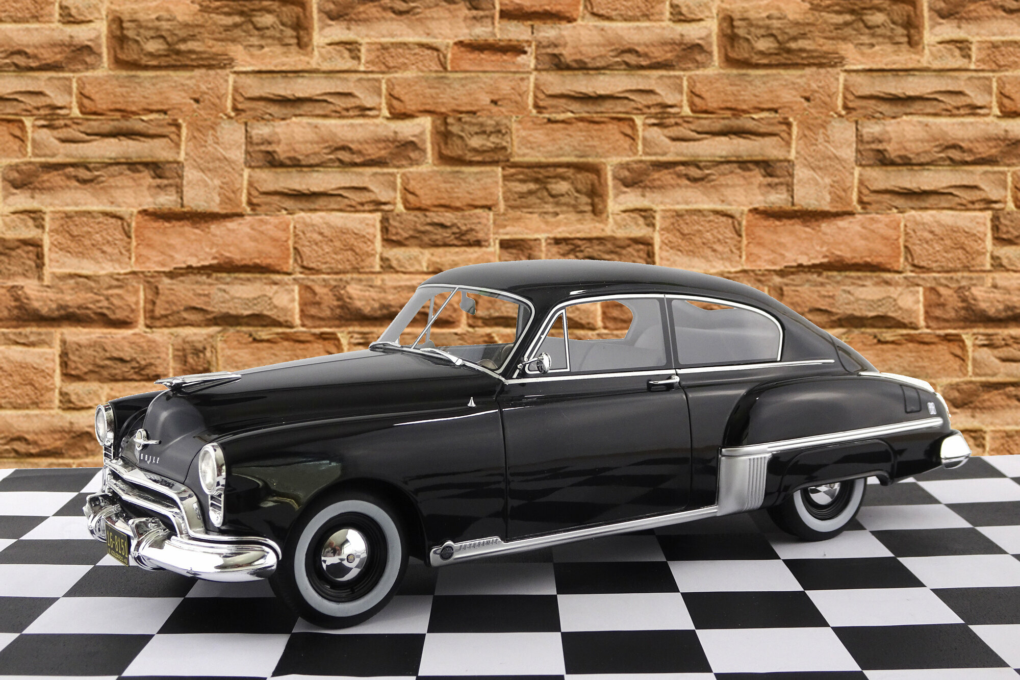 Ein Resin-Modell des Oldsmobile 88 Club Sedan von 1949 erschien im Oktober 2017 bei BoS Models. Das Modell trifft die Form des Originals sehr gut und ist auch richtig proportioniert. Lediglich die hinteren Fenster erscheinen mir zu lang und die gebogenen Chrombügel am Kühler zu dünn. Die glänzende, tiefschwarze Lackierung ist ohne Tadel. Die äußeren Details geben den üppigen chromschmuck gut wieder, leider sind die seitlichen Zierleisten nur in Silberfarbe ausgeführt und die Qualität des Chroms an der Frontmaske ist teilweise schlecht. Die Räder mit den großen Weiwandreifen sind passend und entsprechen durchaus den Originalen. Der Innenraum ist etwas zwiespältig; das Armaturenbrett und das Lenkrad sind wirklich sehr schön geworden und zeigen viele Details, auch die Türverkleidungen sind noch recht ansprechend, Sitze und Fußraum sind dagegen erschrecken einfach gestaltet. Der Maßstab wird gut eingehalten. Für die Freunde der US-Klassiker ein gutes Modell für das allerdings der Preis von 120 € etwas zu hoch erscheint.