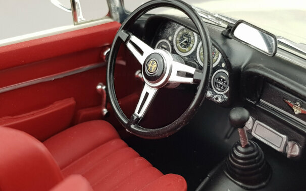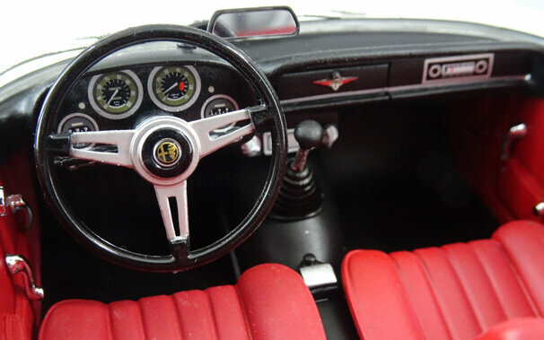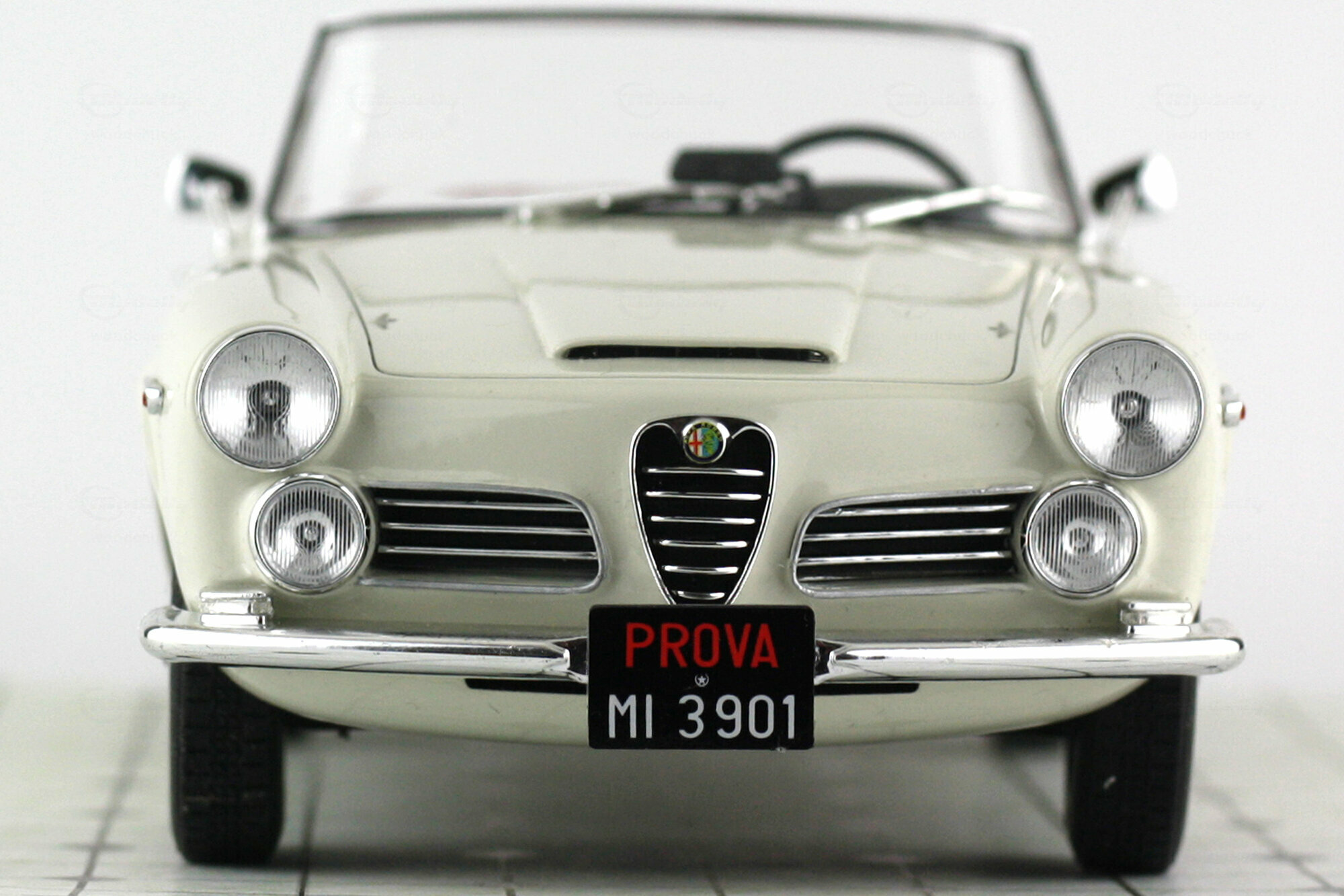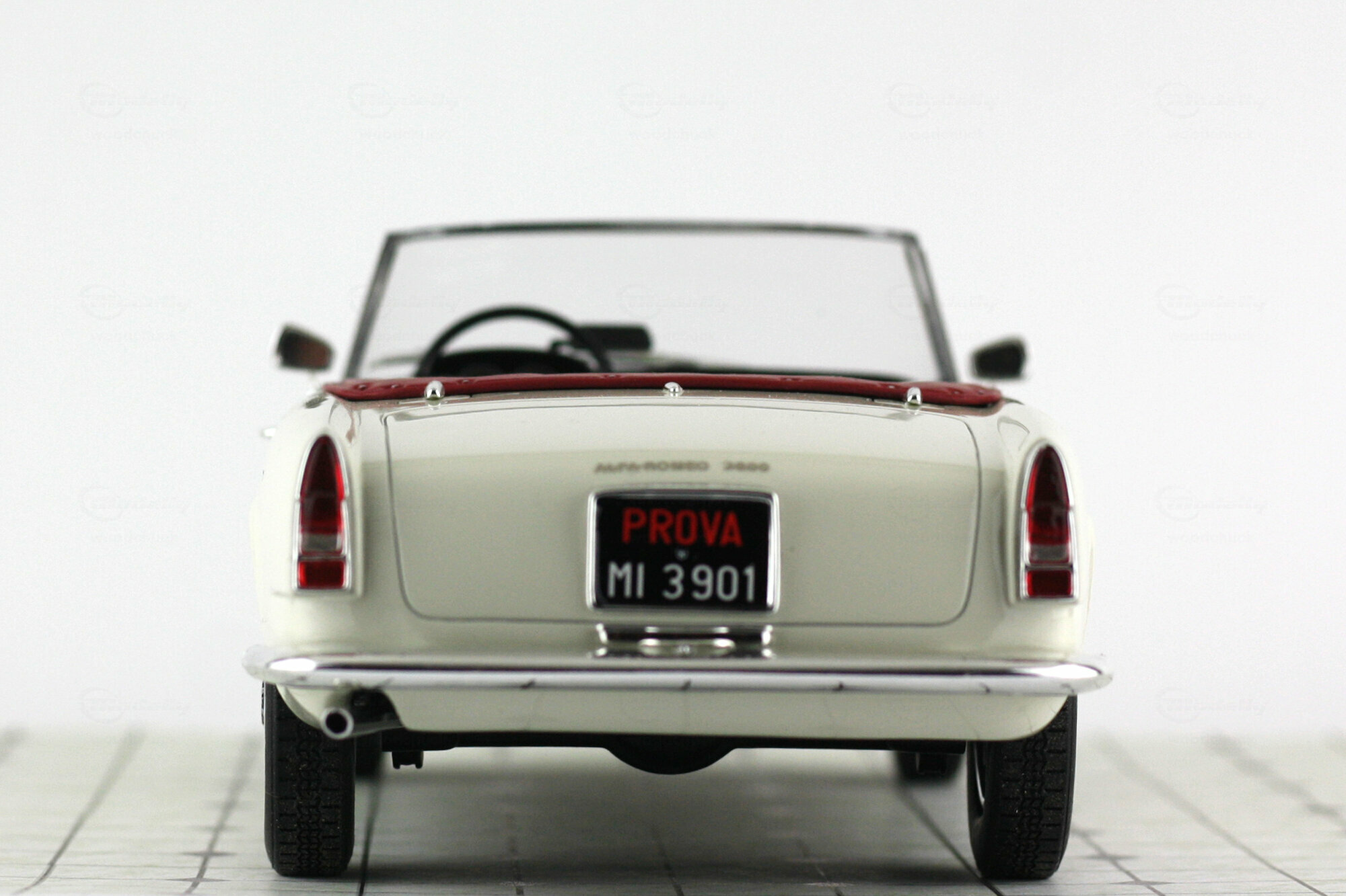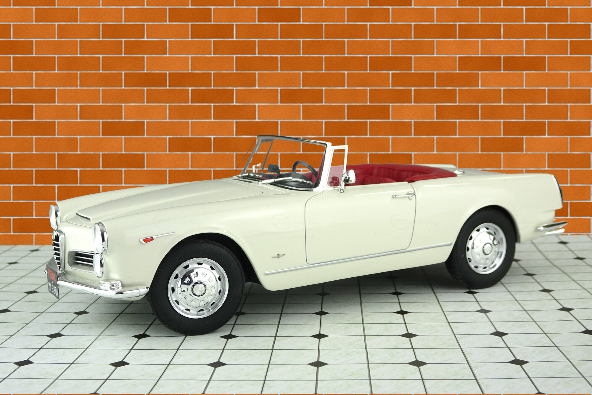 Im Dezember 2017 erschien von Cult Scale Models ein Resine-Modell des Alfa Romeo 2600 Spider. Die Karosserie ist sehr gut gestaltet, mit vielen kleinen Einzelheiten ausgestattet und einer ausgezeichneten Lackierung versehen. Der Innenraum ist mit viel Liebe zum Detail modelliert und gibt den Eindruck des Originals sehr schön wieder. Auch die Räder sind gut gelungen, nur von unten sieht es wie bei vielen Resinmodellen leider sehr mager aus, dennoch sind die Vorderräder lenkbar. Der Maßstab wird absolut exakt eingehalten. Das Modell wird aktuell im Handel für ca. 150 € angeboten was ich für durchaus gerechtfertigt halte.