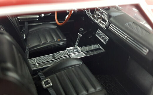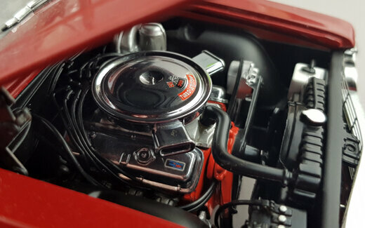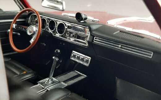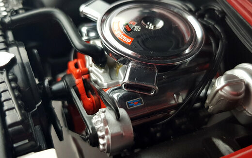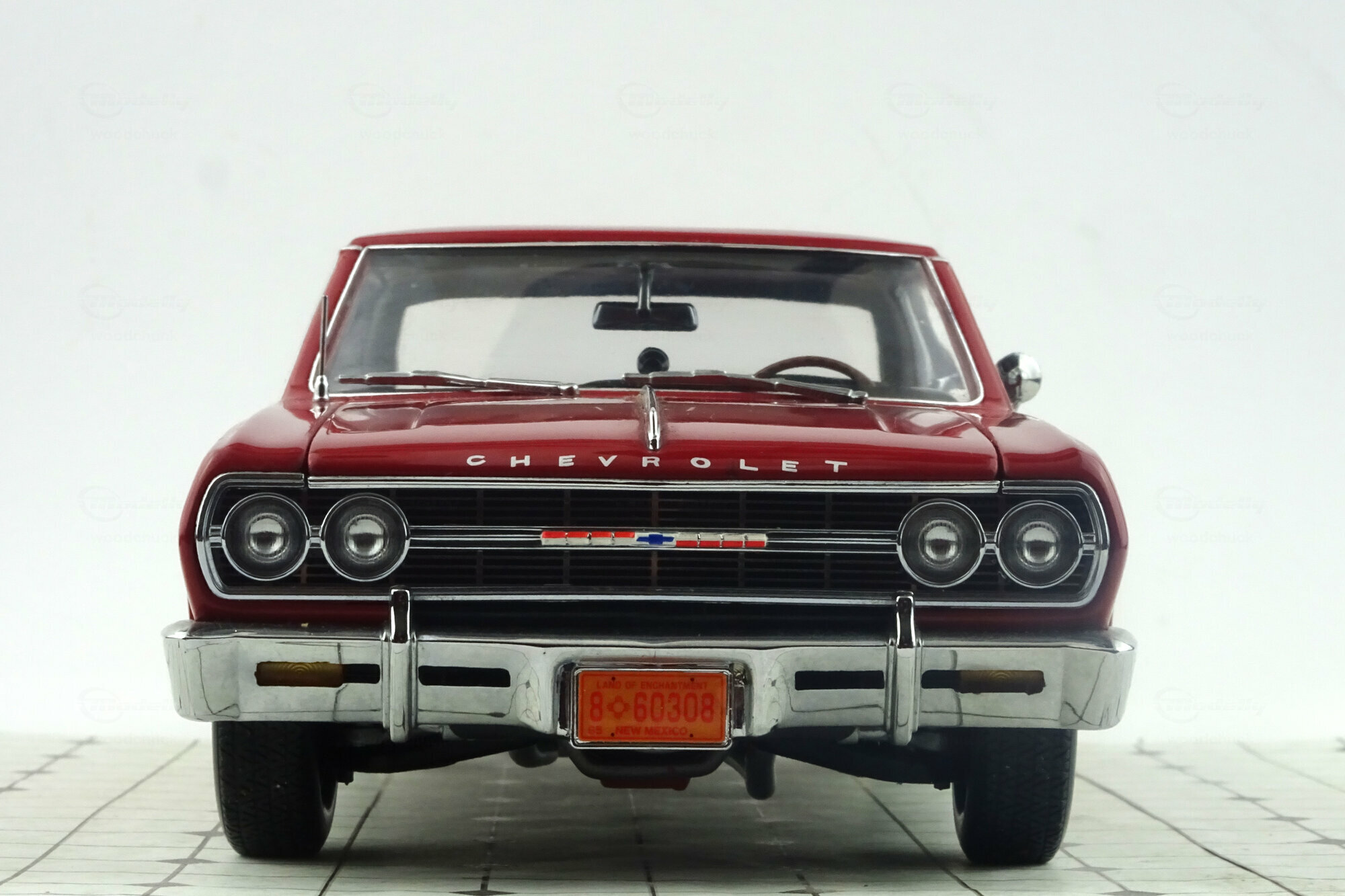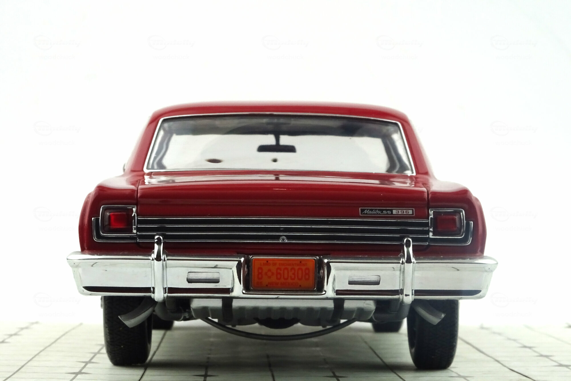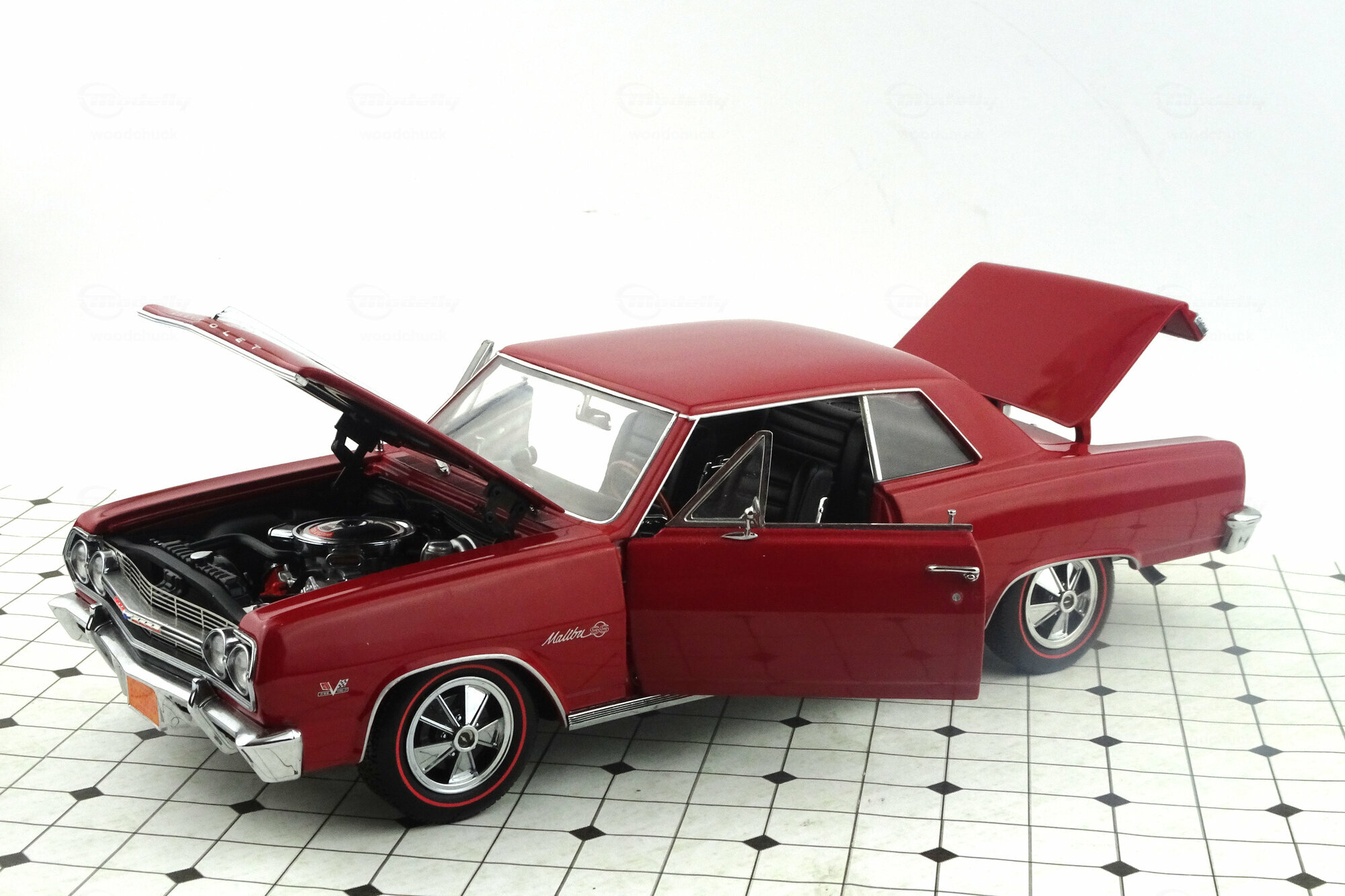 2003 erschien bei Ertl ein DieCast-Modell der Chevelle Malibu SS von 1965. Es wurde in der Folge in 6 Farbvarianten angeboten. Die Verarbeitung wie auch die Lackierung sind außerordentlich gut. Die äußeren Detail sind sehr filigran ausgeführt, besonders fällte hier die Front mit dem sehr schön gestalteten Kühlergrill auf. Auch die Räder sind gut nachbildet und die Unterseite ist ordentlich detailliert. Es lassen sich beide Türen, die Motorhaube sowie der Kofferraum öffnen. Dieser ist mie einer Bodenfolie ausgelegt und beinhaltet ansonsten das unvermeidliche Reserverad. Unter der haubefindet sich ein sehr schön gestaltetet Motor mit einer Vielzahl von Details. Dieses hohe Niveau ist auch im Innenraum zu finden. Hier überzeugen ein filigranes Lenkrad, ein hervorragendes Armaturenbrett, gut modellierte Sitze mit Anschnallgurten, Teppichboden sowie detaillierte Verkleidungen. Auch der Maßstab wird gut eingehalten. Ein rundum hervorragendes Modell welches leider nicht mehr in Produktion ist. Im Netz ist es noch vereinzelt zu bekommen. Die Preise belaufen sich je nach Zustand zwischen 15o und 200 €.