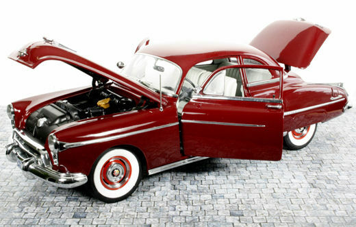 Die hier gezeigte Miniatur im Maßstab 1:18 von Ertl ist eine detailgetreue Nachbildung des Oldsmobile Rocket 88. Diese exquisit gefertigte Modellauto folgt dem legendären Design des Originals und bringt die Ästhetik der 50er Jahre perfekt zum Ausdruck. Das Modell besteht aus einem Materialmix, der Metall und Kunststoff kombiniert, um die verschiedenen Details des Autos realistisch darzustellen. Die markante, dunkelrote Lackierung in Kombination mit den weißen Akzenten und dem verchromten Kühlergrill gibt der Miniatur ein authentisches Erscheinungsbild. Die Türen, die Motorhaube und der Kofferraum sind funktional und können geöffnet werden, was dem Sammler einen Blick auf den detaillierten Innenraum und den Motor ermöglicht. Dies bestätigt einmal mehr die hohe Qualität und Liebe zum Detail, die in diese Ertl-Miniatur im Maßstab 1:18 geflossen ist.