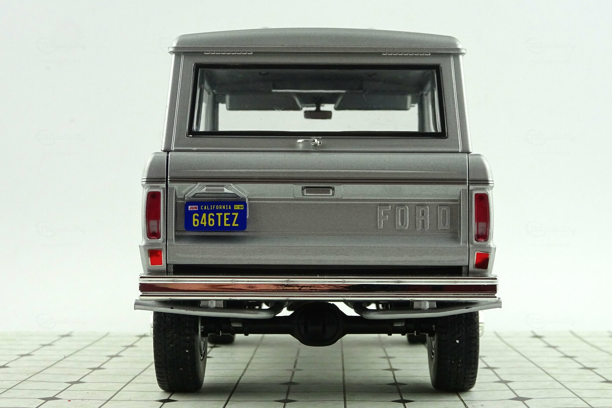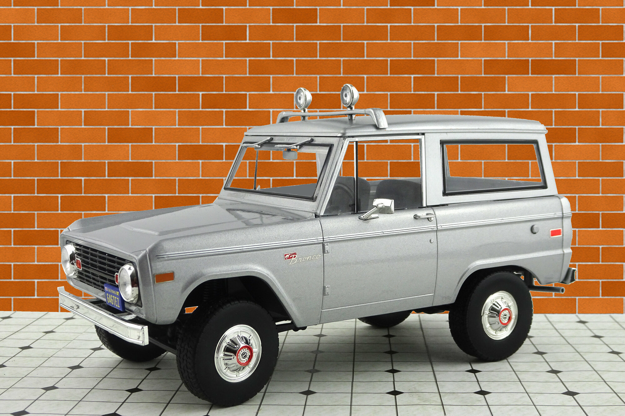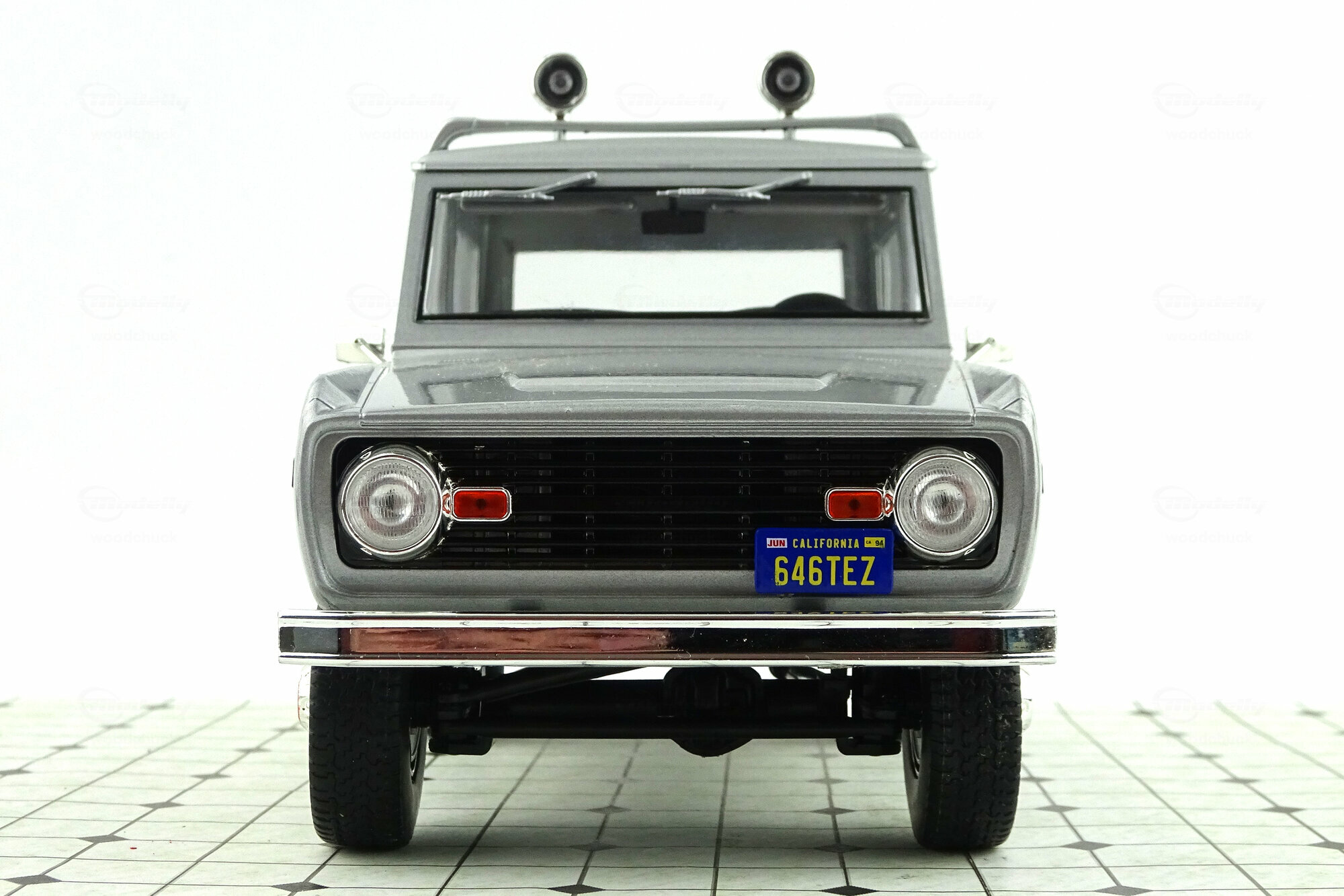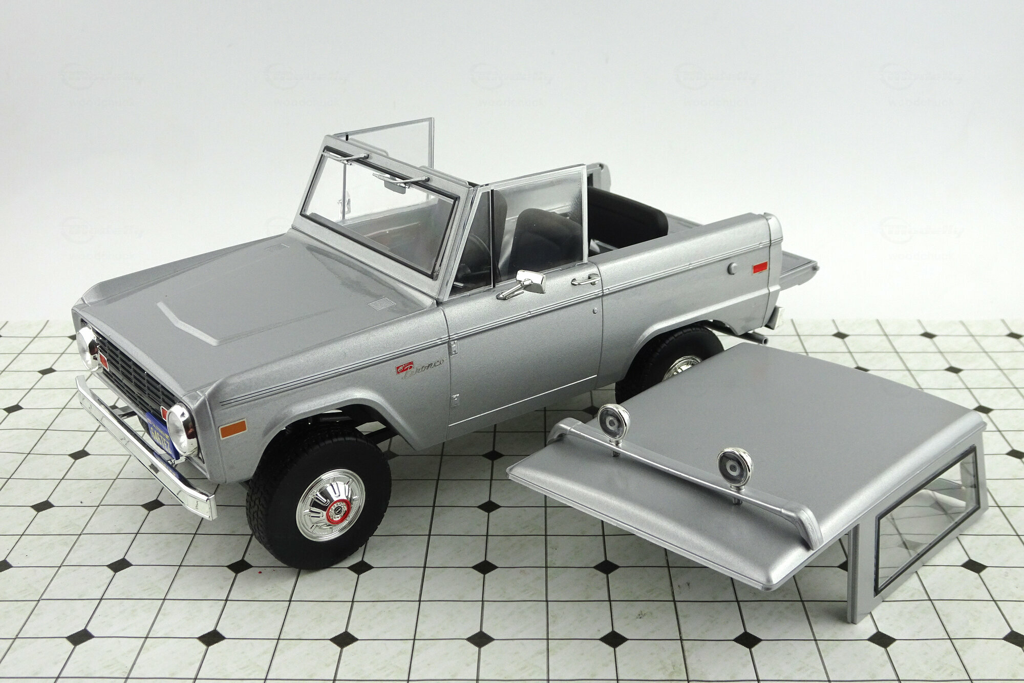 Im August 2020 brachte Greenlight den Bronco der ersten Generation in verschiedenen Varianten als DieCast-Modell heraus. Mein Modell ist die silberne Variante aus dem Film Speed. Die Karosserie besteht aus Metallguss während das abnehmbare Dach aus Kunststoff gefertigt ist. Außer der Heckklappe lassen sich keine Komponenten öffnen sodass es auch keine Motornachbildung gibt. Der Metallguss ist gut gearbeitet und auch die Lackierung ist ohne Tadel. Die äußeren Details wie Spiegel, Scheinwerfer, Kühlergrill und Beschriftungen sind von guter Qualität. Auch die Unterseite sowie die Räder sind gut gelungen. Der Innenraum, bei abgenommenem Dach gut einsehbar, ist einfach aber vorbildgetreu gestaltet. Auch der Gesamteindruck gibt das Original gut wieder. Der Maßstab wird nur bei der Länge exakt eingehalten, ansonsten sind es überall ein paar Millimeter zu viel. Dennoch ein gutes Modell dieses ersten Kompakt-SUV von Ford welches mit um die 70 €nicht überbezahlt ist.