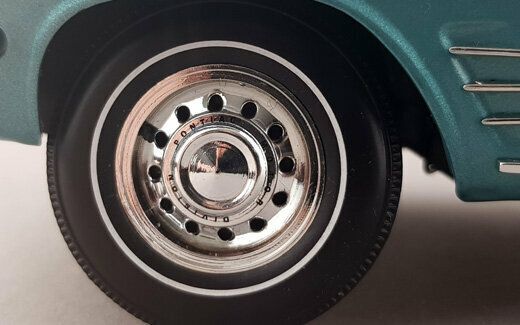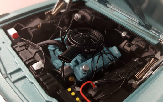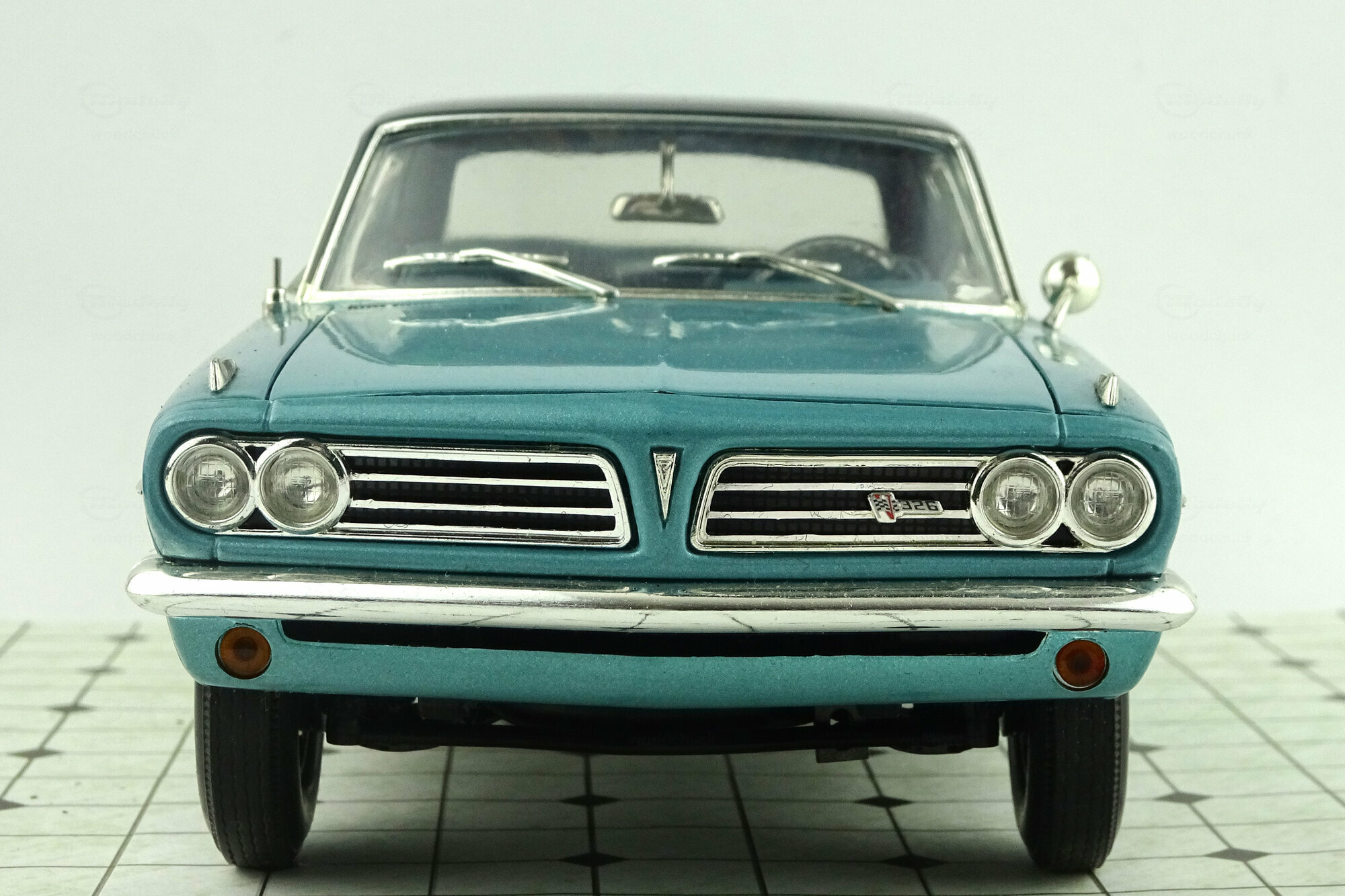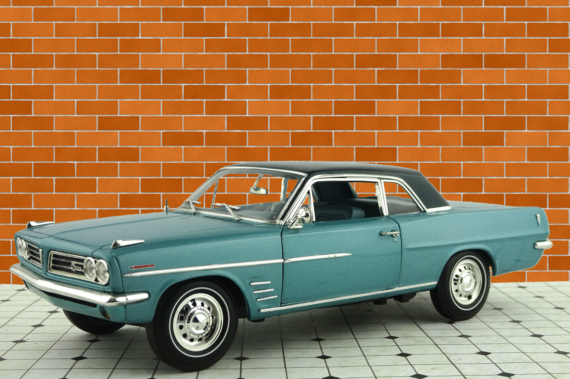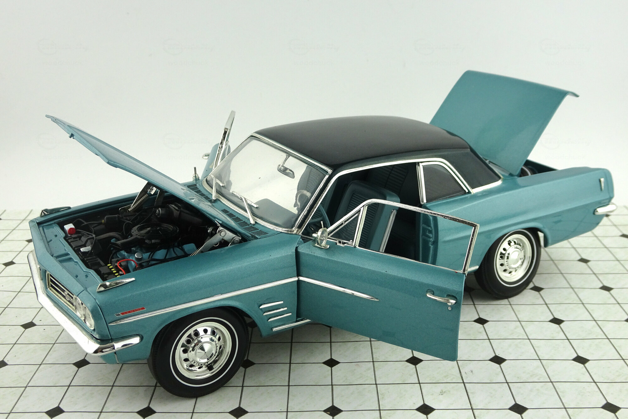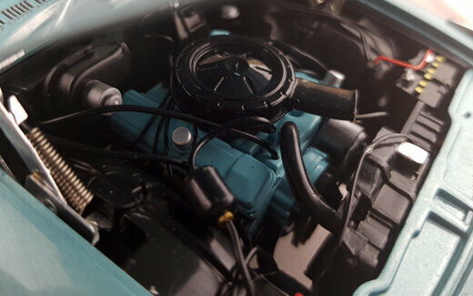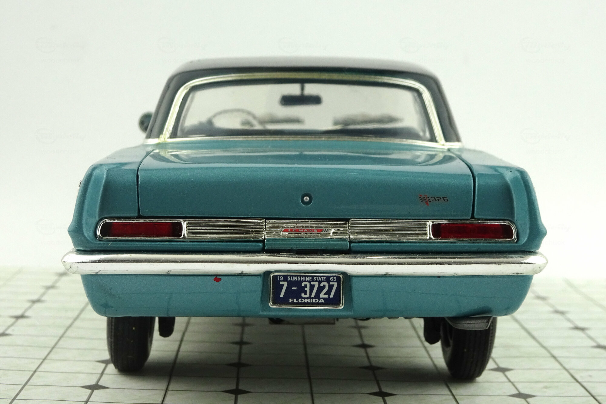 Highway 61 brachte 2003 ein DieCast-Modell des 1963 LeMans Coupé in metallic Blau mit schwarzem Dach auf den Markt. Das Modell ist hervorragend verarbeitet und Lackiert. Es weist viele feine äußere Details von hoher Qualität auf und auch des Chassis in sehr detailliert dargestellt. Es lassen sich Motorhaube, die Türen sowie der Kofferraum öffnen. Dieser birgt das sehr schön dargestellte und wie bei US-Autos üblich, raumfordernd platzierte Reserverad. Unter der Motorhaube erwartet einen eine Fülle von Details sowie im Motorraum als ach am hervorragend detaillierten V8 Motor. Ein weiteres Highlight sind die Hauben-Aufhängungen mit zusätzlichen Spiralfedern. Der Innenraum steht diesem in nichts nach. Hier findet man ein sehr gut gestaltetes Armaturenbrett mit einem ebensolchen Lenkrad, schön modellierte Sitze, ein Fußraum mit Veloursboden und separaten Gummimatten, einen voll ausmodellierten Dachhimmel sowie reich detaillierte Türfüllungen. Der Maßstab wird gut eingehalten. Ein hervorragendes Modell was einen besonderen Platz in jeder Sammlung verdient hat. Es wird aktuell nicht mehr gefertigt, ist aber im Netz ab 110 € zu bekommen.