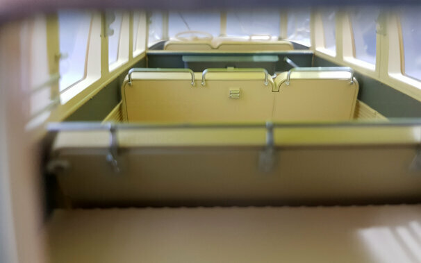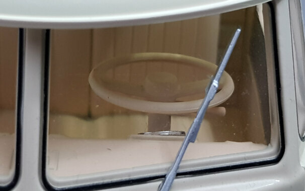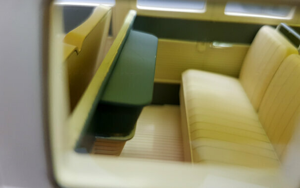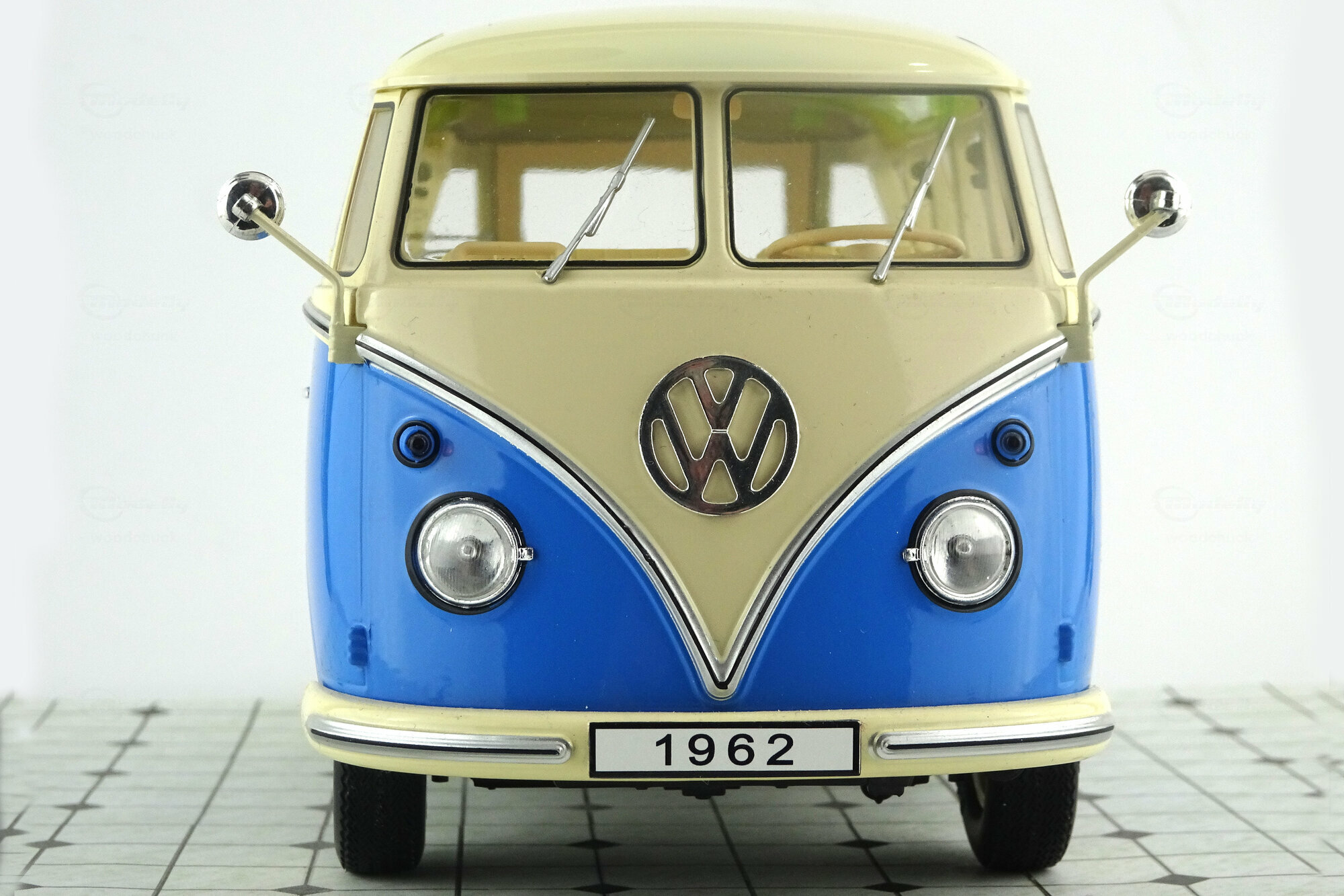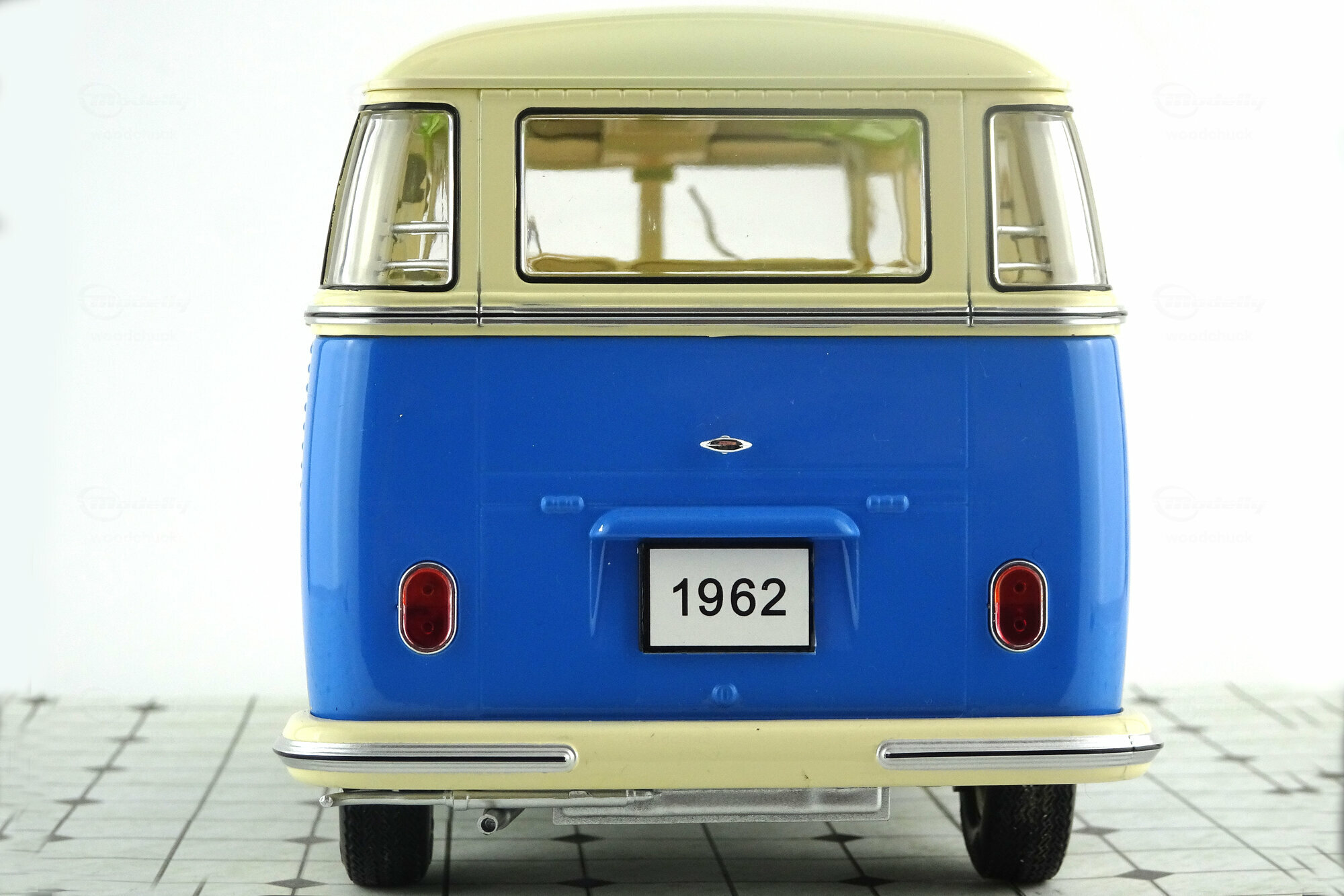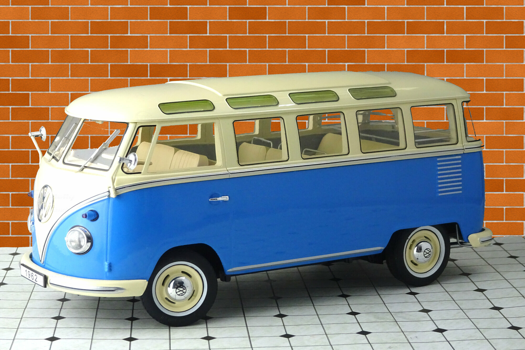 Bei KK-Scale erschien im Januar 2017 ein Modell des T1 Samba in den Zweifarb-Lackierungen Beige/Blau, Weiß/Rot und Rot/Schwarz. Das Modell zeigt eine Version von 1962, erkennbar an dem in diesem Jahr von der Sitzbank getrennten Fahrersitz und den bis 1963 verwendeten kegelförmigen Blinkleuchten. Die Bauweise ist DieCast mit Metallkarosserie jedoch ohne teile zum öffnen. Die äußere Erscheinung ist gut nachgebildet und zeigt sowohl den zusätzliche Chromschmuck, wenn auch teilweise in Silberfarbe, wie die verchromten Radkappen und das Stofffaltdach, welches leider nur als Kunststoffteil ohne jegliche Struktur in das Dach eingesetzt ist. . Die 21 Fenster sind vollständig vorhanden wobei die Dachfenster in grün eingefärbt sind. Der Unterboden ist vollständig strukturiert und zeigt neben den kompletten Achsen, wobei die Vorderachse lenkbar ist, auch die Unterseite des Motors mit der Auspuffanlage. Auch im Innenraum findet man eine schöne Detaillierung. So ist da das durchgehende Armaturenbrett, der abgetrennte Fahrersitz, die strukturieren Seitenverkleidungen, sie Haltegriffe an den Rücksitzen sowie die Koffer-Reling im Gepäckabteil. Der Maßstab wird sehr genau eingehalten. Für den aktuellen Preis von ca. 70 € erhält man hier ein schönes Modell dieses legendären Klassikers.